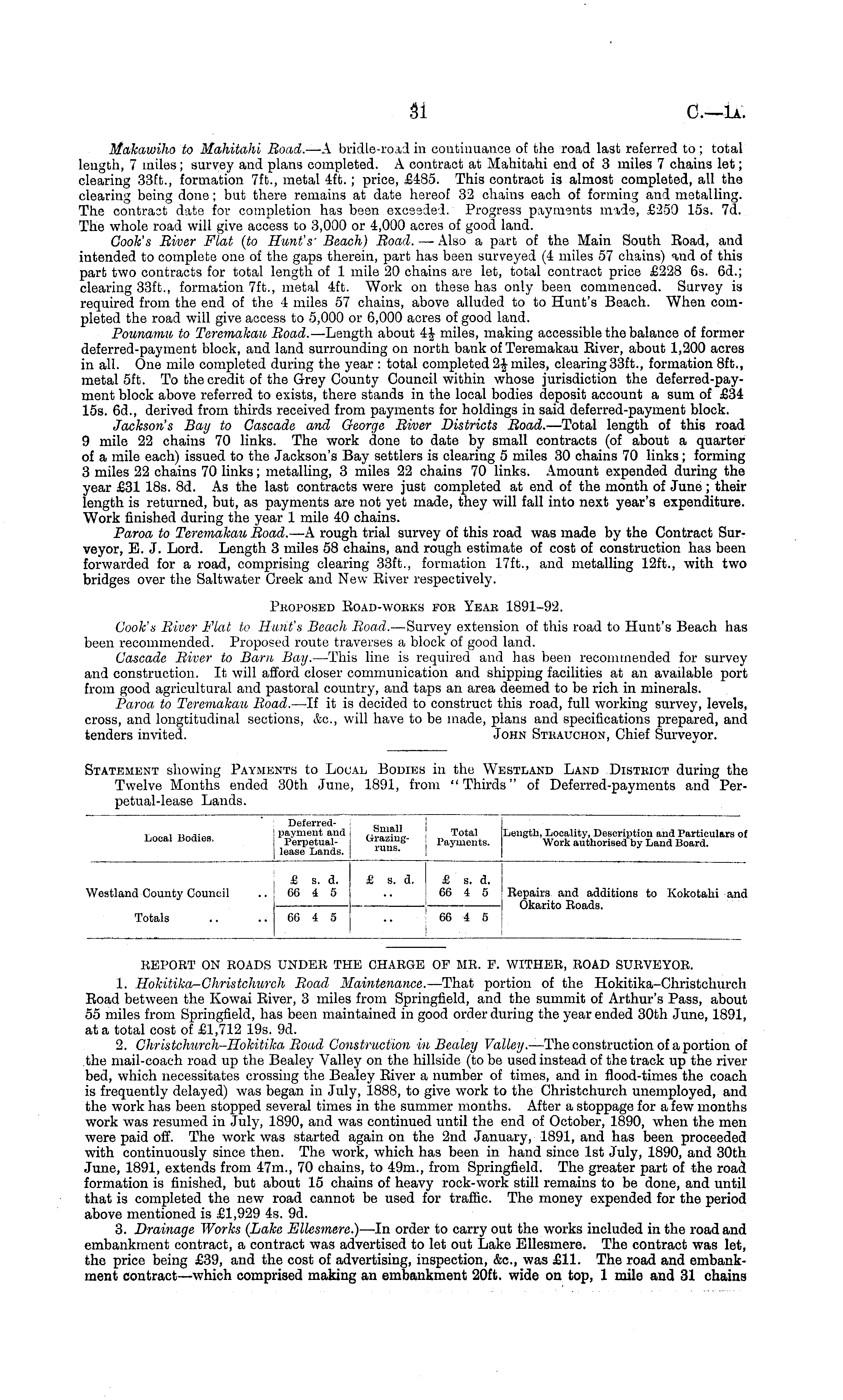 KEPORT ON ROADS UNDER THE CHARGE OF MR. P. WITHER, ROAD SURVEYOR. 1. Hokitika-Ghristchurch Road Maintenance. —That portion of the Hokitika-Christohurch Eoad between the Kowai Eiver, 3 miles from Springfield, and the summit of Arthur's Pass, about 55 miles from Springfield, has been maintained in good order during the year ended 30th June, 1891, at a total cost of £1,712 19s. 9d. 2. Christchurch-Hokitika, Road Construction in Bealey Valley. —The construction of a portion of the mail-coach road up the Bealey Valley on the hillside (to be used instead of the track up the river bed, which necessitates crossing the Bealey Eiver a number of times, and in flood-times the coach is frequently delayed) was began in July, 1888, to give work to the Christchurch unemployed, and the work has been stopped several times in the summer months. After a stoppage for a few months work was resumed in July, 1890, and was continued until the end of October, 1890, when the men were paid off. The work was started again on the 2nd January, 1891, and has been proceeded with continuously since then. The work, which has been in hand since Ist July, 1890, and 30th June, 1891, extends from 47m., 70 chains, to 49m., from Springfield. The greater part of the road formation is finished, but about 15 chains of heavy rock-work still remains to be done, and until that is completed the new road cannot be used for traffic. The money expended for the period above mentioned is £1,929 4s. 9d. 3. Drainage Works (Lake Ellesmere.) —In order to carry out the works included in the road and embankment contract, a contract was advertised to let out Lake Ellesmere. The contract was let, the price being £39, and the cost of advertising, inspection, &c, was £11. The road and embankment contract — which comprised making an embankment 20ft. wide on top, 1 mile and 31 chains