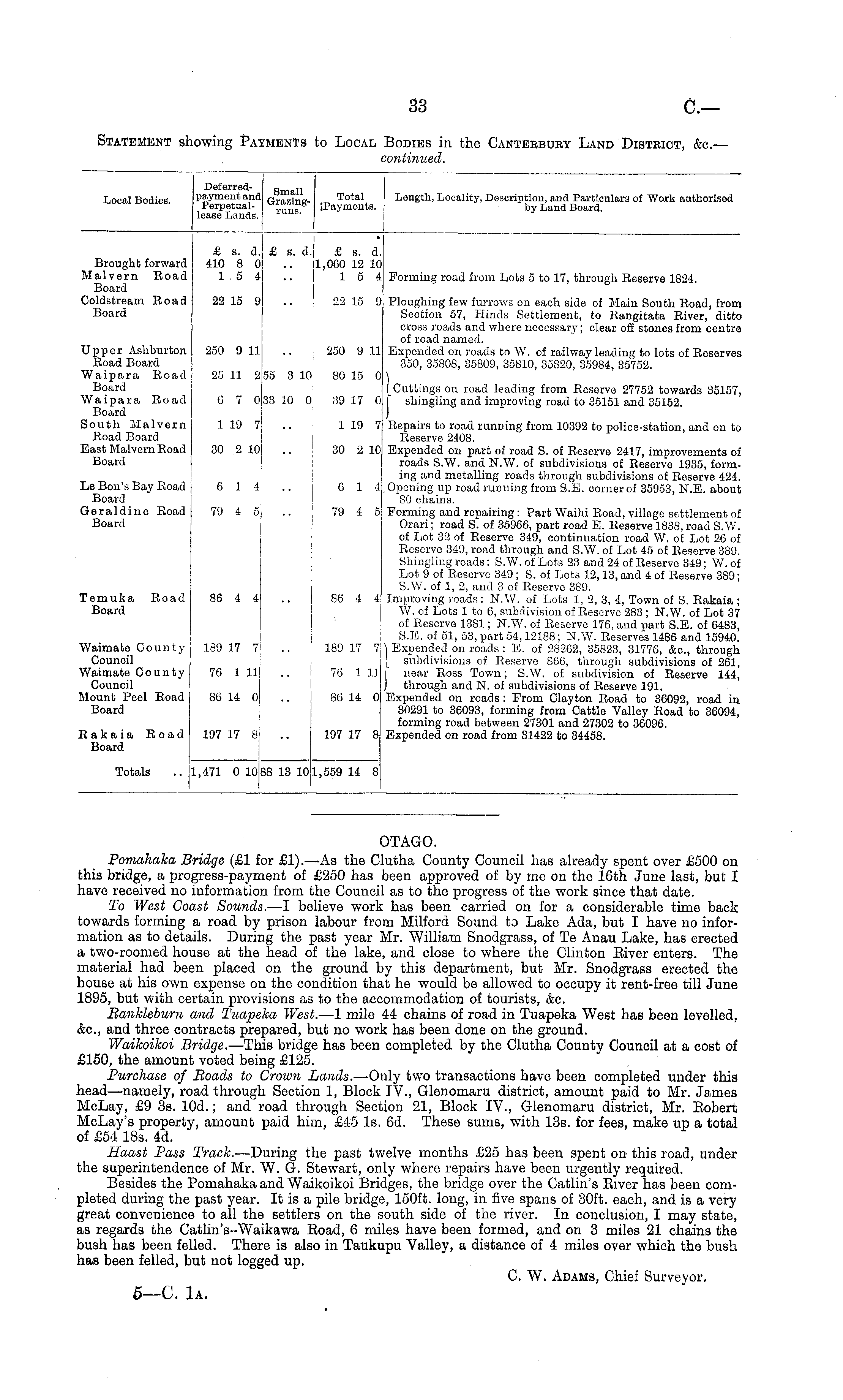 OTAGO. Pomahaka Bridge (£1 for £1). —As the Clutha County Council has already spent over £500 on this bridge, a progress-payment of £250 has been approved of by me on the 16th June last, but I have received no information from the Council as to the progress of the work since that date. To West Coast Sounds. —l believe work has been carried on for a considerable time back towards forming a road by prison labour from Milford Sound to Lake Ada, but I have no information as to details. During the past year Mr. William Snodgrass, of Te Anau Lake, has erected a two-roomed house at the head of the lake, and close to where the Clinton Eiver enters. The material had been placed on the ground by this department, but Mr. Snodgrass erected the house at his own expense on the condition that he would be allowed to occupy it rent-free till June 1895, but with certain provisions as to the accommodation of tourists, &c. Bankleburn and Tuapeka West. —l mile 44 chains of road in Tuapeka West has been levelled, &c, and three contracts prepared, but no work has been done on the ground. Waikoikoi Bridge. —This bridge has been completed by the Clutha County Council at a cost of £150, the amount voted being £125. Purchase of Boads to Crown Lands. —Only two transactions have been completed under this head—namely, road through Section 1, Block IV., Glenomaru district, amount paid to Mr. James McLay, £9 3s. 10d.; and road through Section 21, Block IV., Glenomaru district, Mr. Eobert McLay's property, amount paid him, £-45 Is. 6d. These sums, with 13s. for fees, make up a total of £54 18s. 4d. Haast Pass Track. —During the past twelve months £25 has been spent on this road, under the superintendence of Mr. W. G. Stewart, only where repairs have been urgently required. Besides the Pomahaka and Waikoikoi Bridges, the bridge over the Catlin's Biver has been completed during the past year. It is a pile bridge, 150 ft. long, in five spans of 30ft. each, and is a very great convenience to all the settlers on the south side of the river. In conclusion, I may state, as regards the Catlin's-Waikawa Eoad, 6 miles have been formed, and on 3 miles 21 chains the bush has been felled. There is also in Taukupu Valley, a distance of 4 miles over which the bush has been felled, but not logged up. C. W. Adams, Chief Surveyor.