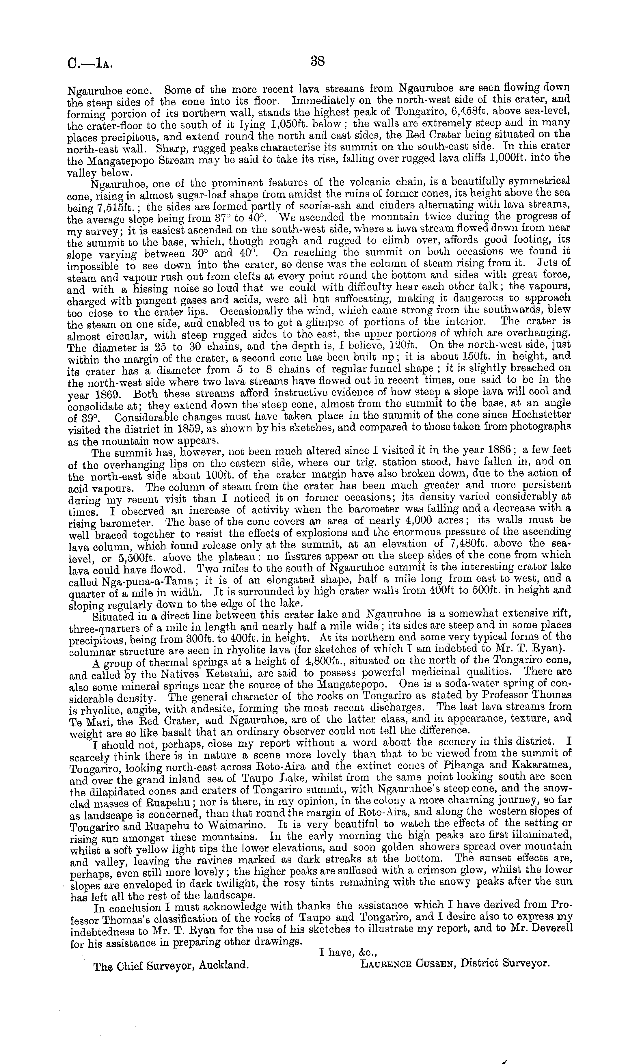 Ngauruhoe cone. Some of the more recent lava streams from Ngauruhoe are seen flowing down the steep sides of the cone into its floor. Immediately on the north-west side of this crater, and forming portion of its northern wall, stands the highest peak of Tongariro, 6,458 ft. above sea-level, the crater-floor to the south of it lying 1,050 ft. below ; the walls are extremely steep and in many places precipitous, and extend round the north and east sides, the Eed Crater being situated on the north-east wall. Sharp, rugged peaks characterise its summit on the south-east side. In this crater the Mangatepopo Stream may be said to take its rise, falling over rugged lava cliffs I,oooft. into the valley below. , . . , -, ,i ■ i Ngauruhoe, one of the prominent features of the volcanic chain, is a beautifully symmetrical cone, rising in almost sugar-loaf shape from amidst the ruins of former cones, its height above the sea being 7,515 ft.; the sides are formed partly of scoriae-ash and cinders alternating with lava streams, the average slope being from 37° to 40°. We ascended the mountain twice during the progress of my survey; it is easiest ascended on the south-west side, where a lava stream flowed down from near the summit to the base, which, though rough and rugged to climb over, affords good footing, its slope varying between 30° and 40°. On reaching the summit on both occasions we found it impossible to see down into the crater, so dense was the column of steam rising from it. Jets of steam and vapour rush out from clefts at every point round the bottom and sides with great force, and with a hissing noise so loud that we could with difficulty hear each other talk; the vapours, charged with pungent gases and acids, were all but suffocating, making it dangerous to approach too close to the crater lips. Occasionally the wind, which came strong from the southwards, blew the steam on one side, and enabled us to get a glimpse of portions of the interior. The crater is almost circular, with steep rugged sides to the east, the upper portions of which are overhanging. The diameter is 25 to 30 chains, and the depth is, I believe, 120 ft. On the north-west side, just within the margin of the crater, a second cone has been built up; it is about 150 ft. in height, and its crater has a diameter from 5 to 8 chains of regular funnel shape ; it is slightly breached on the north-west side where two lava streams have flowed out in recent times, one said to be in the year 1869. Both these streams afford instructive evidence of how steep a slope lava will cool and consolidate at; they extend down the steep cone, almost from the summit to the base, at an angle of 39°. Considerable changes must have taken place in the summit of the cone since Hochstetter visited the district in 1859, as shown by his sketches, and compared to those taken from photographs as the mountain now appears. . . , The summit has, however, not been much altered since I visited it in the year 1886; a few feet of the overhanging lips on the eastern side, where our trig, station stood, have fallen in, and on the north-east side about 100 ft. of the crater margin have also broken down, due to the action of acid vapours. The column of steam from the crater has been much greater and more persistent during my recent visit than I noticed it on former occasions; its density varied considerably at times. I observed an increase of activity when the barometer was falling and a decrease with a rising'barometer. The base of the cone covers an area of nearly 4,000 acres; its walls must be well braced together to resist the effects of explosions and the enormous pressure of the ascending lava column, which found release only at the summit, at an elevation of 7,480 ft. above the sealevel, or 5,500 ft. above the plateau : no fissures appear on the steep sides of the cone from which lava could have flowed. Two miles to the south of Ngauruhoe summit is the interesting crater lake called Nga-puna-a-Tama; it is of an elongated shape, half a mile long from east to west, and a quarter of a mile in width. It is surrounded by high crater walls from 400 ft to 500 ft. in height and sloping regularly down to the edge of the lake. Situated in a direct line between this crater lake and Ngauruhoe is a somewhatextensive rift, three-quarters of a mile in length and nearly half a mile wide ; its sides are steep and in some places precipitous, being from 300 ft. to 400 ft. in height. At its northern end some very typical forms of the columnar structure are seen in rhyolite lava (for sketches of which I am indebted to Mr. T. Eyan). A group of thermal springs at a height of 4,800 ft., situated on the north of the Tongariro cone, and called by the Natives Ketetahi, are said to possess powerful medicinal qualities. There are also some mineral springs near the source of the Mangatepopo. One is a soda-water spring of considerable density. The general character of the rocks on Tongariro as stated by Professor Thomas is rhyolite, augite, with andesite, forming the most recent discharges. The last lava streams from Te Mari, the Bed Crater, and Ngauruhoe, are of the latter class, and in appearance, texture, and weight are so like basalt- that an ordinary observer could not tell the difference. I should not, perhaps, close my report without a word about the scenery in this district. I scarcely think there is in nature a scene more lovely than that to bo viewed from the summit of Tongariro, looking north-east across Boto-Aira and the extinct cones of Pihanga and Kakaramea, and over the grand inland sea of Taupo Lake, whilst from the same point looking south are seen the dilapidated cones and craters of Tongariro summit, with Ngauruhoe's steep cone, and the snowclad masses of Buapehu; nor is there, in my opinion, in the colony a more charming journey, so far as landscape is concerned, than that round the margin of Boto-Aira, and along the western slopes of Tongariro and Buapehu to Wa