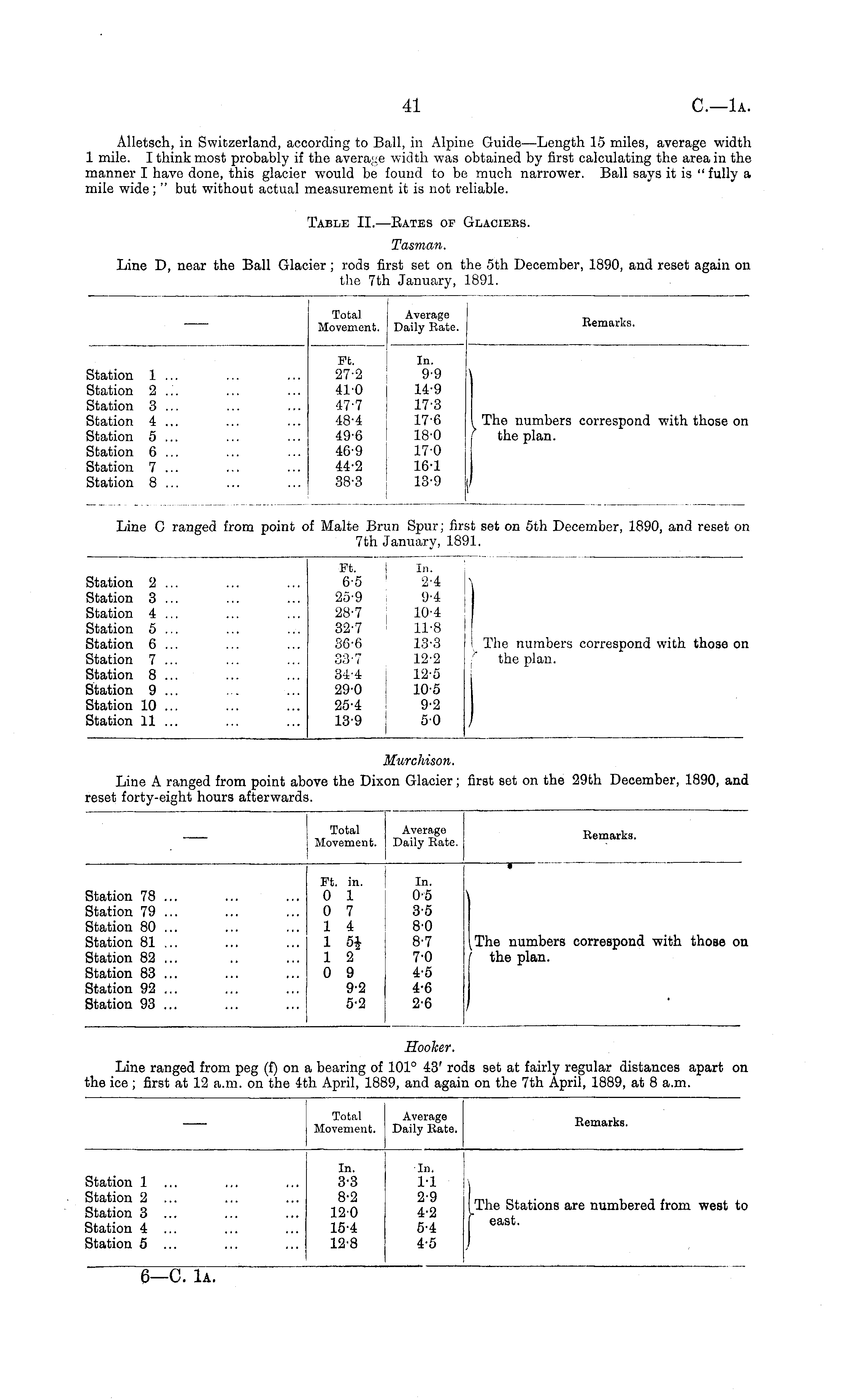Table II.—Rates of Glaciers. Tasman. Line D, near the Ball Glacier; rods first set on the 5th December, 1890, and reset again on the 7th January, 1891.
