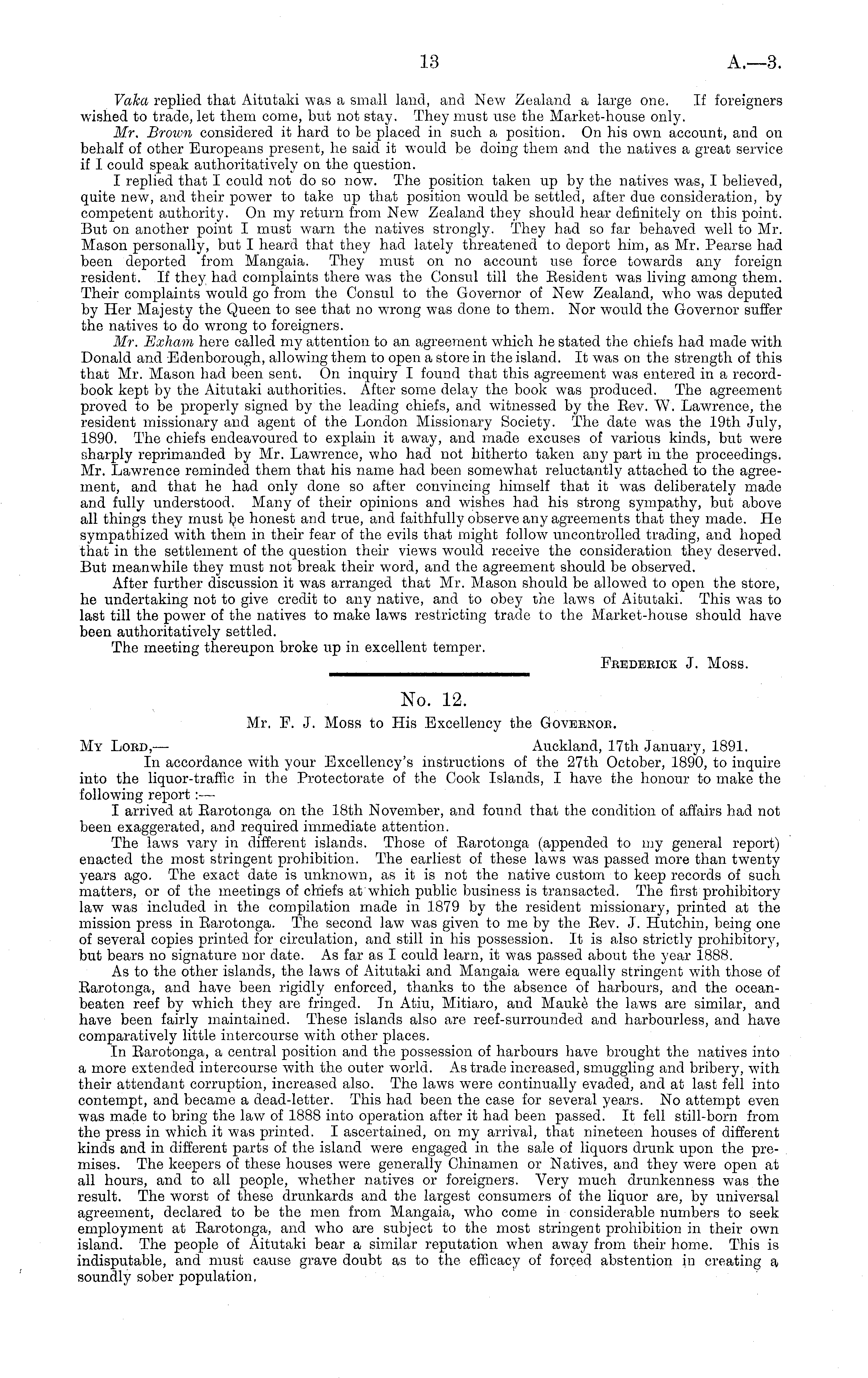 No. 12. Mr. P. J. Moss to His Excellency the Goveenoe. My Loed, — Auckland, 17th January, 1891. In accordance with your Excellency's instructions of the 27th October, 1890, to inquire into the liquor-traffic in the Protectorate of the Cook Islands, I have the honour to make the following report:— I arrived at Earotonga on the 18th November, and found that the condition of affairs had not been exaggerated, and required immediate attention. The laws vary in different islands. Those of Earotonga (appended to my general report) enacted the most stringent prohibition. The earliest of these laws was passed more than twenty years ago. The exact date is unknown, as it is not the native custom to keep records of such matters, or of the meetings of chiefs at which public business is transacted. The first prohibitory law was included in the compilation made in 1879 by the resident missionary, printed at the mission press in Earotonga. The second law was given to me by the Eev. J. Hutchin, being one of several copies printed for circulation, and still in his possession. It is also strictly prohibitory, but bears no signature nor date. As far as I could learn, it was passed about the year 1888. As to the other islands, the laws of Aitutaki and Mangaia were equally stringent with those of Earotonga, and have been rigidly enforced, thanks to the absence of harbours, and the oceanbeaten reef by which they are fringed. In Atiu, Mitiaro, and Mauke the laws are similar, and have been fairly maintained. These islands also are reef-surrounded and harbourless, and have comparatively little intercourse with other places. In Earotonga, a central position and the possession of harbours have brought the natives into a more extended intercourse with the outer world. As trade increased, smuggling and bribery, with their attendant corruption, increased also. The laws were continually evaded, and at last fell into contempt, and became a dead-letter. This had been the case for several years. No attempt even was made to bring the law of 1888 into operation after it had been passed. It fell still-born from the press in which it was printed. I ascertained, on my arrival, that nineteen houses of different kinds and in different parts of the island were engaged in the sale of liquors drunk upon the premises. The keepers of these houses were generally Chinamen or Natives, and they were open at all hours, and to all people, whether natives or foreigners. Very much drunkenness was the result. The worst of these drunkards and the largest consumers of the liquor are, by universal agreement, declared to be the men from Mangaia, who come in considerable numbers to seek employment at Earotonga, and who are subject to the most stringent prohibition in their own island. The people of Aitutaki bear a similar reputation when away from their home. This is indisputable, and must cause grave doubt as to the efficacy of forced abstention in creating a soundly sober population,