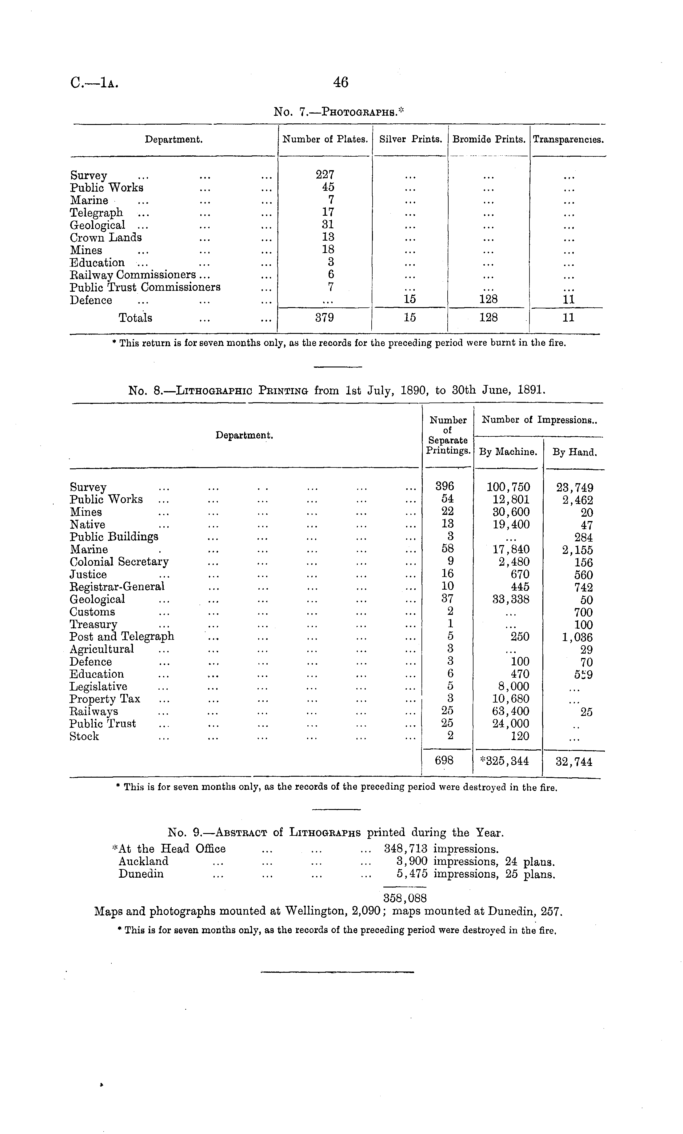 No. 9. —Abstract of Lithographs printed during the Year. *At the Head Office ... ... ... 348,713 impressions. Auckland ... ... ... ... 3,900 impressions, 24 plans. Dunedin ... ... ... ... 5,475 impressions, 25 plans. 358,088 Maps and photographs mounted at Wellington, 2,090; maps mounted at Dunedin, 257.