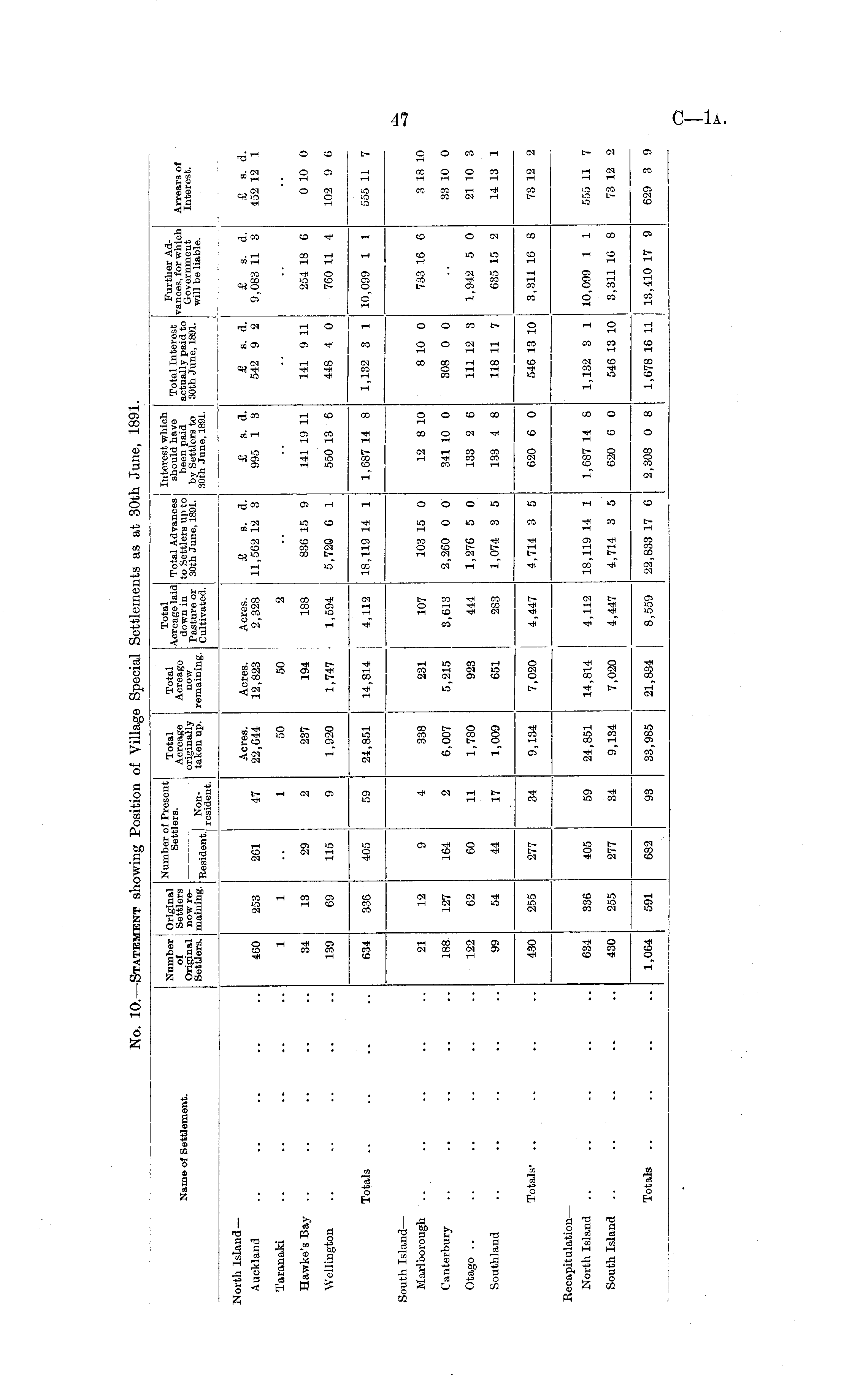 Number of Original Settlers. Original Settlers now remaining. Number of Present Settlers. Total Acreage originally taken up. Total Acreage now remaining. Total Acreage laid down in Pasture or Cultivated. Total Advances to Settlers up to 30th June, 1891. Interest which should have been paid by Settlers to 30th June, 1891. Total Interest actually paid to 30th June, 1891. Further Advances, for which Government will be liable. Name of Settlement. Arrears of Interest. Resident. J^ North Island — £ s. d. 11,562 12 3 £ s. d. 995 1 3 £ s. d. 542 9 2 £ s. d. 9,083 11 3 £ s. d. 452 12 1 Auckland 460 253 261 47 Acres. 22,644 Acres. 12,823 Acres. 2,328 Taranaki 1 1 1 50 50 2 Hawke's Bay 34 13 29 2 237 194 188 836 15 9 141 19 11 141 9 11 254 18 6 0 10 0 Wellington 139 69 115 9 1,920 1,747 1,594 5,720 6 1 550 13 6 448 4 0 760 11 4 102 9 6 Totals 634 336 405 59 24,851 14,814 4,112 18,119 14 1 1,687 14 8 1,132 3 1 10,099 1 1 555 11 7 South Island — Marlborough 733 10 0 3 18 10 21 12 9 4 338 231 107 103 15 0 12 8 10 8 10 0 Canterbury 188 127 164 2 6,007 5,215 3,613 2,260 0 0 341 10 0 308 0 0 33 10 0 Otago .. 122 62 60 11 1,780 923 444 1,276 5 0 133 2 6 111 12 3 1,942 5 0 21 10 3 Southland 99 54 44 17 1,009 651 283 1,074 3 5 133 4 8 118 11 7 635 15 2 14 13 1 Totals430 255 277 34 9,134 7,020 4,447 4,714 3 5 620 6 0 546 13 10 3,311 16 8 73 12 2 Recapitulation — North Island 634 555 11 7 336 405 59 24,851 14,814 4,112 18,119 14 1 1,687 14 S 1,132 3 1 10,099 1 1 South Island 430 255 277 34 9,134 7,020 4,447 4,714 3 5 620 6 0 546 13 10 3,311 16 8 73 12 2 Totals 2,308 0 8 629 3 9 1,064 591 682 93 33,985 21,834 8,559 22,833 17 6 1,678 16 11 13,410 17 9