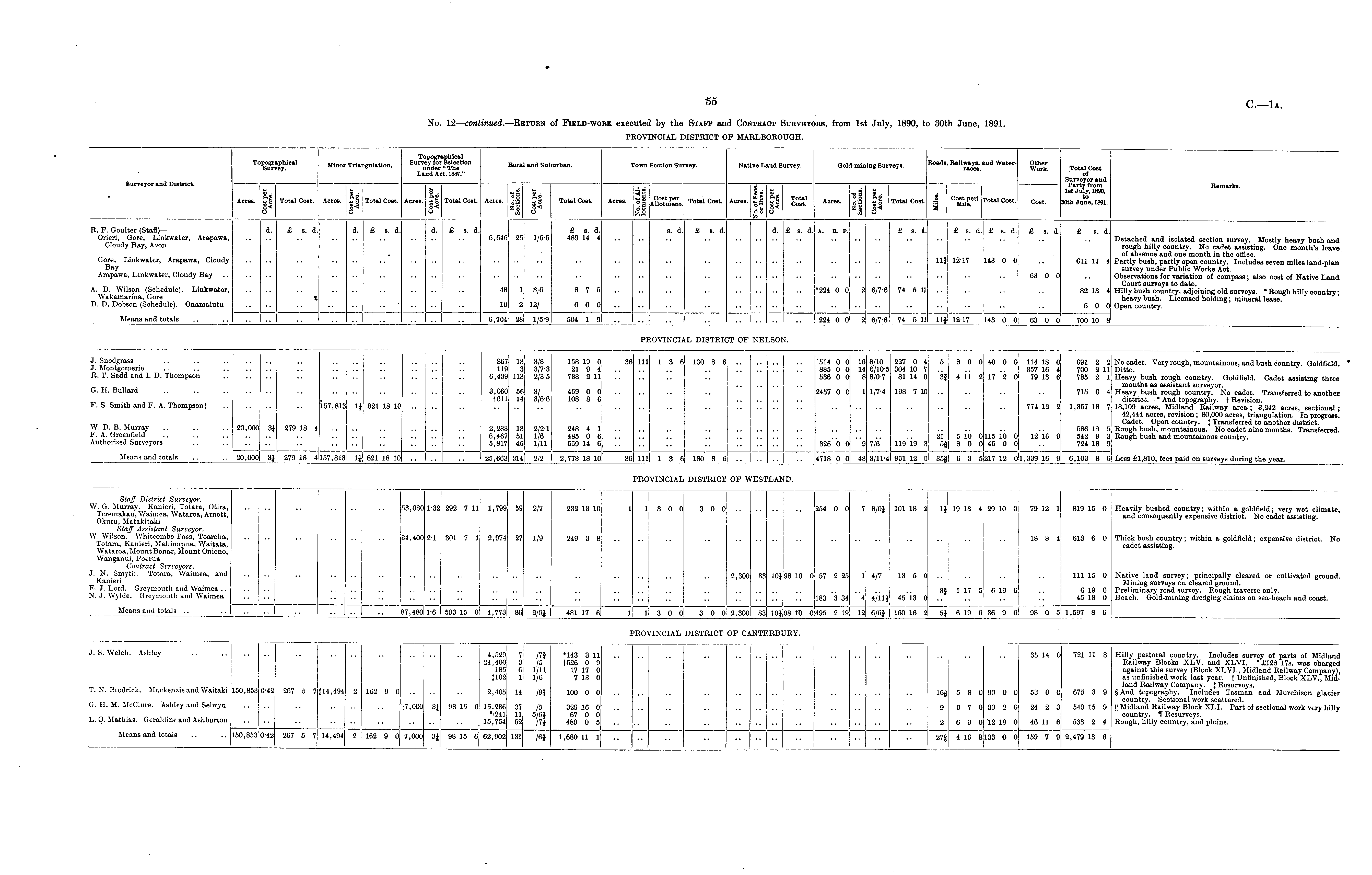 No. 12— continued. —Return of Field-work executed by the Staff and Contract Surveyors, from Ist July, 1890, to 30th June, 1891. PROVINCIAL DISTRICT OF MARLBOROUGH.