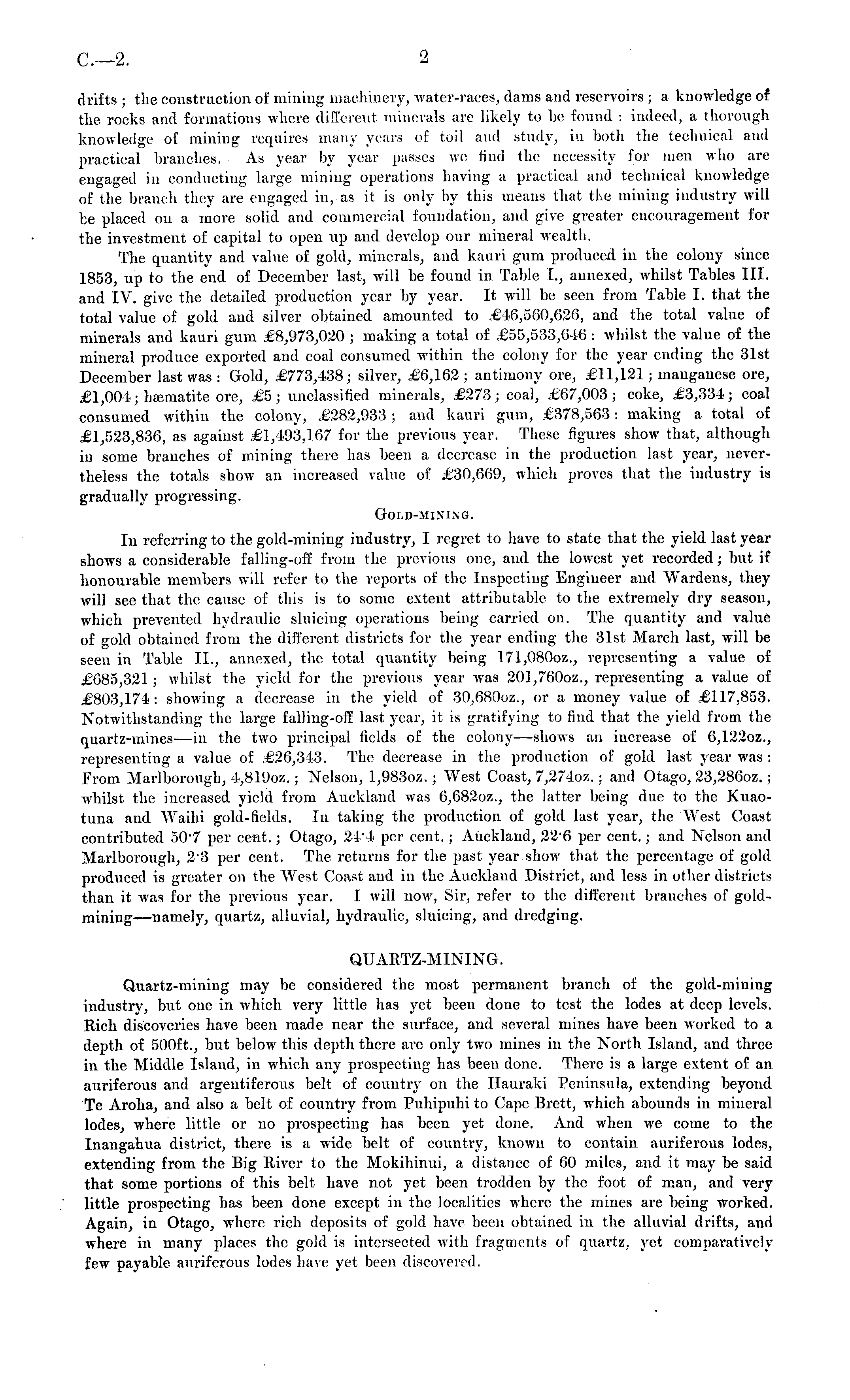 drifts ; the construction of mining machinery, water-races, dams and reservoirs ; a knowledge of the rocks and formations where different minerals are likely to be found : indeed, a thorough knowledge of mining requires many years of toil and study, in both the technical and practical branches. As year by year passes we find the necessity for men who are engaged in conducting large mining operations having a practical and technical knowledge of the branch they are engaged in, as it is only by this means that the mining industry will be placed ou a more solid and commercial foundation, and give greater encouragement for the investment of capital to open up and develop our mineral wealth. The quantity and value of gold, minerals, and kauri gum produced in the colony since 1853, up to the end of December last, will be found in Table 1., annexed, whilst Tables 111. and IV. give the detailed production year by year. It will be seen from Table I. that the total value of gold and silver obtained amounted to €46,560,626, and the total value of minerals and kauri gum £8,973,020 ; making a total of .€55,533,646 : whilst the value of the mineral produce exported and coal consumed within the colony for the year ending the 31st December last was : Gold, €773,438; silver, €6,162 ; antimony ore, €11,121; manganese ore, €1,004; haematite ore, €5; unclassified minerals, €273; coal, €67,003; coke, €3,334; coal consumed within the colony, €282,933; and kauri gum, €378,563: making a total of €1,523,836, as against €1,493,167 for the previous year. These figures show that, although in some branches of mining there has been a decrease in the production last year, nevertheless the totals show an increased value of €30,669, which proves that the industry is gradually progressing. GrOLD-MIN'ING. In referring to the gold-mining industry, I regret to have to state that the yield last year shows a considerable falling-off from the previous one, and the lowest yet recorded; but if honourable members will refer to the reports of the Inspecting Engineer and Wardens, they will see that the cause of this is to some extent attributable to the extremely dry season, which prevented hydraulic sluicing operations being carried on. The quantity and value of gold obtained from the different districts for the year ending the 31st March last, will be seen in Table 11., annexed, the total quantity being 171,0800z., representing a value of €685,321 ; whilst the yield for the previous year was 201,7600z., representing a value of €803,174 : showing a decrease in the yield of 3(),6800z., or a money value of €117,853. Notwithstanding the large falling-off last year, it is gratifying to find that the yield from the quartz-mines —in the two principal fields of the colony—shows an increase of 6,1220z., representing a value of €26,343. The decrease in the production of gold last year was : From Marlborough, 4,8190z.; Nelson, 1,9830z.; West Coast, 7,2740z.; arid Otago, 23,2860z.; whilst the increased yield from Auckland was 6,6820z., the latter being due to the Kuaotuna and Waihi gold-fields. In taking the production of gold last year, the West Coast contributed 50 - 7 per cent.; Otago, 24 - 4 per cent.; Auckland, 226 per cent.; and Nelson and Marlborough, 23 per cent. The returns for the past year show that the percentage of gold produced is greater on the West Coast and in the Auckland District, and less in other districts than it was for the previous year. I will now, Sir, refer to the different branches of goldmining—namely, quartz, alluvial, hydraulic, sluicing, and dredging. QUARTZ-MINING. Quartz-mining may be considered the most permanent branch of the gold-mining industry, but one in which very little has yet been done to test the lodes at deep levels. Rich discoveries have been made near the surface, and several mines have been worked to a depth of 500 ft., but below this depth there arc only two mines in the North Island, and three in the Middle Island, in which any prospecting has been done. There is a large extent of an auriferous and argentiferous belt of country on the Ilauraki Peninsula, extending beyond Te Aroha, and also a belt of country from Puhipuhi to Cape Brett, which abounds in mineral lodes, where little or no prospecting has been yet done. And when we come to the Inangahua district, there is a wide belt of country, known to contain auriferous lodes, extending from the Big River to the Mokihinui, a distance of 60 miles, and it may be said that some portions of this belt have not yet been trodden by the foot of man, and very little prospecting has been done except in the localities where the mines arc being worked. Again, in Otago, where rich deposits of gold have been obtained in the alluvial drifts, and where in many places the gold is intersected with fragments of quartz, yet comparatively few payable auriferous lodes have yet been discovered.