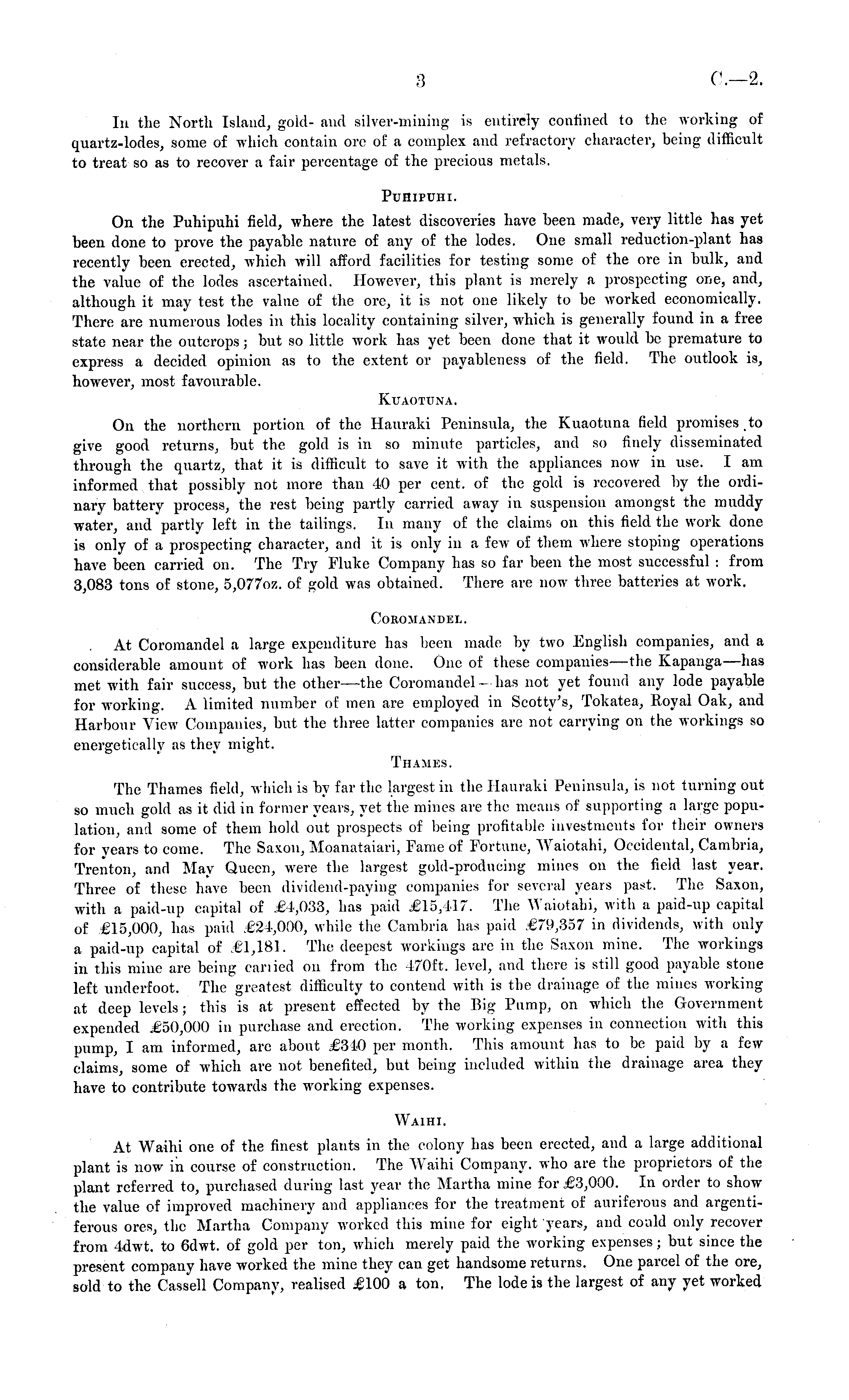 In the North Island, gold- and silver-mining is entirely confined to the working of quartz-lodes, some of which contain ore of a complex and refractory character, being difficult to treat so as to recover a fair percentage of the precious metals. Puhipuhi. On the Puhipuhi field, where the latest discoveries have been made, very little has yet been done to prove the payable nature of any of the lodes. One small reduction-plant has recently been erected, which will afford facilities for testing some of the ore in bulk, and the value of the lodes ascertained. However, this plant is merely a prospecting one, and, although it may test the value of the ore, it is not one likely to be worked economically. There are numerous lodes in this locality containing silver, which is generally found in a free state near the outcrops; but so little work has yet been done that it would be premature to express a decided opinion as to the extent or payableness of the field. The outlook is, however, most favourable. Kuaotuna. On the northern portion of the Hauraki Peninsula, the Kuaotuna field promises .to give good returns, but the gold is in so minute particles, and so finely disseminated through the quartz, that it is difficult to save it with the appliances now in use. I am informed that possibly not more than 40 per cent, of the gold is recovered by the ordinary battery process, the rest being partly carried away in suspension amongst the muddy water, and partly left in the tailings. In many of the claims on this field the work done is only of a prospecting character, and it is only in a few of them where stoping operations have been carried on. The Try Fluke Company has so far been the most successful : from 3,083 tons of stone, 5,0770z. of gold was obtained. There are now three batteries at work. Coromandee. At Coromandel a large expenditure has been made by two English companies, and a considerable amount of work has been done. One of these companies—the Kapanga—has met with fair success, but the other —the Coromandel- has not yet found any lode payable for working. A limited number of men are employed in Scotty's, Tokatea, Royal Oak, and Harbour View Companies, but the three latter companies are not carrying on the workings so energetically as they might. Thames. The Thames field, which is by far the largest in the Hauraki Peninsula, is not turning out so much gold as it did in former years, yet the mines are the means of supporting a large population, and some of them hold out prospects of being profitable investments for their owners for years to come. The Saxon, Moanataiari, Fame of Fortune, Waiotahi, Occidental, Cambria, Trenton, and May Queen, were the largest gold-producing mines ou the field last year. Three of these have been dividend-paying companies for several years past. The Saxon, with a paid-up capital of €4,033, has paid €15,417. The Waiotahi, with a paid-up capital of €15,000, has paid €24,000, while the Cambria has paid €79,357 in dividends, with only a paid-up capital of €1,181. The deepest workings are in the Saxon mine. The workings in this mine are being cariied on from the 470 ft. level, and there is still good payable stone left underfoot. The greatest difficulty to contend with is the drainage of the mines working at deep levels; this is at present effected by the Big Pump, on which the Government expended €50,000 in purchase and erection. The working expenses in connection with this pump, lam informed, are about €340 per month. This amount has to be paid by a few claims, some of which are not benefited, but being included within the drainage area they have to contribute towards the working expenses. Waihi. At Waihi one of the finest plants in the colony has been erected, and a large additional plant is now in course of construction. The Waihi Company, who are the proprietors of the plant referred to, purchased during last year the Martha mine for €3,000. In order to show the value of improved machinery and appliances for the treatment of auriferous and argentiferous ores, the Martha Company worked this mine for eight years, and could only recover from ldwt. to 6dwt. of gold per ton, which merely paid the working expenses; but since the present company have worked the mine they can get handsome returns. One parcel of the ore, sold to the Cassell Company, realised £100 a ton. The lode is the largest of any yet worked