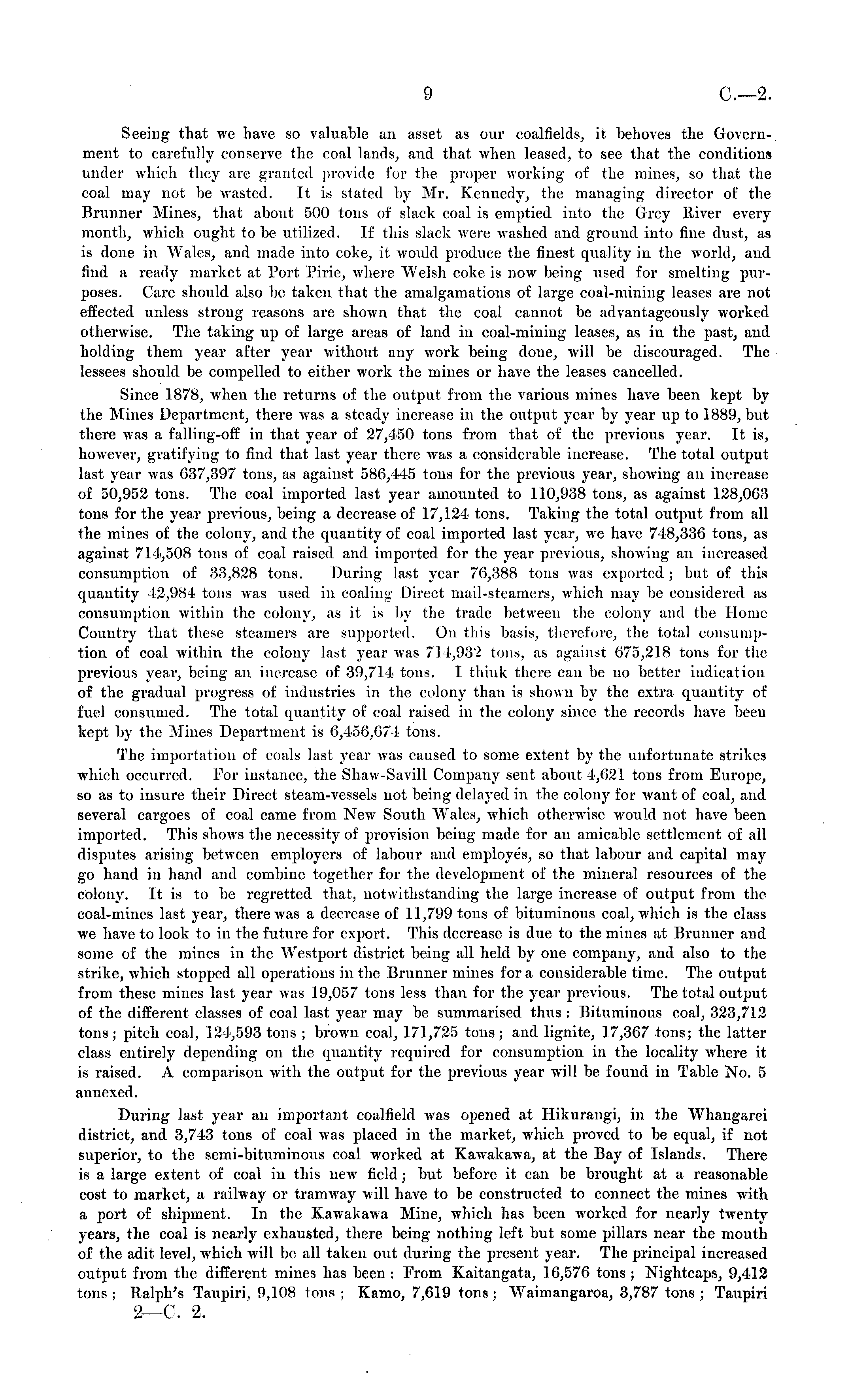 Seeing that we have so valuable an asset as our coalfields, it behoves the Government to carefully conserve the coal lands, and that when leased, to see that the conditions under which they are granted provide for the proper working of the mines, so that the coal may not be wasted. It is stated by Mr. Kennedy, the managing director of the Brunner Mines, that about 500 tons of slack coal is emptied into the Grey River every month, which ought to be utilized. If this slack were washed and ground into fine dust, as is done in Wales, and made into coke, it would produce the finest quality in the world, and find a ready market at Port Pirie, where Welsh coke is now being used for smelting purposes. Care should also be taken that the amalgamations of large coal-mining leases are not effected unless strong reasons are shown that the coal cannot be advantageously worked otherwise. The taking up of large areas of land in coal-mining leases, as in the past, and holding them year after year without any work being done, will be discouraged. The lessees should be compelled to either work the mines or have the leases cancelled. Since 1878, when the returns of the output from the various mines have been kept by the Mines Department, there was a steady increase in the output year by year up to 1889, but there was a falling-off in that year of 27,450 tons from that of the previous year. It is, however, gratifying to find that last year there was a considerable increase. The total output last year was 637,397 tons, as against 586,445 tons for the previous year, showing an increase of 50,952 tons. The coal imported last year amounted to 110,938 tons, as against 128,063 tons for the year previous, being a decrease of 17,124 tons. Taking the total output from all the mines of the colony, and the quantity of coal imported last year, w r e have 748,336 tons, as against 714,508 tons of coal raised and imported for the year previous, showing an increased consumption of 33,828 tons. During last year 76,388 tons was exported; but of this quantity 4-2,984 tons was used in coaling Direct mail-steamers, which may be considered as consumption within the colony, as it is by the trade between the colony and the Home Country that these steamers are supported. On this basis, therefore, the total consumption of coal within the colony last year was 714,932 tons, as against 675,218 tons for the previous year, being an increase of 39,714 tons. I think there can be no better indication of the gradual progress of industries in the colony than is shown by the extra quantity of fuel consumed. The total quantity of coal raised in the colony since the records have been kept by the Mines Department is 6,456,674 tons. The importation of coals last year was caused to some extent by the unfortunate strikes which occurred. For instance, the Shaw-Savill Company sent about 4,621 tons from Europe, so as to insure their Direct steam-vessels not being delayed in the colony for want of coal, and several cai'goes of coal came from New South Wales, which otherwise would not have been imported. This shows the necessity of provision being made for an amicable settlement of all disputes arising between employers of labour and employes, so that labour and capital may go hand in hand and combine together for the development of the mineral resources of the colony. It is to be regretted that, notwithstanding the large increase of output from the coal-mines last year, there was a decrease of 11,799 tons of bituminous coal, which is the class we have to look to in the future for export. This decrease is due to the mines at Brunner and some of the mines in the Westport district being all held by one company, and also to the strike, which stopped all operations in the Brunner mines for a considerable time. The output from these mines last year was 19,057 tons less than for the year previous. The total output of the different classes of coal last year may be summarised thus : Bituminous coal, 323,712 tons; pitch coal, 124,593 tons ; brown coal, 171,725 tons; and lignite, 17,367 tons; the latter class entirely depending on the quantity required for consumption in the locality where it is raised. A comparison with the output for the previous year will be found in Table No. 5 annexed. During last year an important coalfield was opened at Hikurangi, in the Whangarei district, and 3,743 tons of coal was placed in the market, which proved to be equal, if not superior, to the semi-bituminous coal worked at Kawakawa, at the Bay of Islands. There is a large extent of coal in this new field; but before it can be brought at a reasonable cost to market, a railway or tramway will have to be constructed to connect the mines with a port of shipment. In the Kawakawa Mine, which lias been worked for nearly twenty years, the coal is nearly exhausted, there being nothing left but some pillars near the mouth of the adit level, which will be all taken out during the present year. The principal increased output from the different mines has been : From Kaitangata, 16,576 tons ; Nightcaps, 9,412 tons; Ralph's Taupiri, 9,108 tons; Kamo, 7,619 tons ; Waimangaroa, 3,787 tons ; Taupiri