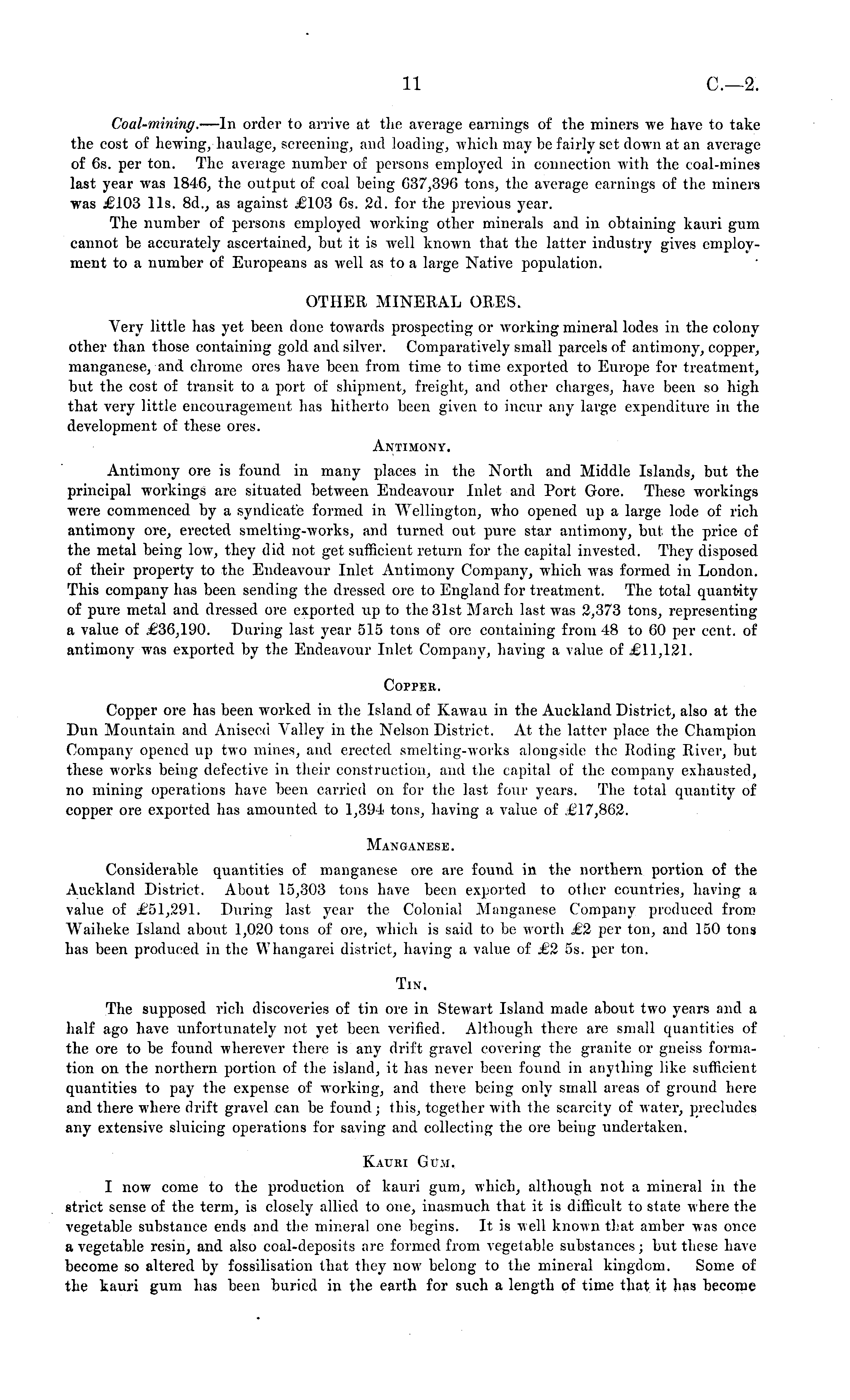 Coal-mining. —ln order to arrive at the average earnings of the miners we have to take the cost of hewing, haulage, screening, and loading, which may be fairly set down at an average of 6s. per ton. The average number of persons employed in connection with the coal-mines last year was 1846, the output of coal being 637,396 tons, the average earnings of the miners was £103 lis. Bd., as against £103 6s. 2d. for the previous year. The number of persons employed working other minerals and in obtaining kauri gum cannot be accurately ascertained, but it is well known that the latter industry gives employment to a number of Europeans as well as to a large Native population. OTHER MINERAL ORES. Very little has yet been done towards prospecting or working mineral lodes in the colony other than those containing gold and silver. Comparatively small parcels of antimony, copper, manganese, and chrome ores have been from time to time exported to Europe for treatment, but the cost of transit to a port of shipment, freight, and other charges, have been so high that very little encouragement has hitherto been given to incur any large expenditure in the development of these ores. Antimony. Antimony ore is found in many places in the North and Middle Islands, but the principal workings are situated between Endeavour Inlet and Port Gore. These workings were commenced by a syndicate formed in Wellington, who opened up a large lode of rich antimony ore, erected smelting-works, and turned out pure star antimony, but the price of the metal being low, they did not get sufficient return for the capital invested. They disposed of their property to the Endeavour Inlet Antimony Company, which was formed in London. This company has been sending the dressed ore to England for treatment. The total quantity of pure metal and dressed ore exported up to the 31st March last was 2,373 tons, representing a value of £36,190. During last year 515 tons of ore containing from 48 to 60 per cent, of antimony was exported by the Endeavour Inlet Company, having a value of £11,121. Copper. Copper ore has been worked in the Island of Kawau in the Auckland District, also at the Dun Mountain and Aniseed Valley in the Nelson District. At the latter place the Champion Company opened up two mines, and erected smelting-works alongside the Roding River, but these works being defective in their construction, and the capital of the company exhausted, no mining operations have been carried on for the last four years. The total quantity of copper ore exported has amounted to 1,394 tons, having a value of €17,862. Manganese. Considerable quantities of manganese ore are found in the northern portion of the Auckland District. About 15,303 tons have been exported to other countries, having a value of €51,291. During last year the Colonial Manganese Company produced from Waiheke Island about 1,020 tons of ore, which is said to be worth €2 per ton, and 150 tons has been produced in the VVhangarei district, having a value of €2 ss. per ton. Tin. The supposed rich discoveries of tin ore in Stewart Island made about two years and a half ago have unfortunately not yet been verified. Although there arc small quantities of the ore to be found wherever there is any drift gravel covering the granite or gneiss formation on the northern portion of the island, it has never been found in anything like sufficient quantities to pay the expense of working, and there being only small areas of ground here and there where drift gravel can be found; this, together with the scarcity of water, precludes any extensive sluicing operations for saving and collecting the ore being undertaken. Kauri Gu.m. I now come to the production of kauri gum, which, although not a mineral in the strict sense of the term, is closely allied to one, inasmuch that it is difficult to state where the vegetable substance ends and the mineral one begins. It is well known that amber was once a vegetable resin, and also coal-deposits are formed from vegetable substances; but these have become so altered by fossilisation that they now belong to the mineral kingdom. Some of the kauri gum has been buried in the earth for such a length of time that it has become