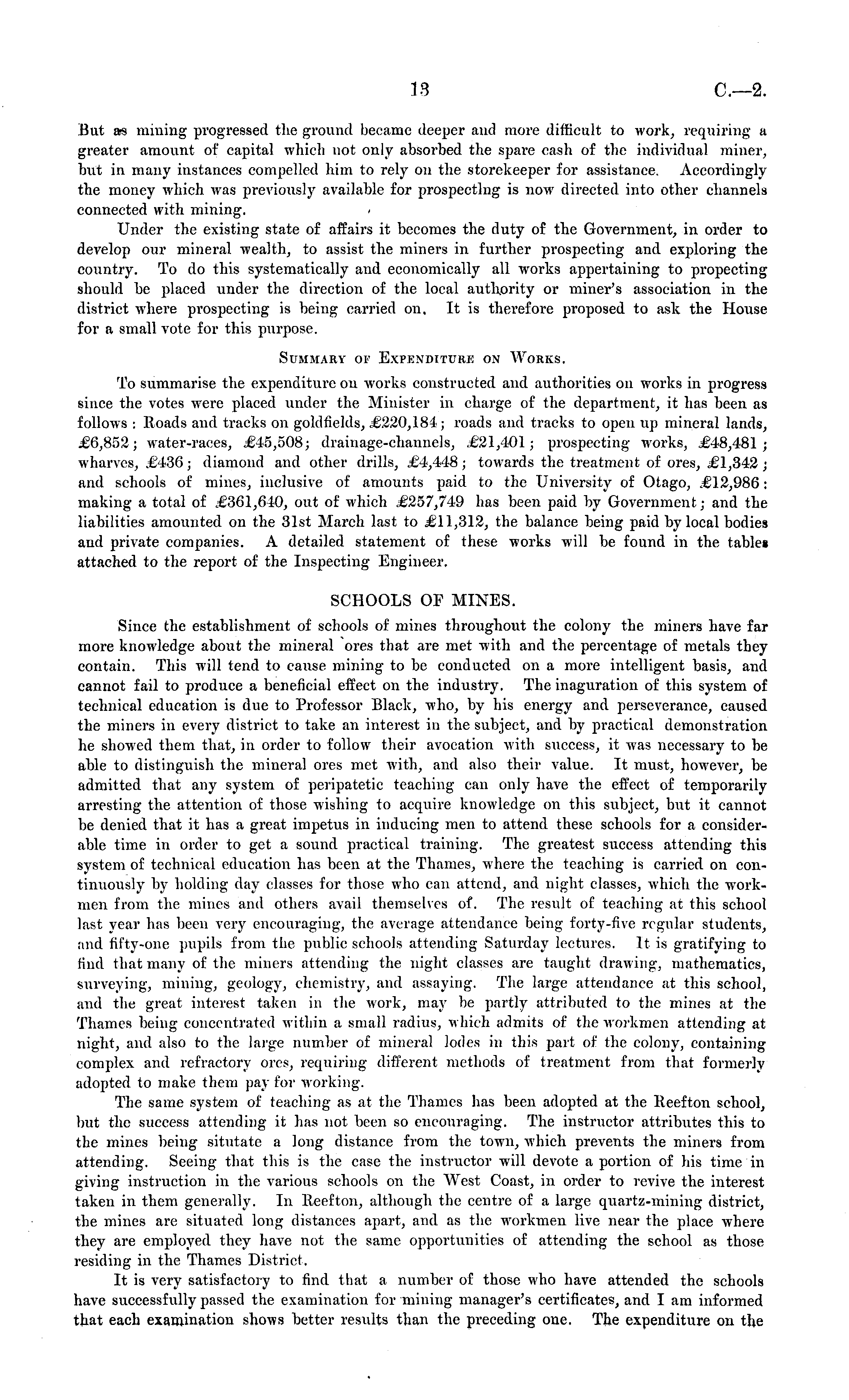 But as mining progressed the ground became deeper and more difficult to work, requiring a greater amount of capital which not only absorbed the spare cash of the individual miner, but in many instances compelled him to rely on the storekeeper for assistance. Accordingly the money which was previously available for prospecting is now directed into other channels connected with mining. ■ Under the existing state of affairs it becomes the duty of the Government, in order to develop our mineral wealth, to assist the miners in further prospecting and exploring the country. To do this systematically and economically all works appertaining to propecting should be placed under the direction of the local authority or miner's association in the district where prospecting is being carried on. It is therefore proposed to ask the House for a small vote for this purpose. Summary of Expenditure on Works. To summarise the expenditure on works constructed and authorities on works in progress since the votes were placed under the Minister in charge of the department, it has been as follows : Roads and tracks on goldfields, €220,184; roads and tracks to open up mineral lands, €6,852; water-races, €45,508; drainage-channels, £21,401; prospecting works, £48,481; wharves, £436; diamond and other drills, €4,448; towards the treatment of ores, £1,342 ; and schools of mines, inclusive of amounts paid to the University of Otago, €12,986: making a total of £361,640, out of which £257,749 has been paid by Government; and the liabilities amounted on the 31st March last to £11,312, the balance being paid by local bodies and private companies. A detailed statement of these works will be found in the tables attached to the report of the Inspecting Engineer. SCHOOLS OF MINES. Since the establishment of schools of mines throughout the colony the miners have far more knowledge about the mineral ores that are met with and the percentage of metals they contain. This will tend to cause mining to be conducted on a more intelligent basis, and cannot fail to produce a beneficial effect on the industry. The inaguration of this system of technical education is due to Professor Black, who, by his energy and perseverance, caused the miners in every district to take an interest in the subject, and by practical demonstration he showed them that, in order to follow their avocation with success, it was necessary to be able to distinguish the mineral ores met with, and also their value. It must, however, be admitted that any system of peripatetic teaching can only have the effect of temporarily arresting the attention of those wishing to acquire knowledge on this subject, but it cannot be denied that it has a great impetus in inducing men to attend these schools for a considerable time in order to get a sound practical training. The greatest success attending this system of technical education has been at the Thames, where the teaching is carried on continuously by holding day classes for those who can attend, and night classes, which the workmen from the mines and others avail themselves of. The result of teaching at this school last year has been very encouraging, the average attendance being forty-five regular students, and fifty-one pupils from the public schools attending Saturday lectures. It is gratifying to find that many of the miners attending the night classes are taught drawing, mathematics, surveying, mining, geology, chemistry, and assaying. The large attendance at this school, and the great interest taken in the work, may be partly attributed to the mines at the Thames being concentrated within a small radius, which admits of the workmen attending at night, and also to the large number of mineral lodes in this part of the colony, containing complex and refractory ores, requiring different methods of treatment from that formerly adopted to make them pay for working. The same system of teaching as at the Thames has been adopted at the Reefton school, but the success attending it has not been so encouraging. The instructor attributes this to the mines being situtatc a long distance from the town, which prevents the miners from attending. Seeing that this is the case the instructor will devote a portion of his time in giving instruction in the various schools on the West Coast, in order to revive the interest taken in them generally. In Reefton, although the centre of a large quartz-mining district, the mines are situated long distances apart, and as the workmen live near the place where they are employed they have not the same opportunities of attending the school as those residing in the Thames District. It is very satisfactory to find that a number of those who have attended the schools have successfully passed the examination for mining manager's certificates, and I am informed that each examination shows better results than the preceding one. The expenditure on the