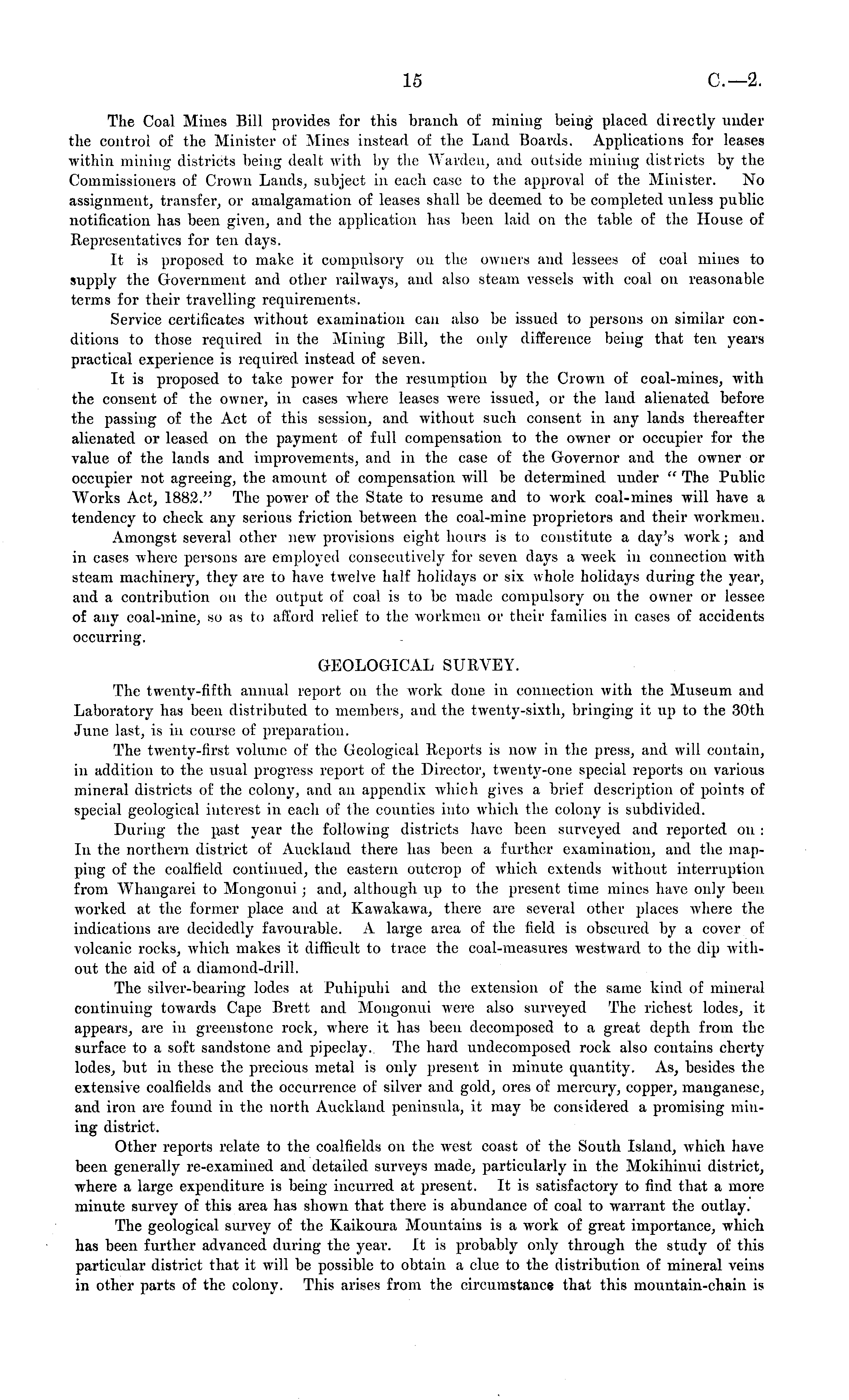 The Coal Mines Bill provides for this branch of mining being placed directly under the control of the Minister of Mines instead of the Laud Boards. Applications for leases within mining districts being dealt with by the Warden, and outside mining districts by the Commissioners of Crown Lands, subject in each case to the approval of the Minister. No assignment, transfer, or amalgamation of leases shall be deemed to be completed unless public notification has been given, and the application has been laid on the table of the House of Representatives for ten days. It is proposed to make it compulsory on the owners and lessees of coal mines to supply the Government and other railways, and also steam vessels with coal on reasonable terms for their travelling requirements. Service certificates without examination can also be issued to persons on similar conditions to those required in the Mining Bill, the only difference being that ten years practical experience is required instead of seven. It is proposed to take power for the resumption by the Crown of coal-mines, with the consent of the owner, in cases where leases were issued, or the laud alienated before the passing of the Act of this session, and without such consent in any lands thereafter alienated or leased on the payment of full compensation to the owner or occupier for the value of the lands and improvements, and in the case of the Governor and the owner or occupier not agreeing, the amount of compensation will be determined under " The Public Works Act, 1882." The power of the State to resume and to work coal-mines will have a tendency to check any serious friction between the coal-mine proprietors and their workmen. Amongst several other new provisions eight hours is to constitute a day's work; and in cases where persons are employed consecutively for seven clays a week in connection with steam machinery, they are to have twelve half holidays or six whole holidays during the year, and a contribution on the output of coal is to be made compulsory on the owner or lessee of any coal-mine, so as to afford relief to the workmen or their families in cases of accidents occurring. GEOLOGICAL SURVEY. The tw r enty-fifth annual report ou the work done in connection with the Museum and Laboratory has been distributed to members, aud the twenty-sixth, bringing it up to the 30th June last, is in course of preparation. The twenty-first volume of the Geological Reports is now in the press, and will contain, in addition to the usual progress report of the Director, twentjr-one special reports on various mineral districts of the colony, and an appendix which gives a brief description of points of special geological interest in each of the counties into which the colony is subdivided. During the past year the following districts have been surveyed and reported on : In the northern district of Auckland there has been a further examination, and the mapping of the coalfield continued, the eastern outcrop of which extends without interruption from Whangarei to Mongonui; and, although up to the present time mines have only been worked at the former place and at Kawakawa, there are several other places where the indications are decidedly favourable. A large area of the field is obscured by a cover of volcanic rocks, which makes it difficult to trace the coal-measures westward to the clip without the aid of a diamond-drill. The silver-bearing lodes at Puhipuhi and the extension of the same kind of mineral continuing towards Cape Brett and Mongonui were also surveyed The richest lodes, it appears, are in greenstone rock, where it has been decomposed to a great depth from the surface to a soft sandstone and pipeclay. The hard undecomposed rock also contains cherty lodes, but in these the precious metal is only present in minute quantity. As, besides the extensive coalfields and the occurrence of silver and gold, ores of mercury, copper, manganese, and iron are found in the north Auckland peninsula, it may be considered a promising mining district. Other reports relate to the coalfields on the west coast of the South Island, which have been generally re-examined and detailed surveys made, particularly in the Mokihinui district, where a large expenditure is being incurred at present. It is satisfactory to find that a more minute survey of this area has shown that there is abundance of coal to warrant the outlay. The geological survey of the Kaikoura Mountains is a work of great importance, which has been further advanced during the year. It is probably only through the study of this particrdar district that it will be possible to obtain a clue to the distribution of mineral veins in other parts of the colony. This arises from the circumstance that this mountain-chain is