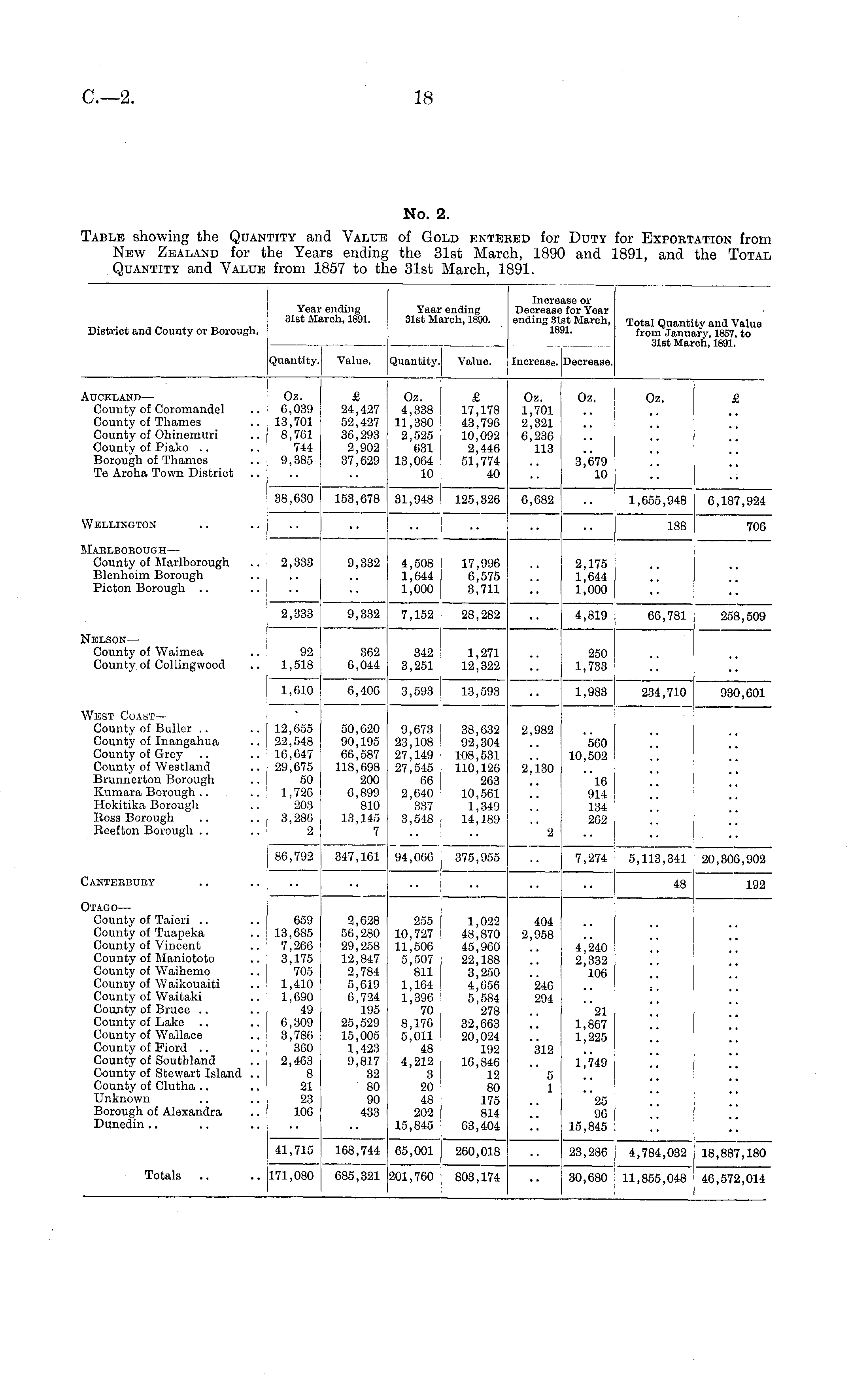 No. 2. Table showing the Quantity and Value of Gold entered for Duty for Exportation from New Zealand for the Years ending the 31st March, 1890 and 1891, and the Total Quantity and Value from 1857 to the 31st March, 1891.