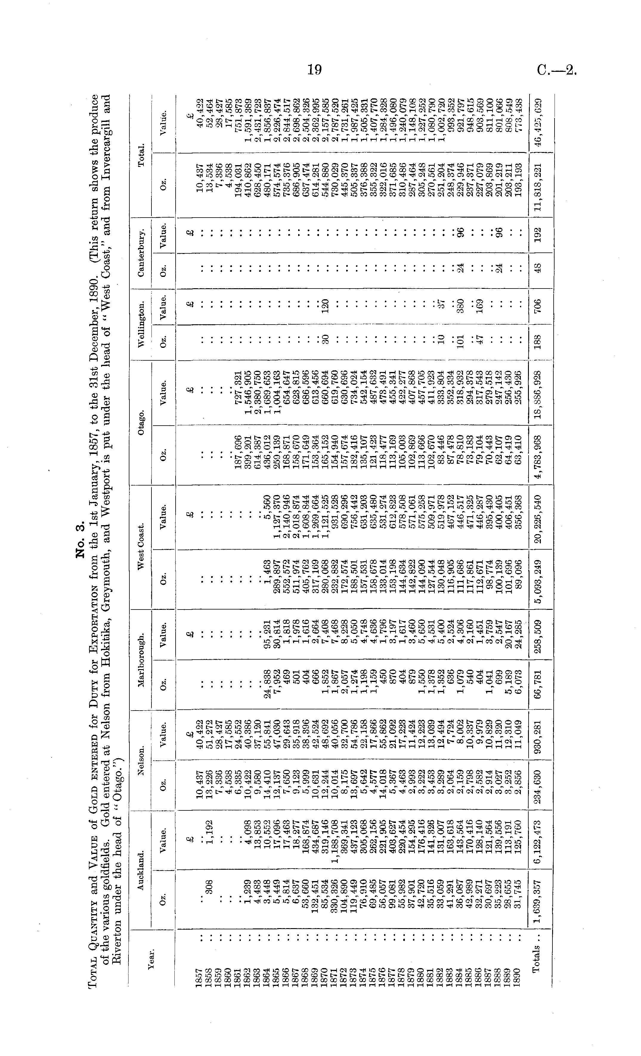 No. 3. Total Quantity and Value of Gold entered for Duty for Exportation from the 1st January, 1857, to the 31st December, 1890. (This return shows the produce of the various goldfields. Gold entered at Nelson from Hokitika, Greymouth, and Westport is put under the head of "West Coast," and from Invercargill and Riverton under the head of "Otago.")