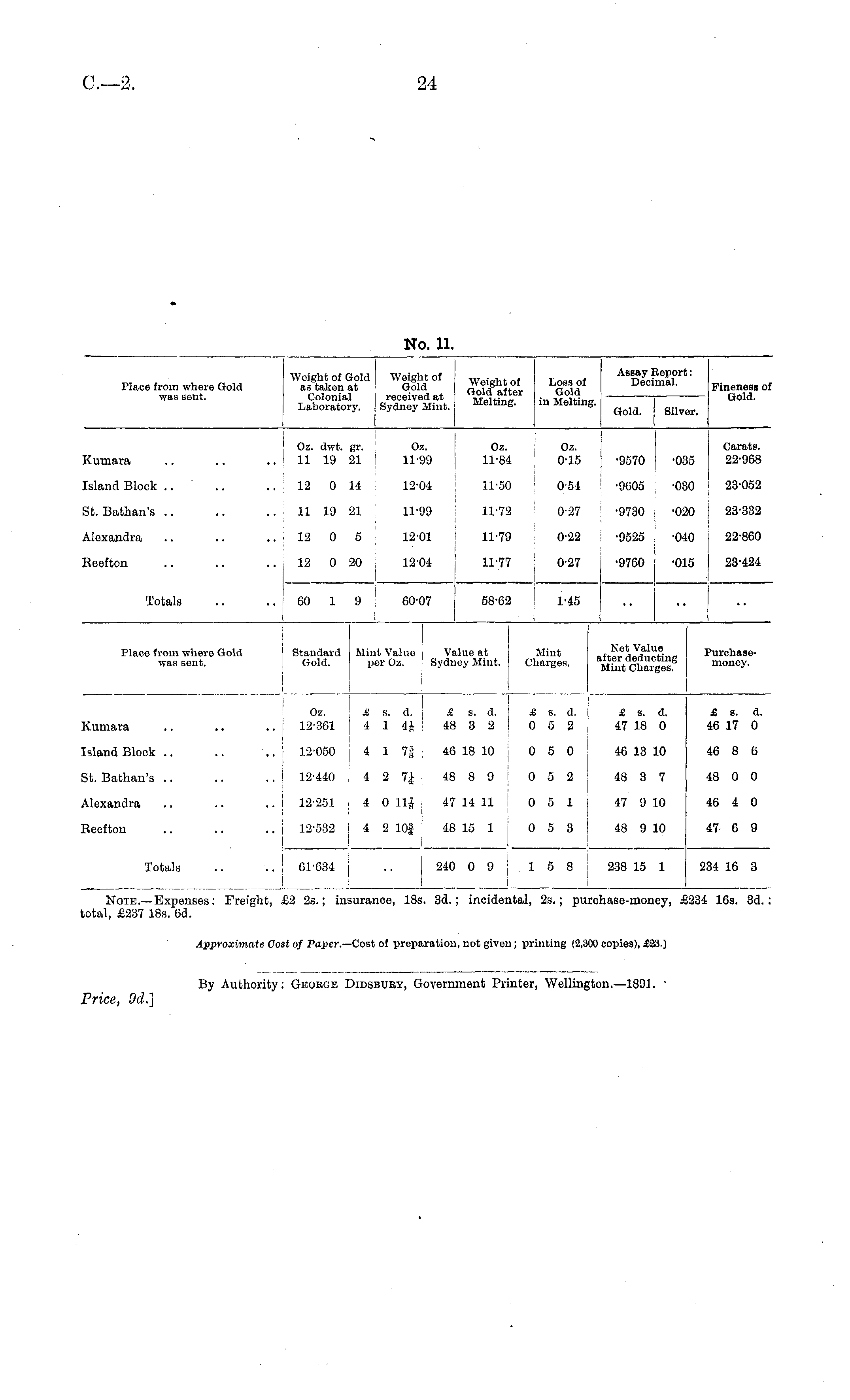 Woight of Gold as taken at Colonial Laboratory. Weight of Gold received at Sydney Mint. Weight of Gold after Melting. Assay Report: Decimal. Loss of Place from where Gold was sent. Fineness of Gold. in Melting. Gold. Silver. Kumara 1 Oz. dwt. gr. 11 19 21 Oz. 11-99 Oz. 11-84 Oz. 015 I -9570 Carats. 22-908 •035 Island Block .. .. 12 0 14 12-04 11-50 054 ! -9605 ■030 23-052 St. Bathan's .. .. 11 19 21 11-99 11-72 0-27 •9730 •020 23-332 Alexandra ... 12 0 5 1201 11-79 0-22 •9525 •040 22-800 Reefton Totals 12 0 20 ! 00 1 9 12-04 00-07 11-77 0-27 ■9760 ■015 23-424 58-6: 1-45 I I Place from where Gold was sent. Standard Gold. Mint Value Value at per Oz. Sydney Mint. Mint Charges. Net Value after deducting Mint Charges. Purchasemoney. Cumara !sland Block .. Oz. 12-361 12-050 JJ s. d. 4 1 44 £ s. d. 48 3 2 £ s. d. 0 5 2 £ s. d. 47 18 0 £ s. d. 40 17 0 4 1 7j 46 18 10 0 5 0 46 13 10 16 8 6 it. Bathan's .. Alexandra teeftou 12-440 12-251 12-532 4 2 7.]4 0 11J i 4 2 10J ! 48 8 9 47 14 11 48 15 1 0 5 2 0 5 1 48 3 7 47 9 10 48 0 0 46 4 0 0 5 3 48 9 10 47 6 9 Totals 61-634 ! 240 0 9 15 8 238 15 1 234 10 3