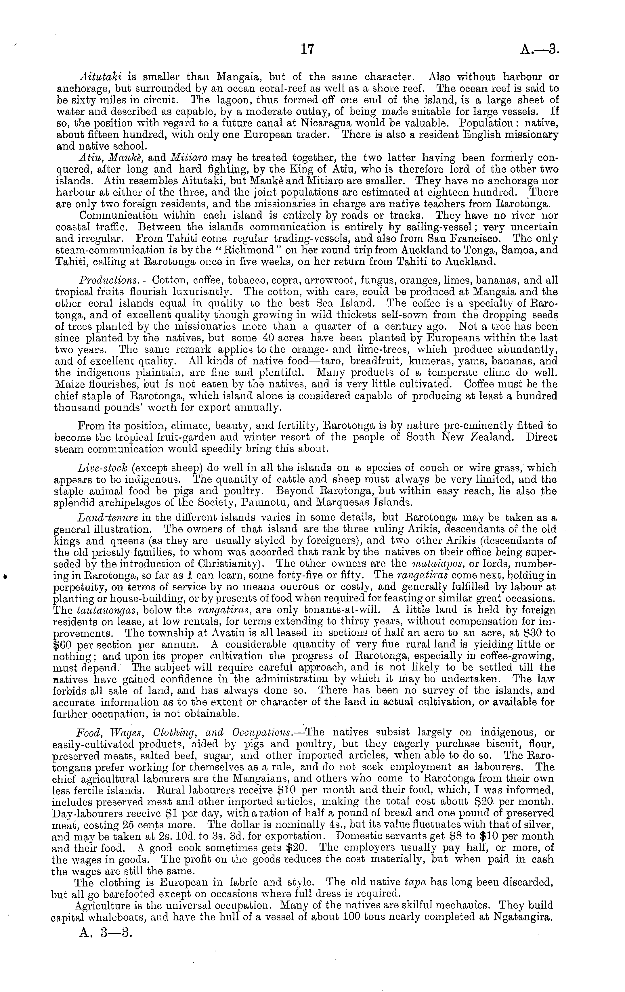 Attutaki is smaller than Mangaia, but of the same character. Also without harbour or anchorage, but surrounded by an ocean coral-reef as well as a shore reef. The ocean reef is said to be sixty miles in circuit. The lagoon, thus formed off one end of the island, is a large sheet of water and described as capable, by a moderate outlay, of being made suitable for large vessels. If so, the position with regard to a future canal at Nicaragua would be valuable. Population: native, about fifteen hundred, with only one European trader. There is also a resident English missionary and native school. Atiu, Mauke, and Mitiaro may be treated together, the two latter having been formerly conquered, after long and hard fighting, by the King of Atiu, who is therefore lord of the other two islands. Atiu resembles Aitutaki, but Mauke and Mitiaro are smaller. They have no anchorage nor harbour at either of the three, and the joint populations are estimated at eighteen hundred. There are only two foreign residents, and the missionaries in charge are native teachers from Earotonga. Communication within each island is entirely by roads or tracks. They have no river nor coastal traffic. Between the islands communication is entirely by sailing-vessel; very uncertain and irregular. From Tahiti come regular trading-vessels, and also from San Francisco. The only steam-communication is by the "Richmond" on her round trip from Auckland to Tonga, Samoa, and Tahiti, calling at Earotonga once in five weeks, on her return from Tahiti to Auckland. Productions. —Cotton, coffee, tobacco, copra, arrowroot, fungus, oranges, limes, bananas, and all tropical fruits flourish luxuriantly. The cotton, with care, could be produced at Mangaia and the other coral islands equal in quality to the best Sea Island. The coffee is a specialty of Earotonga, and of excellent quality though growing in wild thickets self-sown from the dropping seeds of trees planted by the missionaries more than a quarter of a century ago. Not a tree has been since planted by the natives, but some 40 acres have been planted by Europeans within the last two years. The same remark applies to the orange- and lime-trees, which produce abundantly, and of excellent quality. All kinds of native food—taro, breadfruit, kumeras, yams, bananas, and the indigenous plaintain, are fine and plentiful. Many products of a temperate clime do well. Maize flourishes, but is not eaten by the natives, and is very little cultivated. Coffee must be the chief staple of Earotonga, which island alone is considered capable of producing at least a hundred thousand pounds' worth for export annually. From its position, climate, beauty, and fertility, Earotonga is by nature pre-eminently fitted to become the tropical fruit-garden and winter resort of the people of South New Zealand. Direct steam communication would speedily bring this about. Live-stock (except sheep) do well in all the islands on a species of couch or wire grass, which appears to be indigenous. The quantity of cattle and sheep must always be very limited, and the staple animal food be pigs and poultry. Beyond Earotonga, but within easy reach, lie also the splendid archipelagos of the Society, Paumotu, and Marquesas Islands. Land-tenure in the different islands varies in some details, but Earotonga may be taken as a general illustration. The owners of that island are the three ruling Arikis, descendants of the old kings and queens (as they are usually styled by foreigners), and two other Arikis (descendants of the old priestly families, to whom was accorded that rank by the natives on their office being superseded by the introduction of Christianity). The other owners are the mataiapos, or lords, numbering in Earotonga, so far as I can learn, some forty-five or fifty. The rangatiras come next, holding in perpetuity, on terms of service by no means onerous or costly, and generally fulfilled by labour at planting or house-building, or by presents of food when required for feasting or similar great occasions. The tautauongas, below the rangatiras, are only tenants-at-will. A little land is held by foreign residents on lease, at low rentals, for terms extending to thirty years, without compensation for improvements. The township at Avatiu is all leased in sections of half an acre to an acre, at $30 to $60 per section per annum. A considerable quantity of very fine rural land is yielding little or nothing; and upon its proper cultivation the progress of Earotonga, especially in coffee-growing, must depend. The subject will require careful approach, and is not likely to be settled till the natives have gained confidence in the administration by which it may be undertaken. The law forbids all sale of land, and has always done so. There has been no survey of the islands, and accurate information as to the extent or character of the land in actual cultivation, or available for further occupation, is not obtainable. Food, Wages, Clothing, and Occupations. —The natives subsist largely on indigenous, or easily-cultivated products, aided by pigs and poultry, but they eagerly purchase biscuit, flour, preserved meats, salted beef, sugar, and other imported articles, when able to do so. The Barotongans prefer working for themselves as a rule, and do not seek employment as labourers. The chief agricultural labourers are the Mangaians, and others who come to Earotonga from their own less fertile islands. Rural labourers receive $10 per month and their food, which, I was informed, includes preserved meat and other imported articles, making the total cost about $20 per month. Day-labourers receive $1 per day, with a ration of half a pound of bread and one pound of preserved meat, costing 25 cents more. The dollar is nominally 45., but its value fluctuates with that of silver, and may be taken at 2s. 10d. to 3s. 3d. for exportation. Domestic servants get $8 to $10 per month and their food. A good cook sometimes gets $20. The employers usu
