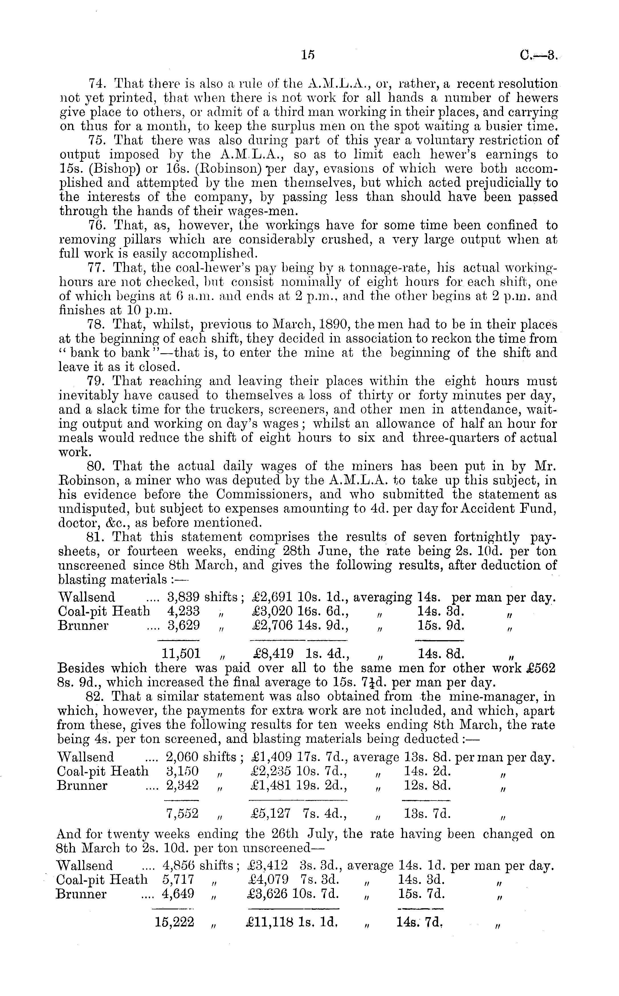 74. That there is also a rule of the A.M.L.A., or, rather, a recent resolution not yet printed, that when there is not work for all hands a number of hewers give place to others, or admit of a third man working in their places, and carrying on thus for a month, to keep the surplus men on the spot waiting a busier time. 75. That there was also during part of this year a voluntary restriction of output imposed by the A.M.L.A., so as to limit each hewer's earnings to 15s. (Bishop) or 16s. (Eobinson) per day, evasions of which were both accomplished and attempted by the men themselves, but which acted prejudicially to the interests of the company, by passing less than should have been passed through the hands of their wages-men. 76. That, as, however, the workings have for some time been confined to removing pillars which are considerably crushed, a very large output when at full work is easily accomplished. 77. That, the coal-hewer's pay being by a tonnage-rate, his actual workinghours are not checked, but consist nominally of eight hours for each shift, one of which begins at 6 a.m. and ends at 2 p.m., and the other begins at 2 p.m. and finishes at 10 p.m. 78. That, whilst, previous to March, 1890, the men had to be in their places at the beginning of each shift, they decided in association to reckon the time from " bank to bank"—that is, to enter the mine at the beginning of the shift and leave it as it closed. 79. That reaching and leaving their places within the eight hours must inevitably have caused to themselves a loss of thirty or forty minutes per day, and a slack time for the truckers, screeners, and other men in attendance, waiting output and working on day's wages; whilst an allowance of half an hour for meals would reduce the shift of eight hours to six and three-quarters of actual work. 80. That the actual daily wages of the miners has been put in by Mr. Eobinson, a miner who was deputed by the A.M.L.A. to take up this subject, in his evidence before the Commissioners, and who submitted the statement as undisputed, but subject to expenses amounting to 4d. per day for Accident Fund, doctor, &c, as before mentioned. 81. That this statement comprises the results of seven fortnightly paysheets, or fourteen weeks, ending 28th June, the rate being 2s. lOd. per ton unscreened since Bth March, and gives the following results, after deduction of blasting materials : — Wallsend .... 3,839 shifts; £2,691 10s. Id., averaging 14s. per man per day. Coal-pit Heath 4,233 ■„ £3,020 16s. 6d., „ 14s. 3d. „ Brunner .... 3,629 „ £2,706 14s. 9d., „ 15s. 9d. 11,501 „ £8,419 Is. 4d., „ 14s. Bd. Besides which there was paid over all to the same men for other work £562 Bs. 9d., which increased the final average to 15s. 7Jd. per man per day. 82. That a similar statement was also obtained from the mine-manager, in which, however, the payments for extra work are not included, and which, apart from these, gives the following results for ten weeks ending Bth March, the rate being 4s. per ton screened, and blasting materials being deducted : — Wallsend .... 2,060 shifts; £1,409 17s. 7d., average 13s. Bd. per man per day. Coal-pit Heath 3,150 „ £2,235 10s. 7d., „ 14s. 2d. Brunner .... 2,342 „ £1,481 19s. 2d., „ 12s. Bd. „ 7,552 „ £5,127 7s. 4d., „ 13s. 7d. And for twenty weeks ending the 26th July, the rate having been changed on Bth March to 2s. lOd. per ton unscreened — Wallsend .... 4,856 shifts; £3,412 3s. 3d., average 14s. Id. per man per day. Coal-pit Heath 5,717 „ £4,079 7s. 3d. „ 14s. 3d. Brunner .... 4,649 „ £3,626 10s. 7d. „ 15s. 7d. 15,222 „ £11,118 Is. Id. „ 14s. 7d.