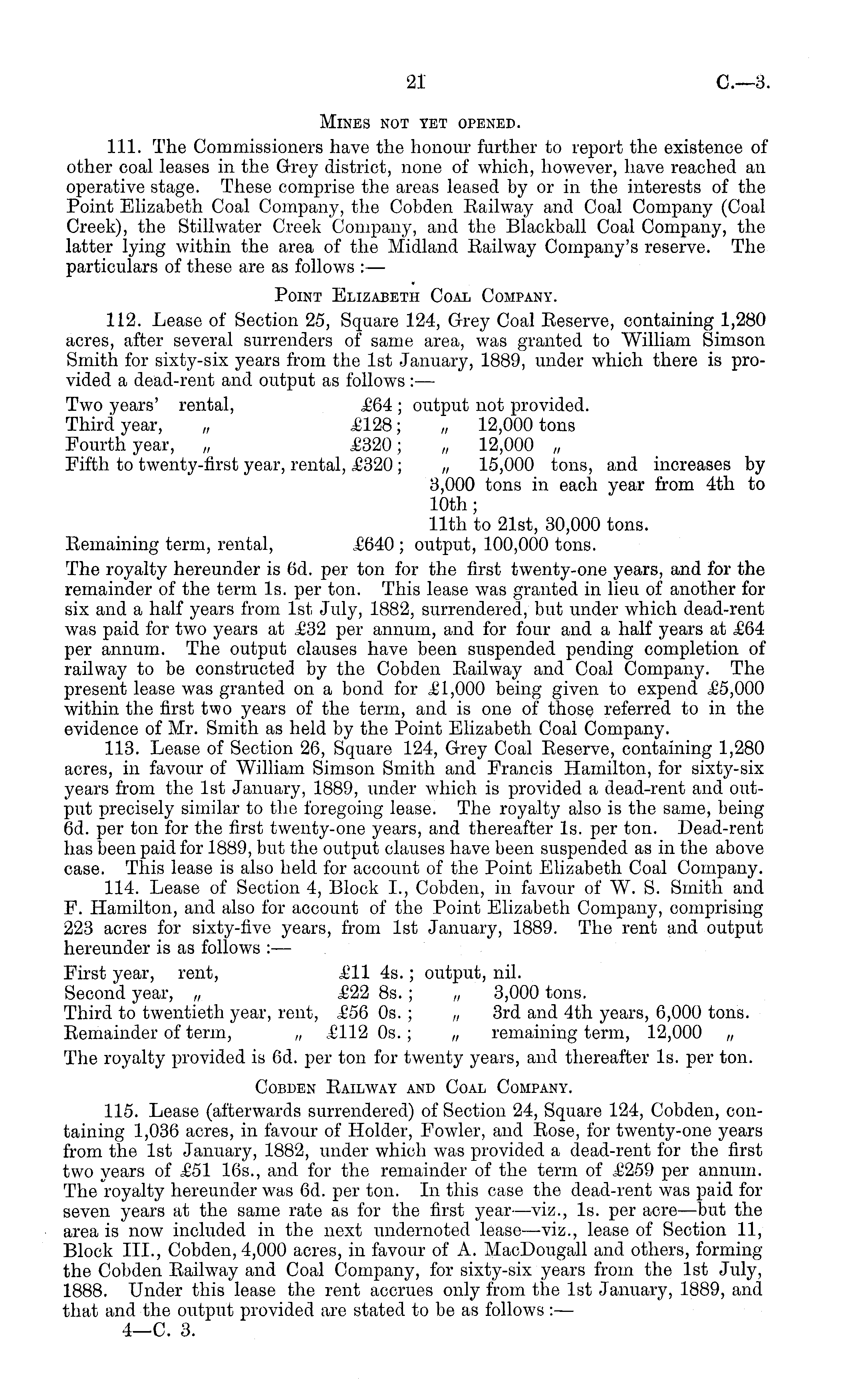 Mines not yet opened. 111. The Commissioners have the honour further to report the existence of other coal leases in the Grey district, none of which, however, have reached an operative stage. These comprise the areas leased by or in the interests of the Point Elizabeth Coal Company, the Cobden Kailw T ay and Coal Company (Coal Creek), the Stillwater Creek Company, and the Blackball Coal Company, the latter lying within the area of the Midland Eailway Company's reserve. The particulars of these are as follows :— Point Elizabeth Coal Company. 112. Lease of Section 25, Square 124, Grey Coal Eeserve, containing 1,280 acres, after several surrenders of same area, was granted to William Simson Smith for sixty-six years from the Ist January, 1889, under which there is provided a dead-rent and output as follows:— Two years' rental, £64 ; output not provided. Third year, „ £128; „ 12,000 tons Fourth year, „ £320; „ 12,000 „ Fifth to twenty-first year, rental, £320; „ 15,000 tons, and increases by 3,000 tons in each year from 4th to 10th; 11th to 21st, 30,000 tons. Eemaining term, rental, £640 ; output, 100,000 tons. The royalty hereunder is 6d. per ton for the first twenty-one years, and for the remainder of the term Is. per ton. This lease was granted in lieu of another for six and a half years from Ist July, 1882, surrendered, but under which dead-rent was paid for two years at £32 per annum, and for four and a half years at £64 per annum. The output clauses have been suspended pending completion of railway to be constructed by the Cobden Eailway and Coal Company. The present lease was granted on a bond for £1,000 being given to expend £5,000 within the first two years of the term, and is one of those referred to in the evidence of Mr. Smith as held by the Point Elizabeth Coal Company. 113. Lease of Section 26, Square 124, Grey Coal Eeserve, containing 1,280 acres, in favour of William Simson Smith and Francis Hamilton, for sixty-six years from the Ist January, 1889, under which is provided a dead-rent and output precisely similar to the foregoing lease. The royalty also is the same, being 6d. per ton for the first twenty-one years, and thereafter Is. per ton. Dead-rent has been paid for 1889, but the output clauses have been suspended as in the above case. This lease is also held for account of the Point Elizabeth Coal Company. 114. Lease of Section 4, Block 1., Cobden, in favour of W. S. Smith and F. Hamilton, and also for account of the Point Elizabeth Company, comprising 223 acres for sixty-five years, from Ist January, 1889. The rent and output hereunder is as follows :— First year, rent, £11 45.; output, nil. Second year, „ £22 Bs. ; „ 3,000 tons. Third to twentieth year, rent, £56 os. ; „ 3rd and 4th years, 6,000 tons. Eemainder of term, „ £112 os. ; „ remaining term, 12,000 „ The royalty provided is 6d. per ton for twenty years, and thereafter Is. per ton. Cobden Eailway and Coal Company. 115. Lease (afterwards surrendered) of Section 24, Square 124, Cobden, containing 1,036 acres, in favour of Holder, Fowler, and Eose, for twenty-one years from the Ist January, 1882, under which was provided a dead-rent for the first two years of £51 165., and for the remainder of the term of £259 per annum. The royalty hereunder was 6d. per ton. In this case the dead-rent was paid for seven years at the same rate as for the first year—viz., Is. per acre —but the area is now included in the next undernoted lease —viz., lease of Section 11, Block 111., Cobden, 4,000 acres, in favour of A. MacDougall and others, forming the Cobden Bailway and Coal Company, for sixty-six years from the Ist July, 1888. Under this lease the rent accrues only from the Ist January, 1889, and that and the output provided are stated to be as follows : — 4—C. 3.