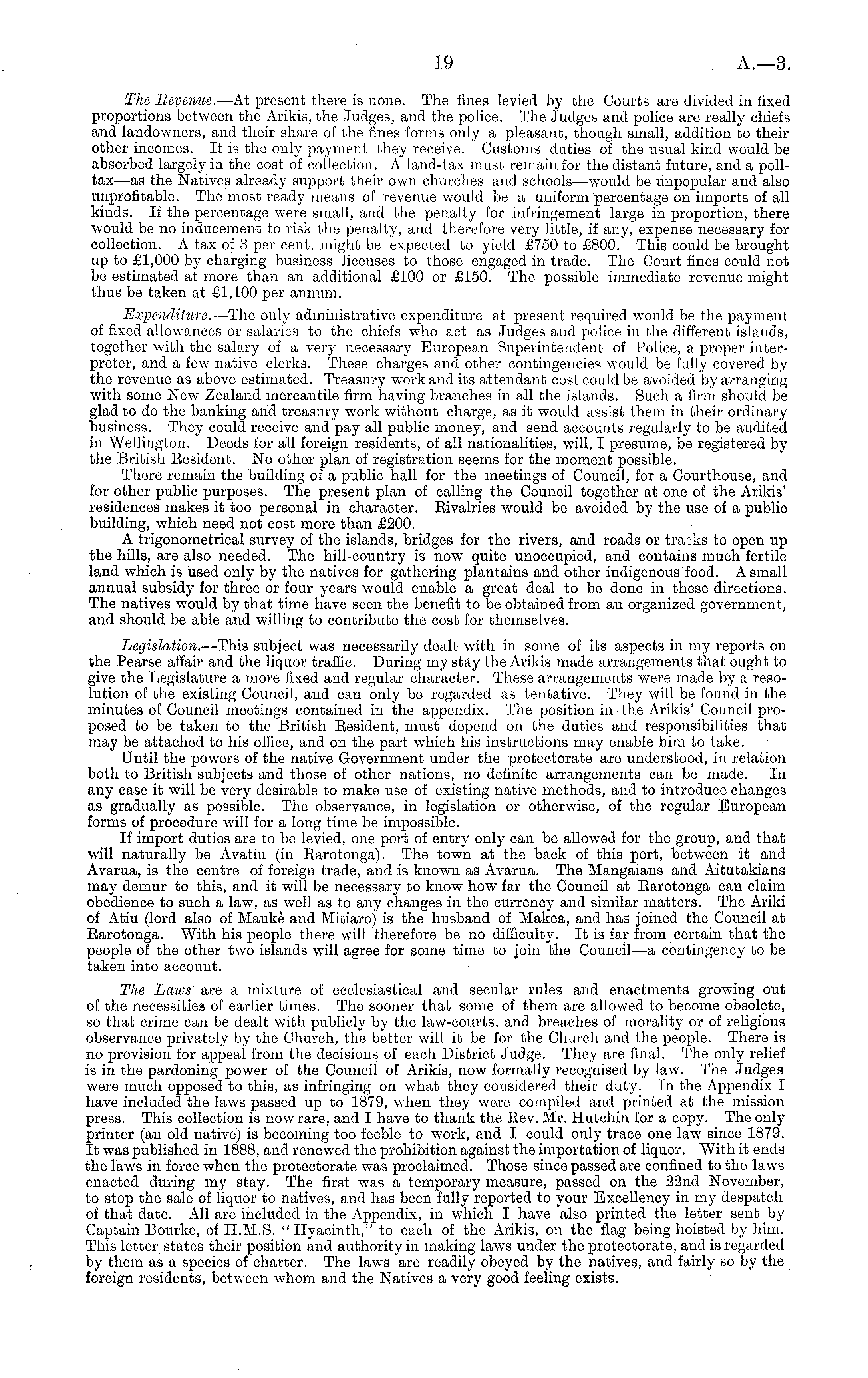 The Revenue. —At present there is none. The fines levied by the Courts are divided in fixed proportions between the Arikis, the Judges, and the police. The Judges and police are really chiefs and landowners, and their share of the fines forms only a pleasant, though small, addition to their other incomes. It is the only payment they receive. Customs duties of the usual kind would be absorbed largely in the cost of collection. A land-tax must remain for the distant future, and a polltax—as the Natives already support their own churches and schools —would be unpopular and also unprofitable. The most ready means of revenue would be a uniform percentage on imports of all kinds. If the percentage were small, and the penalty for infringement large in proportion, there would be no inducement to risk the penalty, and therefore very little, if any, expense necessary for collection. A tax of 3 per cent, might be expected to yield £750 to £800. This could be brought up to £1,000 by charging business licenses to those engaged in trade. The Court fines could not be estimated at more than an additional £100 or £150. The possible immediate revenue might thus be taken at £1,100 per annum. Expenditure. —The only administrative expenditure at present required would be the payment of fixed allowances or salaries to the chiefs who act as Judges and police in the different islands, together with the salary of a very necessary European Superintendent of Police, a proper interpreter, and a few native clerks. These charges and other contingencies would be fully covered by the revenue as above estimated. Treasury work and its attendant cost could be avoided by arranging with some New Zealand mercantile firm having branches in all the islands. Such a firm should be glad to do the banking and treasury work without charge, as it would assist them in their ordinary business. They could receive and pay all public money, and send accounts regularly to be audited in Wellington. Deeds for all foreign residents, of all nationalities, will, I presume, be registered by the British Eesidenfc. No other plan of registration seems for the moment possible. There remain the building of a public hall for the meetings of Council, for a Courthouse, and for other public purposes. The present plan of calling the Council together at one of the Arikis' residences makes it too personal in character. Eivalries would be avoided by the use of a public building, which need not cost more than £200. A trigonometrical survey of the islands, bridges for the rivers, and roads or tracks to open up the hills, are also needed. The hill-country is now quite unoccupied, and contains much fertile land which is used only by the natives for gathering plantains and other indigenous food. A small annual subsidy for three or four years would enable a great deal to be done in these directions. The natives would by that time have seen the benefit to be obtained from an organized government, and should be able and willing to contribute the cost for themselves. Legislation. —This subject was necessarily dealt with in some of its aspects in my reports on the Pearse affair and the liquor traffic. During my stay the Arikis made arrangements that ought to give the Legislature a more fixed and regular character. These arrangements were made by a resolution of the existing Council, and can only be regarded as tentative. They will be found in the minutes of Council meetings contained in the appendix. The position in the Arikis' Council proposed to be taken to the British Eesident, must depend on the duties and responsibilities that may be attached to his office, and on the part which his instructions may enable him to take. Until the powers of the native Government under the protectorate are understood, in relation both to British subjects and those of other nations, no definite arrangements can be made. In any case it will be very desirable to make use of existing native methods, and to introduce changes as gradually as possible. The observance, in legislation or otherwise, of the regular European forms of procedure will for a long time be impossible. If import duties are to be levied, one port of entry only can be allowed for the group, and that will naturally be Avatiu (in Earotonga). The town at the back of this port, between it and Avarua, is the centre of foreign trade, and is known as Avarua. The Mangaians and Aitutakians may demur to this, and it will be necessary to know how far the Council at Earotonga can claim obedience to such a law, as well as to any changes in the currency and similar matters. The Ariki of Atiu (lord also of Mauke and Mitiaro) is the husband of Makea, and has joined the Council at Earotonga. With his people there will therefore be no difficulty. It is far from certain that the people of the other two islands will agree for some time to join the Council—a contingency to be taken into account. The Laws are a mixture of ecclesiastical and secular rules and enactments growing out of the necessities of earlier times. The sooner that some of them are allowed to become obsolete, so that crime can be dealt with publicly by the law-courts, and breaches of morality or of religious observance privately by the Church, the better will it be for the Church and the people. There is no provision for appeal from the decisions of each District Judge. They are final. The only relief is in the pardoning power of the Council of Arikis, now formally recognised by law. The Judges were much opposed to this, as infringing on what they considered their duty. In the Appendix I have included the laws passed up to 1879, when they were compiled and printed at the mission press. This collection is now rare, and I have to thank the Eev. Mr. Hutchin for a copy. The only printer (an old native) is becoming too feeble to work, and I could only trace one law since 1879. It was published in 1888, and renewed the prohibition against the importation of li