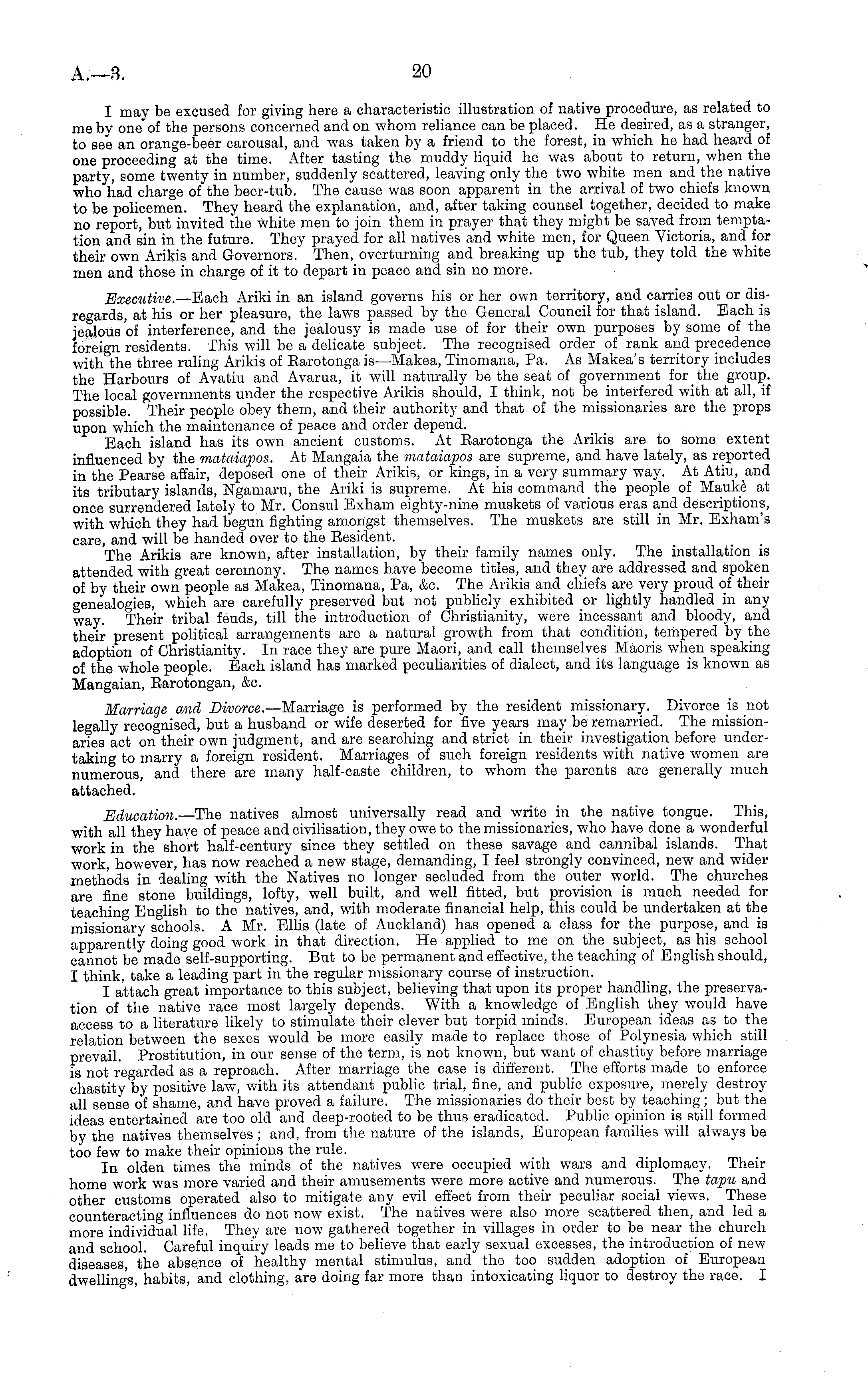 I may be excused for giving here a characteristic illustration of native procedure, as related to me by one of the persons concerned and on whom reliance can be placed. He desired, as a stranger, to see an orange-beer carousal, and was taken by a friend to the forest, in which he had heard of one proceeding at the time. After tasting the muddy liquid he was about to return, when the party, some twenty in number, suddenly scattered, leaving only the two white men and _ the native who had charge of the beer-tub. The cause was soon apparent in the arrival of two chiefs known to be policemen. They heard the explanation, and, after taking counsel together, decided to make no report, but invited the white men to join them in prayer that they might be saved from temptation and sin in the future. They prayed for all natives and white men, for Queen Victoria, and for their own Arikis and Governors. Then, overturning and breaking up the tub, they told the white men and those in charge of it to depart in peace and sin no more. Executive. —Bach Ariki in an island governs his or her own territory, and carries out or disregards, at his or her pleasure, the laws passed by the General Council for that island. Each is jealous of interference, and the jealousy is made use of for their own purposes by some of the foreign residents. This will be a delicate subject. The recognised order of rank and precedence ■with the three ruling Arikis of Earotonga is—Makea, Tinomana, Pa. As Makea's territory includes the Harbours of Avatiu and Avarua, it will naturally be the seat of government for the group. The local governments under the respective Arikis should, I think, not be interfered with at all, if possible. Their people obey them, and their authority and that of the missionaries are the props upon which the maintenance of peace and order depend. Each island has its own ancient customs. At Earotonga the Arikis are to some extent influenced by the mataiapos. At Mangaia the mataiapos are supreme, and have lately, as reported in the Pearse affair, deposed one of their Arikis, or kings, in a very summary way. At Atiu, and its tributary islands, Ngamaru, the Ariki is supreme. At his command the people of Mauke at once surrendered lately to Mr. Consul Exham eighty-nine muskets of various eras and descriptions, with which they had begun fighting amongst themselves. The muskets are still in Mr. Exham's care, and will be handed over to the Eesident. The Arikis are known, after installation, by their family names only. The installation is attended with great ceremony. The names have become titles, and they are addressed and spoken of by their own people as Makea, Tinomana, Pa, &c. The Arikis and chiefs are very proud of their genealogies, which are carefully preserved but not publicly exhibited or lightly handled in any way. Their tribal feuds, till the introduction of Christianity, were incessant and bloody, and their present political arrangements are a natural growth from that condition, tempered by the adoption of Christianity. In race they are pure Maori, and call themselves Maoris when speaking of the whole people. Each island has marked peculiarities of dialect, and its language is known as Mangaian, Earotongan, &c. Marriage and Divorce. —Marriage is performed by the resident missionary. Divorce is not legally recognised, but a husband or wife deserted for five years may be remarried. The missionaries act on their own judgment, and are searching and strict in their investigation before undertaking to marry a foreign resident. Marriages of such foreign residents with native women are numerous, and there are many half-caste children, to whom the parents are generally much attached. Education. —The natives almost universally read and write in the native tongue. This, with all they have of peace and civilisation, they owe to the missionaries, who have done a wonderful work in the short half-century since they settled on these savage and cannibal islands. That work, however, has now reached a new stage, demanding, I feel strongly convinced, new and wider methods in dealing with the Natives no longer secluded from the outer world. The churches are fine stone buildings, lofty, well built, and well fitted, but provision is much needed for teaching English to the natives, and, with moderate financial help, this could be undertaken at the missionary schools. A Mr. Ellis (late of Auckland) has opened a class for the purpose, and is apparently doing good work in that direction. He applied to me on the subject, as his school cannot be made self-supporting. But to be permanent and effective, the teaching of English should, I think, take a leading part in the regular missionary course of instruction. I attach great importance to this subject, believing that upon its proper handling, the preservation of the native race most largely depends. With a knowledge of English they would have access to a literature likely to stimulate their clever but torpid minds. European ideas as to the relation between the sexes would be more easily made to replace those of Polynesia which still prevail. Prostitution, in our sense of the term, is not known, but want of chastity before marriage is not regarded as a reproach. After marriage the case is different. The efforts made to enforce chastity by positive law, with its attendant public trial, fine, and public exposure, merely destroy all sense of shame, and have proved a failure. The missionaries do their best by teaching; but the ideas entertained are too old and deep-rooted to be thus eradicated. Public opinion is still formed by the natives themselves ; and, from the nature of the islands, European families will always be too few to make their opinions the rule. In olden times the minds of the natives were occupied with wars and diplomacy. Their home work was more varied and their amusements Were more active and numerous. The tapu and other customs operated also to mitigate any evil e