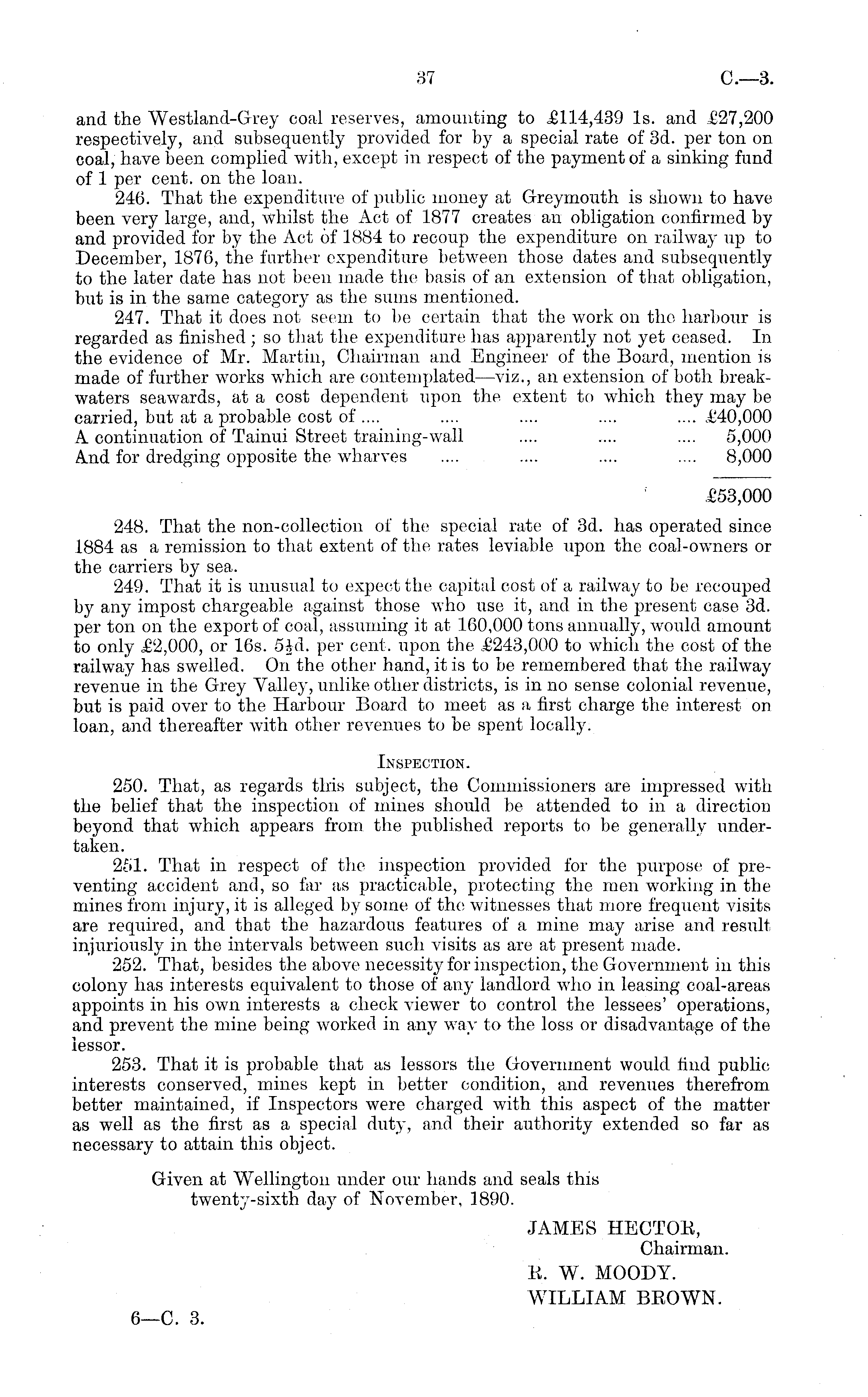 and the Westland-Grey coal reserves, amounting to £114,439 Is. and £27,200 respectively, and subsequently provided for by a special rate of 3d. per ton on coal, have been complied with, except in respect of the payment of a sinking fund of 1 per cent, on the loan. 246. That the expenditure of public money at Greymouth is shown to have been very large, and, whilst the Act of 1877 creates an obligation confirmed by and provided for by the Act of 1884 to recoup the expenditure on railway up to December, 1876, the further expenditure between those dates and subsequently to the later date has not been made the basis of an extension of that obligation, but is in the same category as the sums mentioned. 247. That it does not seem to be certain that the work on the harbour is regarded as finished ;so that the expenditure lias apparently not yet ceased. In the evidence of Mr. Martin, Chairman and Engineer of the Board, mention is made of further works which are contemplated'—viz., an extension of both breakwaters seawards, at a cost dependent upon the extent to which they may be carried, but at a probable cost of .... .... .... .... .... £40,000 A continuation of Tainui Street training-wall .... .... .... 5,000 And for dredging opposite the wharves .... .... .... .... 8,000 £53,000 248. That the non-collection of the special rate of 3d. lias operated since 1884 as a remission to that extent of the rates leviable upon the coal-owmers or the carriers by sea. 249. That it is unusual to expect the capital cost of a railway to be recouped by any impost chargeable against those who use it, and in the present case 3d. per ton on the export of coal, assuming it at 160,000 tons annually, would amount to only £2,000, or 16s. sjd. per cent, upon the £243,000 to which the cost of the railway has swelled. On the other hand, it is to be remembered that the railway revenue in the Grey Valley, unlike other districts, is in no sense colonial revenue, but is paid over to the Harbour Board to meet as a first charge the interest on loan, and thereafter with other revenues to be spent locally. Inspection. 250. That, as regards this subject, the Commissioners are impressed with the belief that the inspection of mines should be attended to in a direction beyond that which appears from the published reports to be generally undertaken. 251. That in respect of the inspection provided for the purpose of preventing accident and, so far as practicable, protecting the men working in the mines from injury, it is alleged by some of the witnesses that more frequent visits are required, and that the hazardous features of a mine may arise and result injuriously in the intervals between such visits as are at present made. 252. That, besides the above necessity for inspection, the Government in this colony has interests equivalent to those of any landlord who in leasing coal-areas appoints in his own interests a check viewer to control the lessees' operations, and prevent the mine being worked in any way to the loss or disadvantage of the lessor. 253. That it is probable that as lessors the Government would find public interests conserved, mines kept in better condition, and revenues therefrom better maintained, if Inspectors were charged with this aspect of the matter as well as the first as a special duty, and their authority extended so far as necessary to attain this object. Given at Wellington under our hands and seals this twenty-sixth day of November, 1890. JAMES HECTOR, Chairman. R. W. MOODY. WILLIAM BROWN. 6—C. 3.