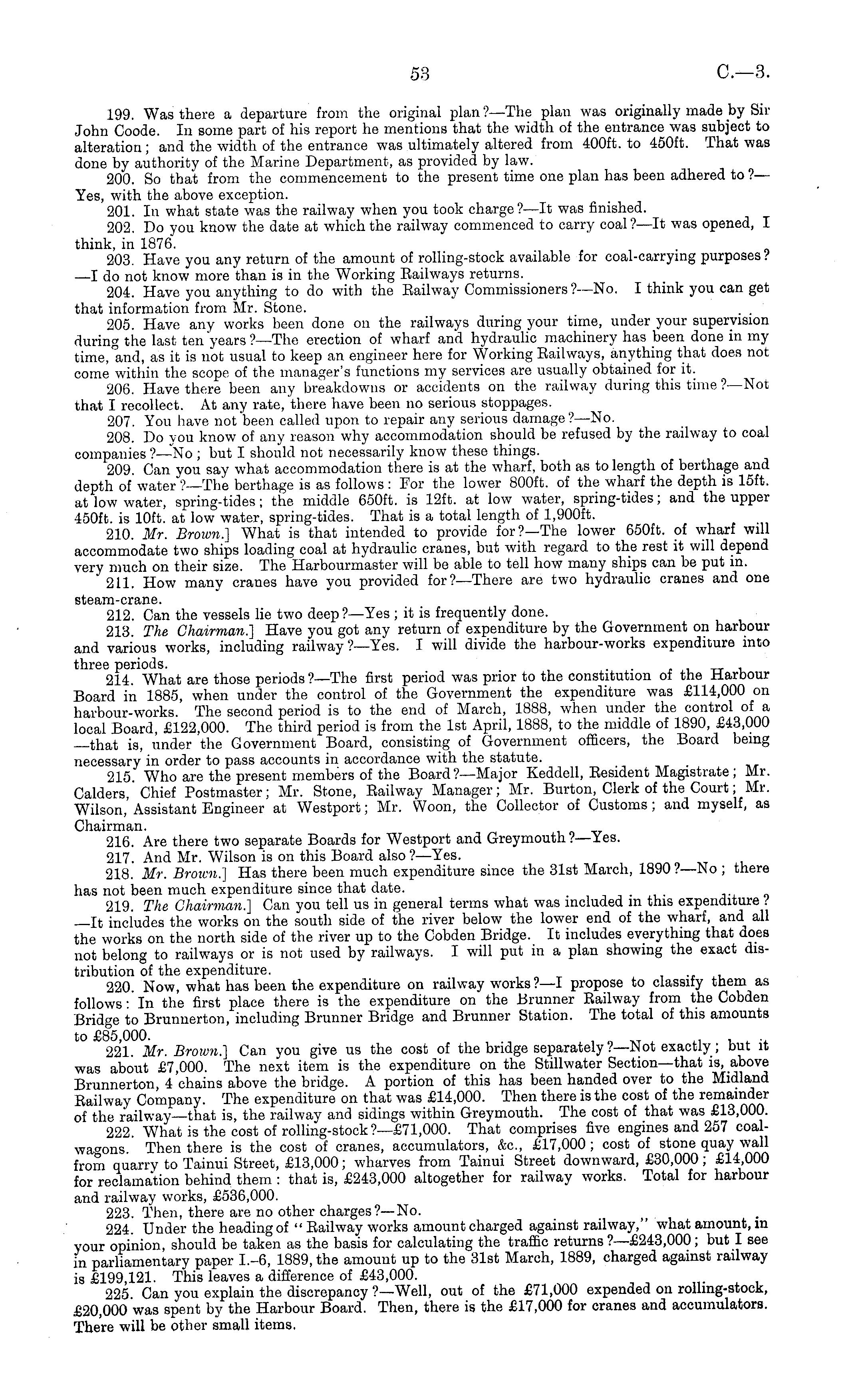 199. Was there a departure from the original plan ?—The plan was originally made by Sir John Coode. In some part of his report he mentions that the width of the entrance was subject to alteration; and the width of the entrance was ultimately altered from 400 ft. to 450 ft. That was done by authority of the Marine Department, as provided by law. 200. So that from the commencement to the present time one plan has been adhered to ?— Yes, with the above exception. 201. In what state was the railway when you took charge?—lt was finished. 202. Do you know the date at which the railway commenced to carry coal? —It was opened, I think, in 1876. 203. Have you any return of the amount of rolling-stock available for coal-carrying purposes? —I do not know more than is in the Working Eailways returns. 204. Have you anything to do with the Eailway Commissioners?— No. I think you can get that information from Mr. Stone. . . 205. Have any works been done on the railways during your time, under your supervision during the last ten years ?—The erection of wharf and hydraulic machinery has been done in my time, "and, as it is not usual to keep an engineer here for Working Eailways, anything that does not come within the scope of the manager's functions my services are usually obtained for it. 206. Have there been any breakdowns or accidents on the railway during this time ?—Not that I recollect. At any rate,'there have been no serious stoppages. 207. You have not "been called upon to repair any serious damage?— No. 208. Do you know of any reason why accommodation should be refused by the railway to coal companies ?—No ; but I should not necessarily know these things. 209. Can you say what accommodation there is at the wharf, both as to length of berthage and depth of water ?—The berthage is as follows : For the lower 800 ft. of the wharf the depth is 15ft. at low water, spring-tides; the middle 650 ft. is 12ft. at low water, spring-tides; and the upper 450 ft. is 10ft. at low water, spring-tides. That is a total length of 1,900 ft. 210. Mr. Brown.] What is that intended to provide for?— The lower 650 ft. of wharf will accommodate two ships loading coal at hydraulic cranes, but with regard to the rest it will depend very much on their size. The Harbourmaster will be able to tell how many ships can be put in. 211. How many cranes have you provided for?— There are two hydraulic cranes and one steam-crane. 212. Can the vessels lie two deep?— Yes ;it is frequently done. 213. The Chairman.] Have you got any return of expenditure by the Government on harbour and various works, including railway ?—Yes. I will divide the harbour-works expenditure into three periods. . 214. What are those periods ?—The first period was prior to the constitution of the Harbour Board in 1885, when under the control of the Government the expenditure was £114,000 on harbour-works. The second period is to the end of March, 1888, when under the control of a local Board, £122,000. The third period is from the Ist April, 1888, to the middle of 1890, £43,000 —that is, under the Government Board, consisting of Government officers, the Board being necessary in order to pass accounts in accordance with the statute. 215. Who are the present members of the Board?— Major Keddell, Eesident Magistrate ; Mr. Carders, Chief Postmaster; Mr. Stone, Eailway Manager; Mr. Burton, Clerk of the Court; Mr. Wilson, Assistant Engineer at Westport; Mr. Woon, the Collector of Customs; and myself, as Chairman. 216. Are there two separate Boards for Westport and Greymouth ?—Yes. 217. And Mr. Wilson is on this Board also? —Yes. 218. Mr. Brown.] Has there been much expenditure since the 31st March, 1890?— No ; there has not been much expenditure since that date. 219. The Chairman.] Can you tell us in general terms what was included in this expenditure >. —It includes the works on the south side of the river below the lower end of the wharf, and all the works on the north side of the river up to the Cobden Bridge. It includes everything that does not belong to railways or is not used by railways. I will put in a plan showing the exact distribution of the expenditure. 220. Now, what has been the expenditure on railway works ?—I propose to classify them as follows: In the first place there is the expenditure on the Brunner Eailway from the Cobden Bridge to Brunnerton, including Brunner Bridge and Brunner Station. The total of this amounts to £85,000. , „ xt . i.i v. •* 221. Mr. Brown.] Can you give us the cost of the bridge separately ?—Not exactly; but it was about £7,000. The next item is the expenditure on the Stillwater Section—that is, above Brunnerton 4 chains above the bridge. A portion of this has been handed over to the Midland Eailway Company. The expenditure on that was £14,000. Then there is the cost of the remainder of the railway—that is, the railway and sidings within Greymouth. The cost of that was £13,000. 222. What is the cost of rolling-stock?—£7l,ooo. That comprises five engines and 257 coalwagons. Then there is the cost of cranes, accumulators, &c, £17,000 ; cost of stone quay wall from quarry to Tainui Street, £13,000; wharves from Tainui Street downward, £30,000; £14,000 for reclamation behind them : that is, £243,000 altogether for railway works. Total for harbour and railway works, £536,000. 223. Then, there are no other charges?— No. 224. Under the heading of " Eailway works amount charged against railway," what amount, in your opinion, should be taken as the basis for calculating the traffic returns ?—£243,000; but I see in parliamentary paper 1.-6, 1889, the amount up to the 31st March, 1889, charged against railway is £199,121. This leaves a difference of £43,000. 225. Can you explain the discrepancy ?—Well, out of the £71,000 expended on rolling-stock, £20,000 was spent by the Harbour Board. Then, there is the £17,000 for cranes and accumulators. There will 