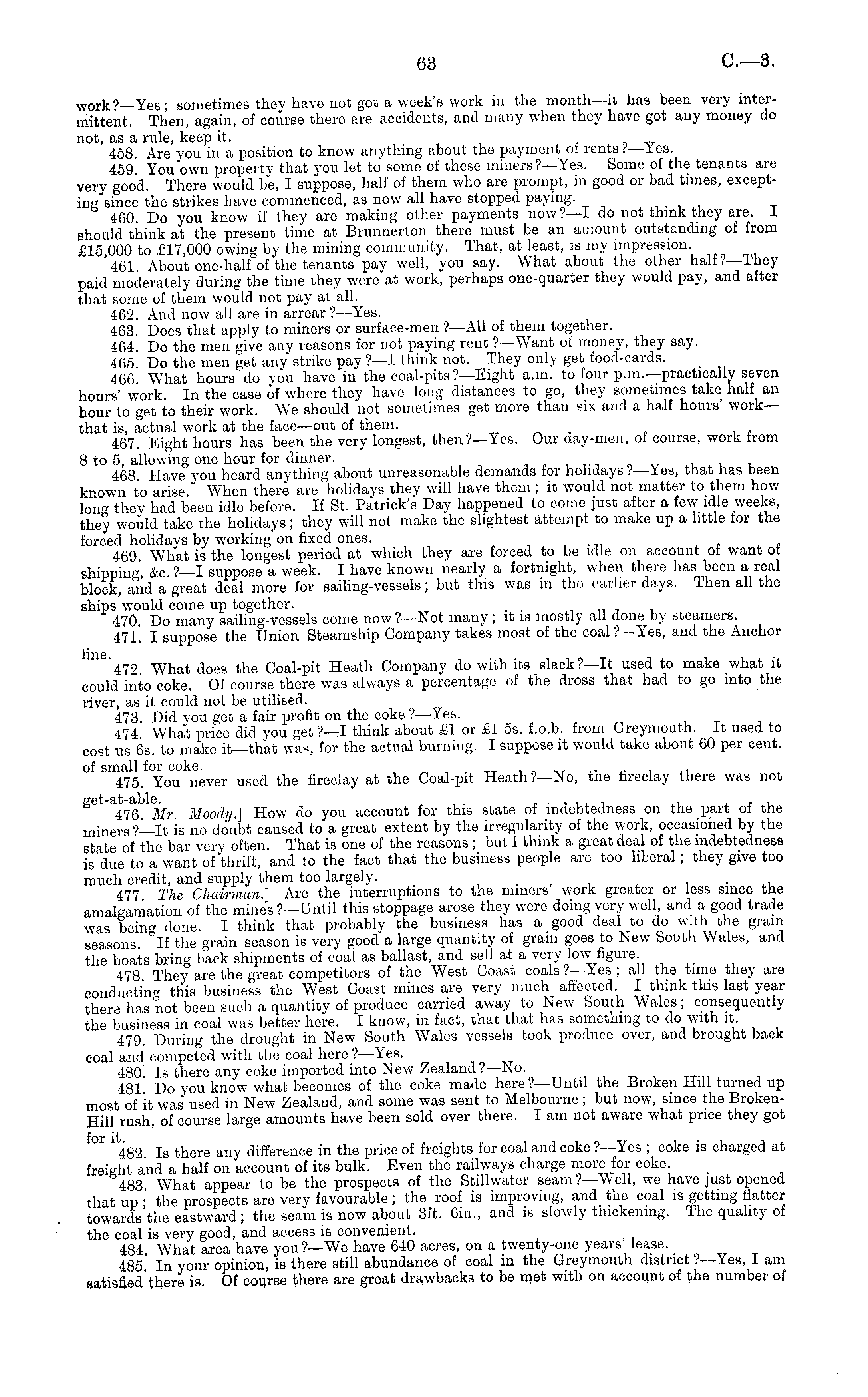 work?— Yes; sometimes they have not got a week's work in the month—it has been very intermittent. Then, again, of course there are accidents, and many when they have got any money do not, as a rule, keep it. 458. Are you in a position to know anything about the payment of rents >. — Yes. 459. You "own property that you let to some of these miners?— Yes. Some of the tenants are very good. There would be, I suppose, half of them who are prompt, in good or bad times, excepting since the strikes have commenced, as now all have stopped paying. .. , , ' 460. Do you know if they are making other payments now?—l do not think they are. I should think at the present time at Brunnerton there must be an amount outstanding of from £15 000 to £17,000 owing by the mining community. That, at least, is my impression. '461. About one-half of the tenants pay well, you say. What about the other half?— They paid moderately during the time they were at work, perhaps one-quarter they would pay, and after that some of them would not pay at all. 462. And now all are in arrear ?—Yes. 463. Does that apply to miners or surface-men ?—All of them together. 464. Do the men give any reasons for not paying rent ? —Want of money, they say. 465 Do the men get any strike pay ?—I think not. They only get food-cards. 466 What hours do you have in the coal-pits?— Eight a.m. to four p.m.—practically seven hours' work. In the case of where they have long distances to go, they sometimes take half an hour to get to their work. We should not sometimes get more than six and a half hours' workthat is, actual work at the face—out of them. 467. Eight hours has been the very longest, then?— Yes. Our day-men, of course, work from 8 to 5, allowing one hour for dinner. 468 Have you heard anything about unreasonable demands for holidays ?—Yes, that has been known to arise." When there are holidays they will have them ; it would not matter to them how Ion" they had been idle before. If St. Patrick's Day happened to come just after a few idle weeks, they would take the holidays; they will not make the slightest attempt to make up a little for the forced holidays by working on fixed ones. ~,.,, , * 469 What is the longest period at which they are forced to be idle on account of want ot shipping & c '—I suppose a week. I have known nearly a fortnight, when there lias been a real block, and a great deal more for sailing-vessels; but this was in the earlier days. Then all the ships would come up together. 470. Do many sailing-vessels come now?— Not many; it is mostly all done by steamers. 471. I suppose the Union Steamship Company takes most of the coal ?—Yes, and the Anchor lin.6 472 What does the Coal-pit Heath Company do with its slack?—lt used to make what it could into coke. Of course there was always a percentage of the dross that had to go into the river, as it could not be utilised. 473. Did you get a fair profit on the coke ?—Yes. 474 What price did you get ?—I think about £1 or £1 ss. f.o.b. from Greymouth. It used to cost us 6s. to make it—that was, for the actual burning. I suppose it would take about 60 per cent. of small for coke. . 475. You never used the fireclay at the Coal-pit Heath?—No, the fireclay there was not 86 Mr Moody.] How do you account for this state of indebtedness 011 the part of the miners?—lt is no doubt caused to a great extent by the irregularity of the work, occasioned by the state of the bar very often. That is one of the reasons ; but I think a great deal of the indebtedness is due to a want of "thrift, and to the fact that the business people are too liberal; they give too much credit, and supply them too largely. . 477 The Chairman.] Are the interruptions to the miners work greater or less since the amalgamation of the mines?— Until this stoppage arose they were doing very well, and a good trade was bein" done. I think that probably the business has a good deal to do with the gram seasons. *If the grain season is very good a large quantity of gram goes to New South Wales, and the boats bring back shipments of coal as ballast, and sell at a very low figure. 478 They are the great competitors of the West Coast coals ?—Yes ; all the time they are conducting this business the West Coast mines are very much affected. I think this last year there has not been such a quantity of produce carried away to New South Wales; consequently the business in coal was better here. I know, in fact, that that has something to do with it. 479. During the drought in New South Wales vessels took produce over, and brought back coal and compered with the coal here ?—Yes. 480 Is there any coke imported into New Zealand ?—No. 481 Do you know what becomes of the coke made here ?—Until the Broken Hill turned up most of it was used in New Zealand, and some was sent to Melbourne; but now, since the BrokenHill rush, of course large amounts have been sold over there. lam not aware what price they got 482 Is there any difference in the price of freights for coal and coke ?—Yes ; coke is charged at freight and a half on account of its bulk. Even the railways charge more for coke. 483 What appear to be the prospects of the Stillwater seam?— Well, we have just opened that up ■' the prospects are very favourable ; the roof is improving, and the coal is getting flatter towards the eastward ; the seam is now about 3ft. 6in., and is slowly thickening. The quality of the coal is very good, and access is convenient. _ 484 What area have you ?—We have 640 acres, on a twenty-one years lease. 485 In your opinion, "is there still abundance of coal in the Greymouth district ?—Yes, lam satisfied'there is Of course there are great drawbacks to be met with on account of the number of