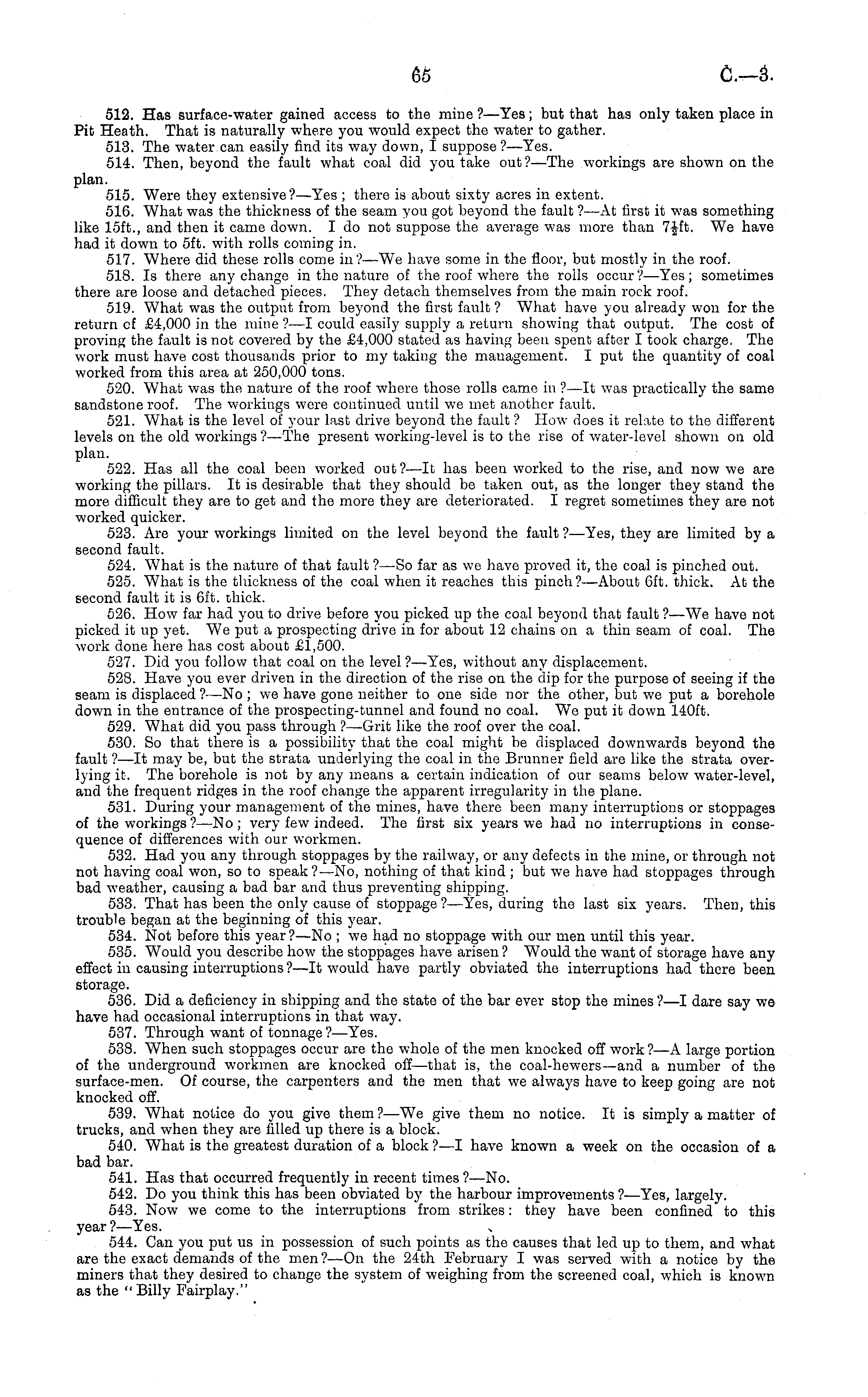 512. Has surface-water gained access to the mine ?—Yes; but that has only taken place in Pit Heath. That is naturally where you would expect the water to gather. 513. The water can easily find its way down, I suppose ?—Yes. 514. Then, beyond the fault what coal did you take out?— The workings are shown on the plan. 515. Were they extensive? —Yes ; there is about sixty acres in extent. 516. What was the thickness of the seam you got beyond the fault ? —At first it was something like 15ft., and then it came down. I do not suppose the average was more than 7-§ft. We have had it down to sft. with rolls coming in. 517. Where did these rolls come in?—We have some in the floor, but mostly in the roof. 518. Is there any change in the nature of the roof where the rolls occur ?—Yes; sometimes there are loose and detached pieces. They detach themselves from the main rock roof. 519. What was the output from beyond the first fault ? What have you already won for the return cf £4,000 in the mine ?—I could easily supply a return showing that output. The cost of proving the fault is not covered by the £4,000 stated as having been spent after I took charge. The work must have cost thousands prior to my taking the management. I put the quantity of coal worked from this area at 250,000 tons. 520. What was the nature of the roof where those rolls came in ?—lt was practically the same sandstone roof. The workings were continued until we met another fault. 521. What is the level of your last drive beyond the fault ? How does it relate to the different levels on the old workings ?—The present working-level is to the rise of water-level shown on old plan. 522. Has all the coal been worked out? —It has been worked to the rise, and now we are working the pillars. It is desirable that they should be taken out, as the longer they stand the more difficult they are to get and the more they are deteriorated. I regret sometimes they are not worked quicker. 523. Are your workings limited on the level beyond the fault ? —Yes, they are limited by a second fault. 524. What is the nature of that fault ?—So far as we have proved it, the coal is pinched out. 525. What is the thickness of the coal when it reaches this pinch?— About Oft. thick. At the second fault it is 6ft. thick. 526. How far had you to drive before you picked up the coal beyond that fault ?—We have not picked it up yet. We put a prospecting drive in for about 12 chains on a thin seam of coal. The work done here has cost about £1,500. 527. Did you follow that coal on the level?— Yes, without any displacement. 528. Have you ever driven in the direction of the rise on the dip for the purpose of seeing if the seam is displaced ?—No ; we have gone neither to one side nor the other, but we put a borehole down in the entrance of the prospecting-tunnel and found no coal. We put it down 140 ft. 529. What did you pass through ? —Grit like the roof over the coal. 530. So that there is a possibility that the coal might be displaced downwards beyond the fault ?—lt may be, but the strata underlying the coal in the Brunner field are like the strata overlying it. The borehole is not by any means a certain indication of our seams below water-level, and the frequent ridges in the roof change the apparent irregularity in the plane. 531. During your management of the mines, have there been many interruptions or stoppages of the workings? —No; very few indeed. The first six years we had no interruptions in consequence of differences with our workmen. 532. Had you any through stoppages by the railway, or any defects in the mine, or through not not having coal won, so to speak?—No, nothing of that kind ; but we have had stoppages through bad weather, causing a bad bar and thus preventing shipping. 533. That has been the only cause of stoppage ?—Yes, during the last six years. Then, this trouble began at the beginning of this year. 534. Not before this year?—No ; we had no stoppage with our men until this year. 535. Would you describe how the stoppages have arisen ? Would the want of storage have any effect in causing interruptions?—lt would have partly obviated the interruptions had there been storage. 536. Did a deficiency in shipping and the state of the bar ever stop the mines ?—I dare say we have had occasional interruptions in that way. 537. Through want of tonnage?— Yes. 538. When such stoppages occur are the whole of the men knocked off work ?—A large portion of the underground workmen are knocked off—that is, the coal-hewers—and a number of the surface-men. Of course, the carpenters and the men that we always have to keep going are not knocked off. 539. What notice do you give them?—We give them no notice. It is simply a matter of trucks, and when they are filled up there is a block. 540. What is the greatest duration of a block ?—I have known a week on the occasion of a bad bar. 541. Has that occurred frequently in recent times?— No. 542. Do you think this has been obviated by the harbour improvements ?—Yes, largely. 543. Now we come to the interruptions from strikes: they have been confined to this year ? —Yes. 544. Can you put us in possession of such points as the causes that led up to them, and what are the exact demands of the men? —On the 24th February I was served with a notice by the miners that they desired to change the system of weighing from the screened coal, which is known as the "Billy Fairplay."