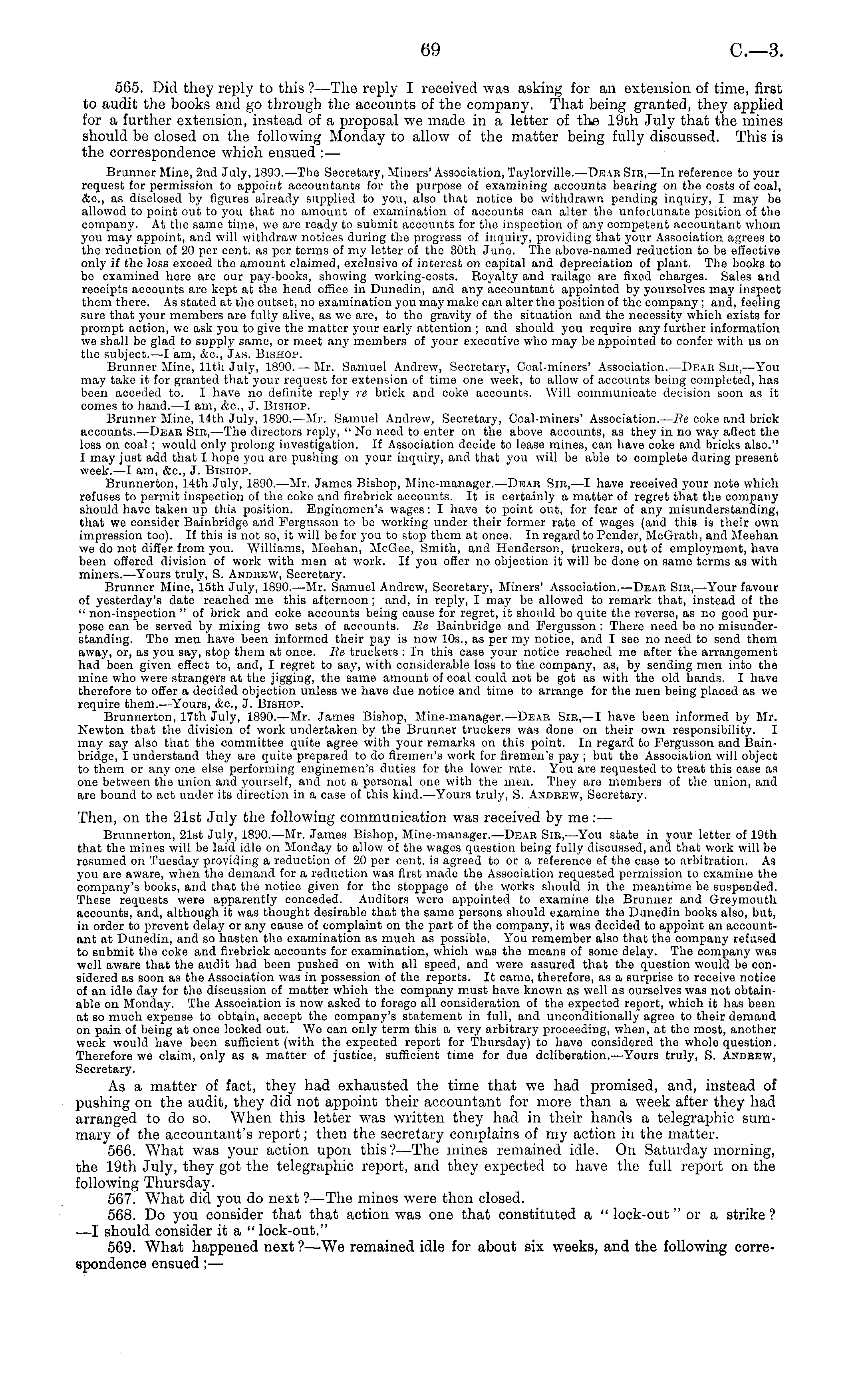 565. Did they reply to this ? —The reply I received was asking for an extension of time, first to audit the books and go through the accounts of the company. That being granted, they applied for a further extension, instead of a proposal we made in a letter of the 19th July that the mines should be closed 011 the following Monday to allow of the matter being fully discussed. This is the correspondence which ensued : — Brunner Mine, 2nd July, 1890.—Tho Secretary, Miners' Association, Taylorville.—Deab Sib, —In reference to your request for permission to appoint accountants for the purpose of examining accounts bearing on the costs of coal, &c, as disclosed by figures already supplied to you, also that notice be withdrawn pending inquiry, I may be allowed to point out to you that no amount of examination of accounts can alter the unfortunate position of tho company. At the same time, we are ready to submit accounts for the inspection of any competent accountant whom you may appoint, and will withdraw notices during the progress of inquiry, providing that your Association agrees to the reduction of 20 per cent, as per terms of my letter of the 30th June. The above-named reduction to be effectivo only if the loss exceed the amount claimed, exclusive of interest on capital and depreciation of plant. The books to be examined here are our pay-books, showing working-costs. Boyalty and railage are fixed charges. Sales and receipts accounts are kept at the head office in Dunedin, and any accountant appointed by yourselves may inspect them there. As stated at the outset, no examination you may make can alter the position of the company ; and, feeling sure that your members are fully alive, as we are, to the gravity of the situation and the necessity which exists for prompt action, we ask you to give the matter your early attention ; and should you require any further information we shall be glad to supply same, or meet any members of your executive who may be appointed to confer with us on the subject.—l am, &c, Jas. Bishop. Brunner Mine, 11th July, 1890. — Mr. Samuel Andrew, Secretarj', Coal-miners' Association.—Dear SIR, —You may take it for granted that your request for extension of time one week, to allow of accounts being completed, has been acceded to. I have no definite reply re brick and coke accounts. Will communicate decision soon as it comes to hand.—l am, etc., J. Bishop. Brunner Mine, 14th July, 1890.—Mr. Samuel Andrew, Secretary, Coal-miners' Association.— Be coke and brick accounts.—Dear Sir, —The directors reply, "No need to enter on the above accounts, as they in no way affect the loss on coal; would only prolong investigation. If Association decide to lease mines, can have coke and bricks also." I may just add that I hope you are pushing on your inquiry, and that you will he able to complete during present week. —I am, &c, J. Bishop. Brunnerton, 14th July, 1890. —Mr. James Bishop, Mine-manager.—Dear Sir, —I have received your note which refuses to permit inspection of the coke and firebrick accounts. It is certainly a matter of regret that the company should have taken up this position. Enginemen's wages : I have to point out, for fear of any misunderstanding, that we consider Bainbridge artd Fergusson to bo working under their former rate of wages (and this is their own impression too). If this is not so, it will be for you to stop them at once. In regard to Pender, McGrath, and Meehan we do not differ from you. Williams, Meehan, McGee, Smith, and Henderson, truckers, out of employment, have been offered division of work with men at work. If you offer no objection it will be done on same terms as witli miners.—Yours truly, S. Andrew, Secretary. Brunner Mine, 15th July, 1890. —Mr. Samuel Andrew, Secretary, Miners' Association. —Dear Sir, —Your favour of yesterday's date reached me this afternoon ; and, in reply, I may be allowed to remark that, instead of the " non-inspection " of brick and coke accounts being cause for regret, it should be quite the reverse, as no good purpose can be served by mixing two sets of accounts. Be Bainbridge and Fergusson : There need be no misunderstanding. The men have been informed their pay is now 10s., as per my notice, and I see no need to send them awaj', or, as you say, stop them at once. Be truckers :In this case your notice reached me after the arrangement had been given effect to, and, I regret to say, with considerable loss to the company, as, by sending men into the mine who were strangers at the jigging, the same amount of coal could not be got as with the old hands. I have therefore to offer a decided objection unless we have due notice and time to arrange for the men being placed as we require them.—Yours, &c, J. Bishop. Brunnerton, 17th July, 1890.—Mr. James Bishop, Mine-manager.—Dear Sib,—l have been informed by Mr. Newton that the division of work undertaken by the Brunner truckers was done on their own responsibility. I may say also that the committee quite agree with your remarks on this point. In regard to Fergusson and Bainbridge, I understand they are quite prepared to do firemen's work for firemen's pay ; but the Association will object to them or any one else performing enginemen's duties for the lower rate. You are requested to treat this case as one between the union and yourself, and not a personal one with the men. They are members of the union, and are bound to act under its direction in a case of this kind. —Yours truly, S. Andbew, Secretary. Then, on the 21st July the following communication was received by me: — Brunnerton, 21st July, 1890.—Mr. James Bishop, Mine-manager.—Deae Sib, —You state in your letter of 19th that the mines will be laid idle on Monday to allow of the wages question being fully discussed, and that work will be resumed on Tuesday providing a reduction of 20 per cent, is agreed to or a reference ef the case to arbitration. As you are awar