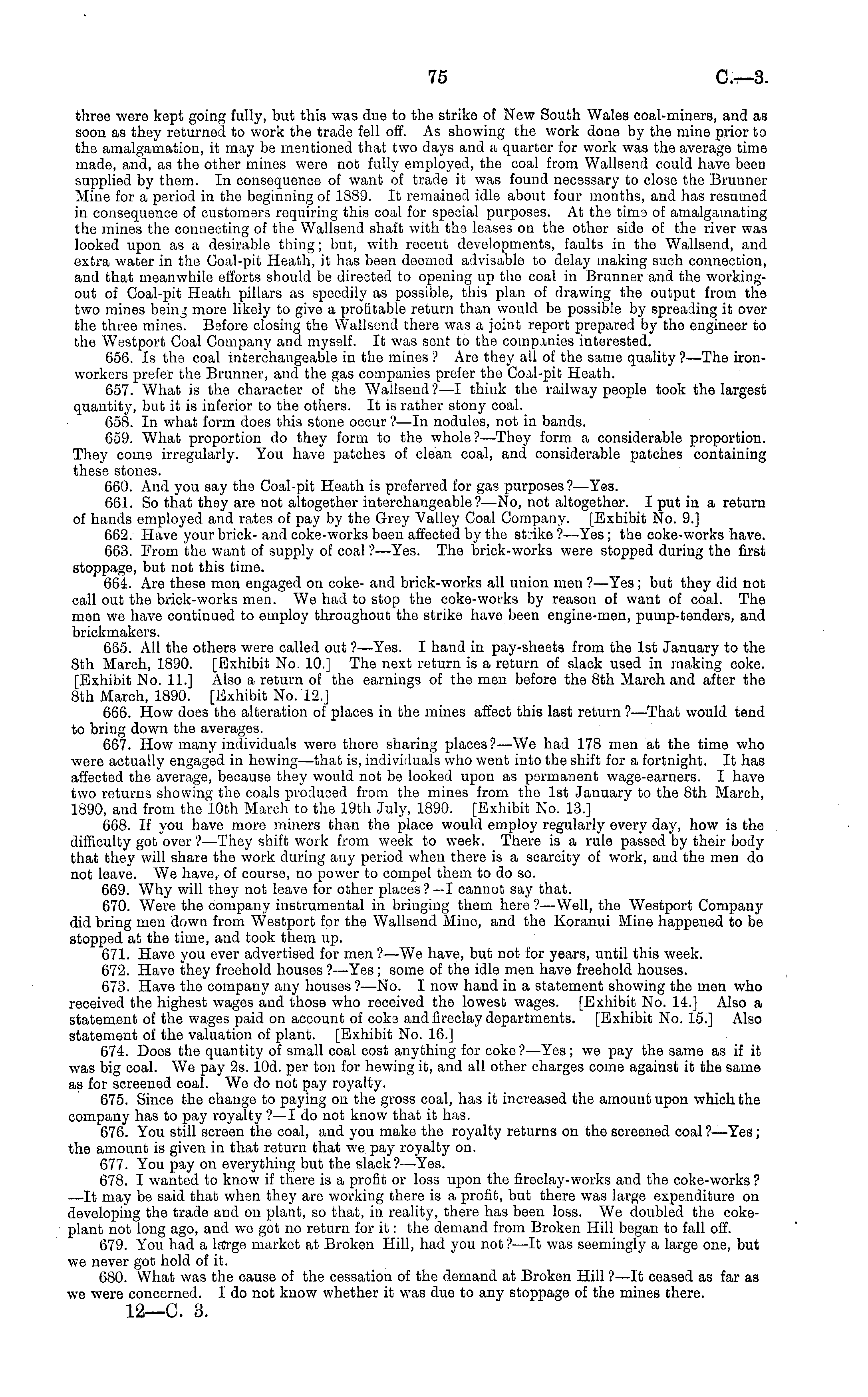 three were kept going fully, but this was due to the strike of New South Wales coal-miners, and as soon as they returned to work the trade fell off. As showing the work done by the mine prior to the amalgamation, it may be mentioned that two days and a quarter for work was the average time made, and, as the other mines were not fully employed, the coal from Wallsend could have been supplied by them. In consequence of want of trade it was found necessary to close the Brunner Mine for a period in the beginning of 1889. It remained idle about four months, and has resumed in consequence of customers requiring this coal for special purposes. At the time of amalgamating the mines the connecting of the Wallsend shaft with the leases on the other side of the river was looked upon as a desirable thing; but, with recent developments, faults in the Wallsend, and extra water in the Coal-pit Heath, it has been deemed advisable to delay making such connection, and that meanwhile efforts should be directed to opening up the coal in Brunner and the workingout of Coal-pit Heath pillars as speedily as possible, this plan of drawing the output from the two mines being more likely to give a profitable return than would be possible by spreading it over the three mines. Before closing the Wallsend there was a joint report prepared by the engineer to the Westport Coal Company and myself. It was sent to the companies interested. 656. Is the coal interchangeable in the mines ? Are they all of the same quality ?—The ironworkers prefer the Brunner, and the gas companies prefer the Coal-pit Heath. 657. What is the character of the Wallsend?—l think the railway people took the largest quantity, but it is inferior to the others. It is rather stony coal. 658. In what form does this stone occur ?—ln nodules, not in bands. 659. What proportion do they form to the whole?— They form a considerable proportion. They come irregularly. You have patches of clean coal, and considerable patches containing these stones. 660. And you say the Coal-pit Heath is preferred for gas purposes?— Yes. 661. So that they are not altogether interchangeable?—No, not altogether. I put in a return of hands employed and rates of pay by the Grey Valley Coal Company. [Exhibit No. 9.] 662. Have your brick- and coke-works been affected by the strike ?—Yes; the coke-works have. 663. From the want of supply of coal ?—Yes. The brick-works were stopped during the first stoppage, but not this time. 664. Are these men engaged on coke- and brick-works all union men ? —Yes; but they did not call out the brick-works men. We had to stop the coke-works by reason of want of coal. The men we have continued to employ throughout the strike have been engine-men, pump-tenders, and brickmakers. 665. All the others were called out ?—Yes. I hand in pay-sheets from the Ist January to the Bth March, 1890. [Exhibit No. 10.] The next return is a return of slack used in making coke. [Exhibit No. 11.] Also a return of the earnings of the men before the Bth March and after the Bth March, 1890. [Exhibit No. 12.] 666. How does the alteration of places in the mines affect this last return ?—That would tend to bring down the averages. 667. How many individuals were there sharing places?—We had 178 men at the time who were actually engaged in hewing—that is, individuals who went into the shift for a fortnight. It has affected the average, because they would not be looked upon as permanent wage-earners. I have two returns showing the coals produced from the mines from the Ist January to the Bth March, 1890, and from the 10th March to the 19th July, 1890. [Exhibit No. 13.] 668. If you have more miners than the place would employ regularly every day, how is the difficulty got over ?—They shift work from week to week. There is a rule passed by their body that they will share the work during any period when there is a scarcity of work, and the men do not leave. We have,- of course, no power to compel them to do so. 669. Why will they not leave for other places ?—I cannot say that. 670. Were the company instrumental in bringing them here ?—Well, the Westport Company did bring men down from Westport for the Wallsend Mine, and the Koranui Mine happened to be stopped at the time, and took them up. 671. Have you ever advertised for men ?—We have, but not for years, until this week. 672. Have they freehold houses ?—Yes ; some of the idle men have freehold houses. 673. Have the company any houses ?—No. I now hand in a statement showing the men who received the highest wages and those who received the lowest wages. [Exhibit No. 14.] Also a statement of the wages paid on account of coks and fireclay departments. [Exhibit No. 15.] Also statement of the valuation of plant. [Exhibit No. 16.] 674. Does the quantity of small coal cost anything for coke ? —Yes ; we pay the same as if it was big coal. We pay 2s. lOd. per ton for hewing it, and all other charges come against it the same as for screened coal. We do not pay royalty. 675. Since the change to paying on the gross coal, has it increased the amount upon which the company has to pay royalty ?—I do not know that it has. 676. You still screen the coal, and you make the royalty returns on the screened coal ?—Yes; the amount is given in that return that we pay royalty on. 677. You pay on everything but the slack?— Yes. 678. I wanted to know if there is a profit or loss upon the fireclay-works and the coke-works ? —It may be said that when they are working there is a profit, but there was large expenditure on developing the trade and on plant, so that, in reality, there has been loss. We doubled the cokeplant not long ago, and we got no return for it: the demand from Broken Hill began to fall off. 679. You had a large market at Broken Hill, had you not'?—It was seemingly a large one, but we never got hold of it. 680. What was the cause of the cessation of the demand at Broken Hill ?—lt ceased as fa