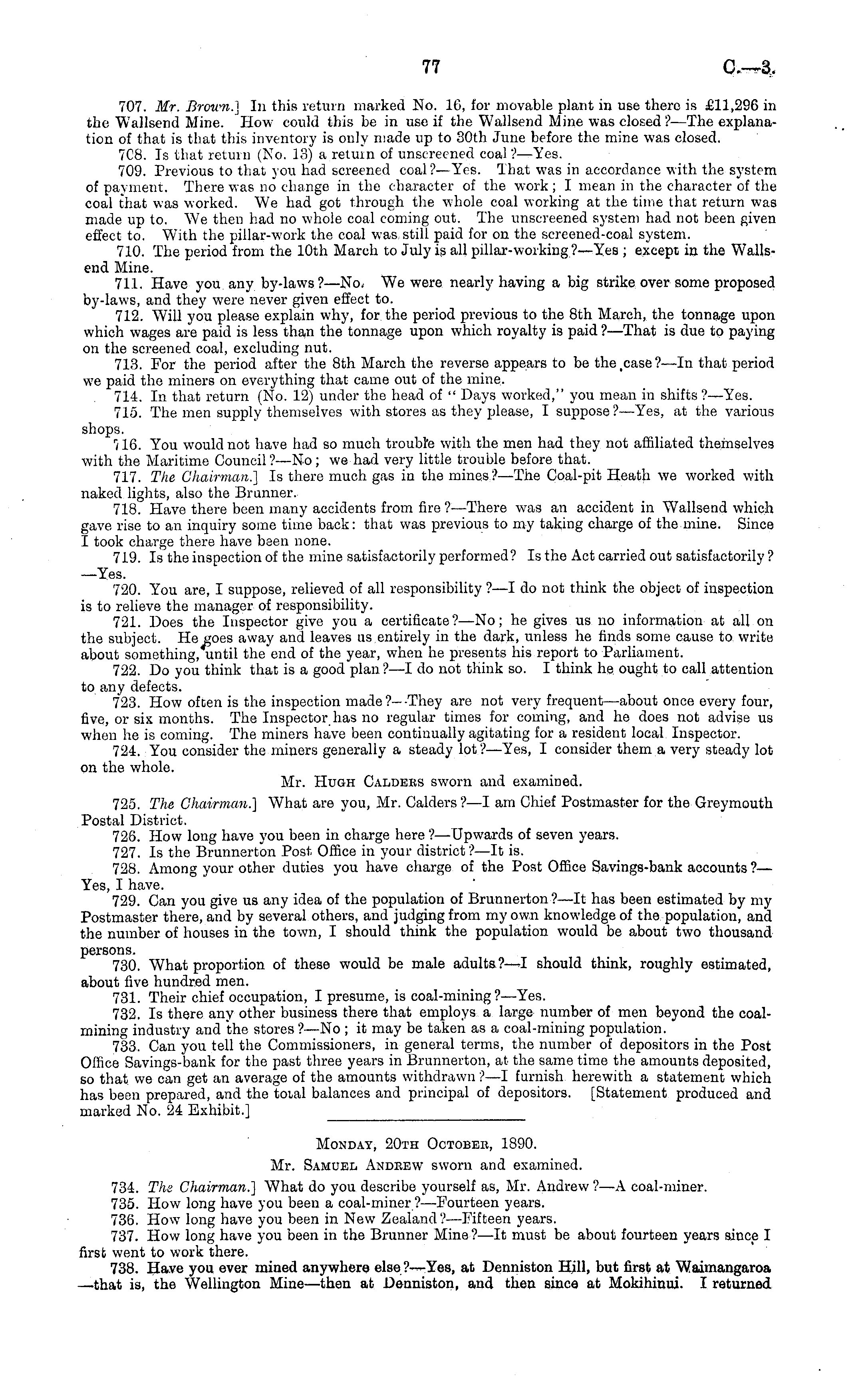 Monday, 20th Octobee, 1890. Mr. Samuel Andbew sworn and examined. 734. The Chairman.] What do you describe yourself as, Mr. Andrew ?—A coal-miner. 735. How long have you been a coal-miner ? —Fourteen years. 736. How long have you been in New Zealand ?—Fifteen years. 737. How long have you been in the Brunner Mine?—lt must be about fourteen years since I first went to work there. 738. Have you ever mined anywhere else ?—Yes, at Denniston Hill, but first at Waimangaroa —that is, the Wellington Mme —then at Denniston, and then since at Mokihinui. I returned