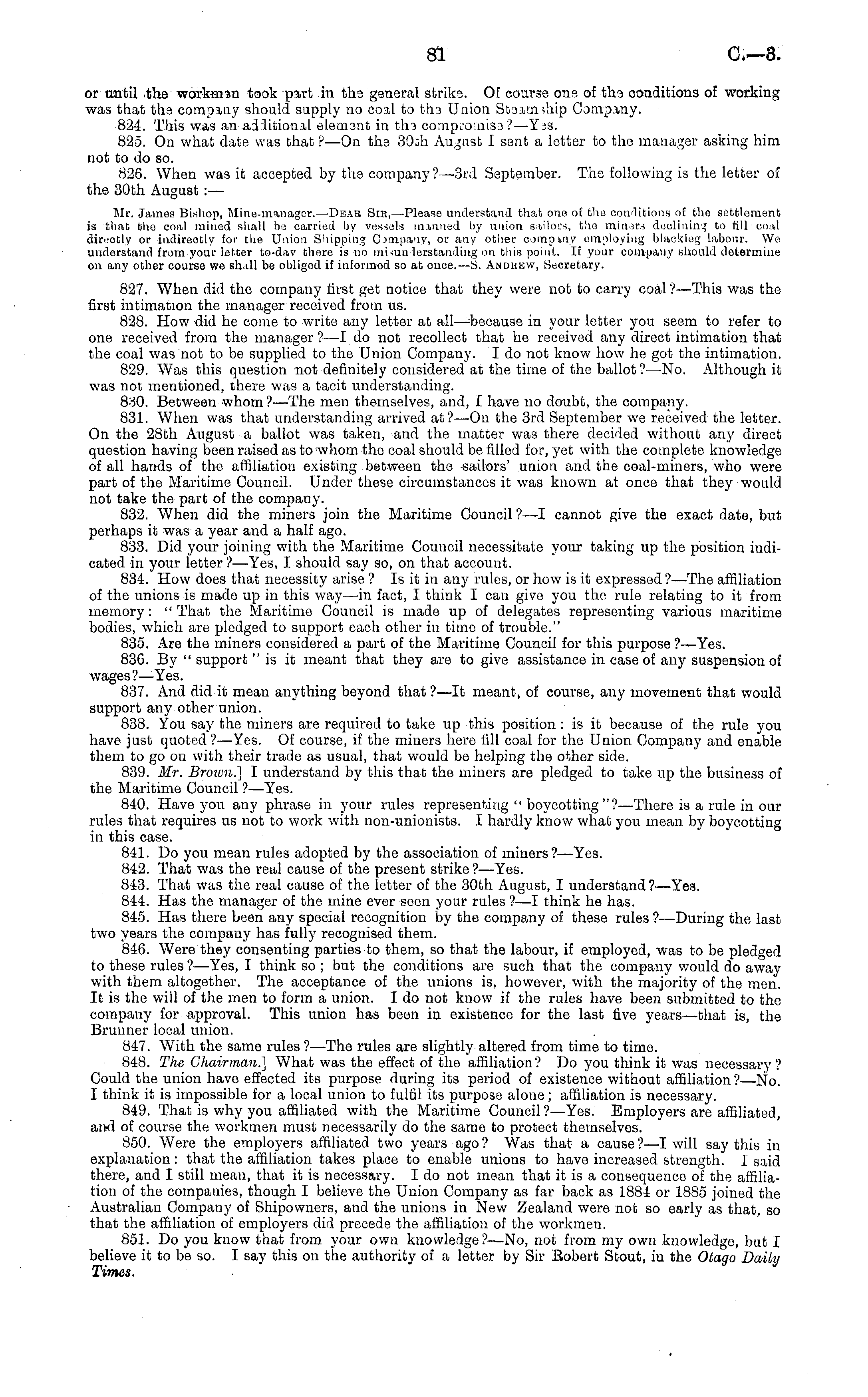 or until the workman took part in the general strike. Oi course ons of th.3 conditions of working was that the company should supply no coal to the Union Sbeatmhip Company. 824. This was an additional element in the coTipi'omise?—Yjs. 825. On what date was that P—On the 30th August I sent a letter to the manager asking him not to do so. 826. When was it accepted by the company ?—3rd September. The following is the letter of the 30th August : — Mr. James Bishop, Mine-manager.—Dkae Sib, —Please understand that one of tho conditions of the settlement is that tho coal mined shall be carried by vessels manned by union sailors, tho miners declining to fill coal directly or indirectly for the Union Shipping Company, or any otiier coma my employing blackleg labour. We understand from your letter to-day there is no rni-mn lorstanding on this point. If your company should dotermiue on any other course we shall be obliged if informed so at once.—S. Anuhbw, Secretary. 827. When did the company first get notice that they were not to carry coal ?—This was the first intimation the manager received from us. 828. How did he come to write any letter at all—because in your letter you seem to refer to one received from the manager ? —I do not recollect that he received any direct intimation that the coal was not to be supplied to the Union Company. Ido not know how he got the intimation. 829. Was this question not definitely considered at the time of the ballot?— No. Although it was not mentioned, there was a tacit understanding. 830. Between whom ?—The men themselves, and, I have no doubt, the company. 831. When was that understanding arrived at?—-On the 3rd September we received the letter. On the 28th August a ballot was taken, and the matter was there decided without any direct question having been raised as to whom the coal should be tilled for, yet with the complete knowledge of all hands of the affiliation existing between the sailors' union and the coal-miners, who were part of the Maritime Council. Under these circumstances it was known at once that they would not take the part of the company. 832. When did the miners join the Maritime Council ? —I cannot give the exact date, but perhaps it was a year and a half ago. 833. Did your joining with the Maritime Council necessitate your taking up the position indicated in your letter ?—-Yes, I should say so, on that account. 834. How does that necessity arise ? Is it in any rules, or how is it expressed ?—The affiliation of the unions is made up in this way—in fact, I think I can give you the rule relating to it from memory: "That the Maritime Council is made up of delegates representing various maritime bodies, which are pledged to support each other in time of trouble." 835. Are the miners considered a part of the Maritime Council for this purpose ? —Yes. 836. By " support " is it meant that they are to give assistance in case of any suspension of wages? —Yes. 837. And did it mean anything beyond that ?—lt meant, of course, any movement that would support any other union. 838. You say the miners are required to take up this position : is it because of the rule you have just quoted?— Yes. Of course, if the miners here fill coal for the Union Company and enable them to go on with their trade as usual, that would be helping the other side. 839. Mr. Brown.] I understand by this that the miners are pledged to take up the business of the Maritime Council ? —Yes. 840. Have you any phrase in your rules representing " boycotting "?—There is a rule in our rules that requires us not to work with non-unionists. I hardly know what you mean by boycotting in this case. 841. Do you mean rules adopted by the association of miners?— Yes. 842. That was the real cause of the present strike ?—Yes. 843. That was the real cause of the letter of the 30th August, I understand?— Yes. 844. Has the manager of the mine ever seen your rules ?—I think he has. 845. Has there been any special recognition by the company of these rules ?—During the last two years the company has fully recognised them. 846. Were they consenting parties to them, so that the labour, if employed, was to be pledged to these rules ?—Yes, I think so ; but the conditions are such that the company would do away with them altogether. The acceptance of the unions is, however, with the majority of the men. It is the will of the men to form a union. Ido not know if the rules have been submitted to the company for approval. This union has been in existence for the last five years—that is, the Brunner local union. 847. With the same rules ?—The rules are slightly altered from time to time. 848. The Chairman.] What was the effect of the affiliation? Do you think it was necessary? Could the union have effected its purpose during its period of existence without affiliation?— No. I think it is impossible for a local union to fulfil its purpose alone; affiliation is necessary. 849. That is why you affiliated with the Maritime Council?— Yes. Employers are affiliated, and of course the workmen must necessarily do the same to protect themselves. 850. Were the employers affiliated two years ago? Was that a cause?—l will say this in explanation: that the affiliation takes place to enable unions to have increased strength. I said there, and I still mean, that it is necessary. Ido not mean that it is a consequence of the affiliation of the compauies, though I believe the Union Company as far back as 1884 or 1885 joined the Australian Company of Shipowners, and the unions in New Zealand were not so early as that, so that the affiliation of employers did precede the affiliation of the workmen. 851. Do you know that from your own knowledge?—No, not from my own knowledge, but I believe it to be so. I say this on the authority of a letter by Sir Bobert Stout, in the Otago Daily Times.