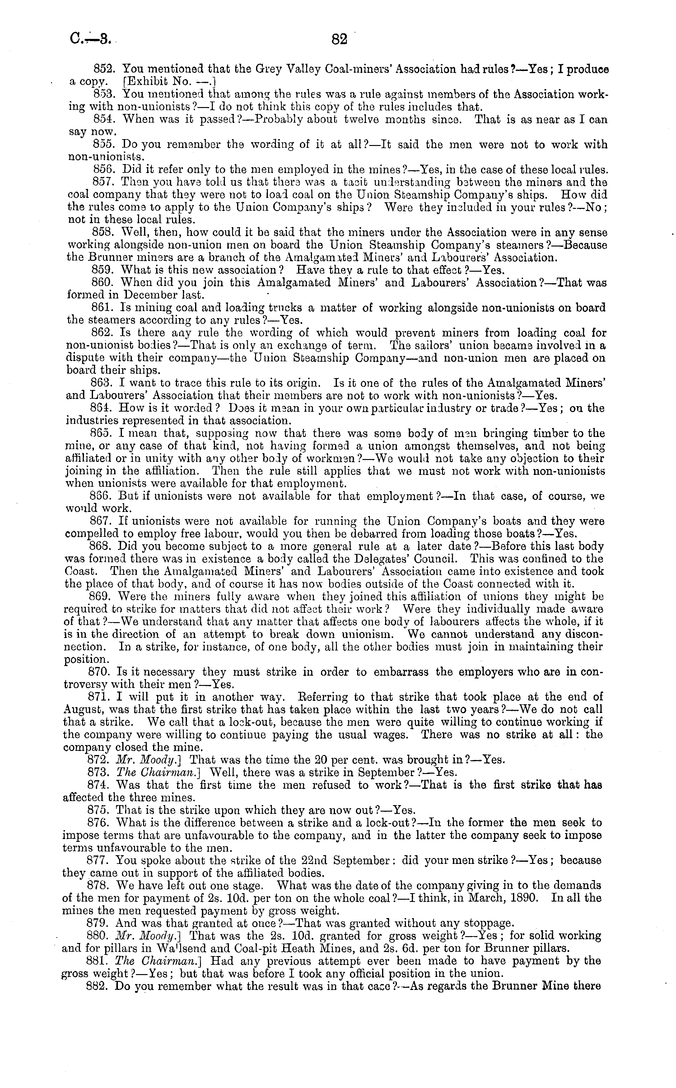 852. You mentioned that the Grey Valley Coal-miners' Association had rules?— Yes; I produce a copy. [Exhibit No. —.] 853. You mentioned that among the rules was a rule against members of the Association working with non-unionists?—l do not think this copy of the rules includes that. 854. When was it passed ?—Probably about twelve months since. That is as near as I can say now. 855. Do you remember the wording of it at all ?—lt said the men were not to work with non-unionists. 856. Did it refer only to the men employed in the mines?— Yes, in the case of these local rules. 857. Then you have told us that there was a tacit understanding between the miners and the coal company that they were not to load coal on the Union Steamship Company's ships. How did the rules come to apply to the Union Company's ships ? Were they included in your rules ?—No ; not in these local rules. 858. Well, then, how could it be said that the miners under the Association were in any sense working alongside non-union men on board the Union Steamship Company's steamers?— Because the Brunner miners are a branch of the Amalgamated Miners' and Labourers' Association. 859. What is this new association ? Have they a rule to that effect ? —Yes. 860. When did you join this Amalgamated Miners' and Labourers' Association ?—That was formed in December last. 861. Is mining coal and loading trucks a matter of working alongside non-unionists on board the steamers according to any rules?— Yes. 862. Is there any rule the wording of which would prevent miners from loading coal for non-unionist bodies ?—That is only an exchange of term. The sailors' union became involved in a dispute with their company—tho Union Steamship Company—and non-union men are placed on board their ships. 863. I want to trace this rule to its origin. Is it one of the rules of the Amalgamated Miners' and Labourers' Association that their members are not to work with non-unionists ?—Yes. 834. How is it worded? Does it maan in your own particular industry or trade?— Yes; on the industries represented in that association. 865. I mean that, supposing now that there was some body of men bringing timber to the mine, or any case of that kind, not having formed a union amongst themselves, and not being affiliated or in unity with any other body of workmen?—We would not take any objection to their joining in the affiliation. Then the rule still applies that we must not work with non-unionists when unionists were available for that employment. 856. But if unionists were not available for that employment ?—ln that case, of course, we would work. 867. If unionists were not available for running the Union Company's boats and they were compelled to employ free labour, would you then be debarred from loading those boats ?—Yes. 868. Did you become subject to a more general rule at a later date ?—Before this last body was formed there was in existence a body called the Delegates' Council. This was confined to the Coast. Then the Amalgamated Miners' and Labourers' Association came into existence and took the place of that body, and of course it has now bodies outside of the Coast connected with it. 869. Were the miners fully aware when they joined this affiliation of unions they might be required to strike for matters that did not affect their work ? Were they individually made aware of that ?—We understand that any matter that affects one body of labourers affects the whole, if it is in the direction of an attempt to break down unionism. We cannot understand any disconnection. In a strike, for instance, of one body, all the other bodies must join in maintaining their position. 870. Is it necessary they must strike in order to embarrass the employers who are in controversy with their men ?—Yes. 871. I will put it in another way. Beferring to that strike that took place at the end of August, was that the first strike that has taken place within the last two years ?—We do not call that a strike. We call that a lock-out, because the men were quite willing to continue working if the company were willing to continue paying the usual wages. There was no strike at all: the company closed the mine. 872. Mr. Moody.] That was the time the 20 per cent, was brought in?— Yes. 873. The Chairman.] Well, there was a strike in September ?—Yes. 874. Was that the first time the men refused to work?— That is the first strike that has affected the three mines. 875. That is the strike upon which they are now out?— Yes. 876. What is the difference between a strike and a lock-out ? —lu the former the men seek to impose terms that are unfavourable to the compauy, and in the latter the company seek to impose terms unfavourable to the men. 877. You spoke about the strike of the 22nd September : did your men strike ?—Yes; because they came out in support of the affiliated bodies. 878. We have left out one stage. What was the date of the company giving in to the demands of the men for payment of 2s. lOd. per ton on the whole coal ?—I think, in March, 1890. In all the mines the men requested payment by gross weight. 879. And was that granted at once ? —That was granted without any stoppage. 880. Mr. Moody.] That was the 2s. lOd. granted for gross weight ?—Yes; for solid working and for pillars in Wa'lsend and Coal-pit Heath Mines, and 2s. 6d. per ton for Brunner pillars. 881. The Chairman.] Had any previous attempt ever been made to have payment by the gross weight ?—Yes; but that was before I took any official position in the union. 882. Do you remember what the result was in that cace?—As regards the Brunner Mine there