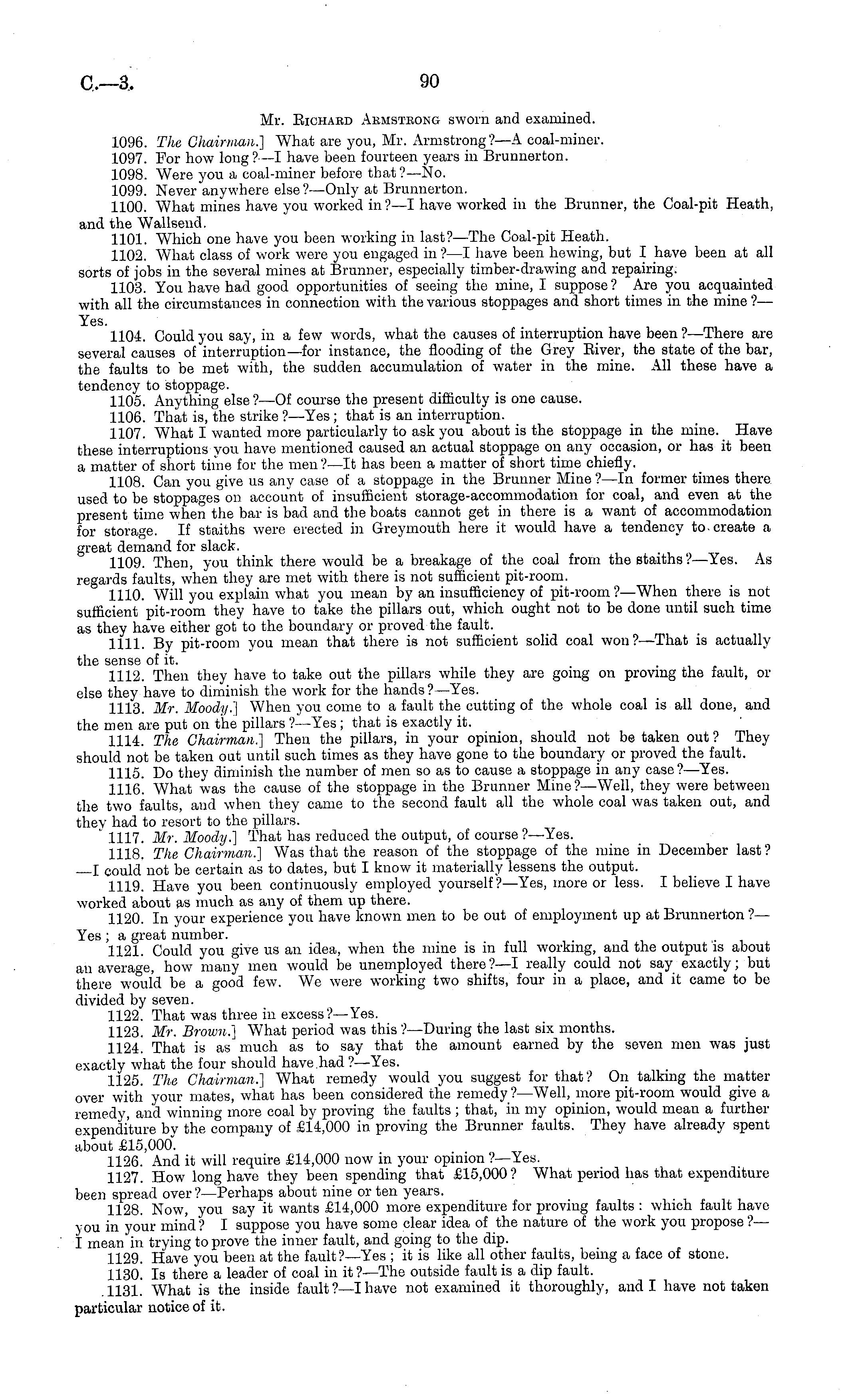 Mr. Eichaed Akmstkong sworn and examined. 1096. The Chairman.] What are you, Mr. Armstrong?—A coal-miner. 1097. For how long? —I have been fourteen years in Brunnerton. 1098. Were you a coal-miner before that ?—No. 1099. Never anywhere else ?—Only at Brunnerton. 1100. What mines have you worked in ? —I have worked in the Brunner, the Coal-pit Heath, and the Wallsend. 1101. Which one have you been working in last?— The Coal-pit Heath. 1102. What class of work were you engaged in? —I have been hewing, but I have been at all sorts of jobs in the several mines at Brunner, especially timber-drawing and repairing. 1103. You have had good opportunities of seeing the mine, I suppose ? Are you acquainted with all the circumstances in connection with the various stoppages and short times in the mine ?— Yes. 1104. Could you say, in a few words, what the causes of interruption have been ? —There are several causes of interruption—for instance, the flooding of the Grey Eiver, the state of the bar, the faults to be met with, the sudden accumulation of water in the mine. All these have a tendency to stoppage. 1105. Anything else?—Of course the present difficulty is one cause. 1106. That is, the strike ? —Yes; that is an interruption. 1107. What I wanted more particularly to ask you about is the stoppage in the mine. Have these interruptions you have mentioned caused an actual stoppage on any occasion, or has it been a matter of short time for the men?—lt has been a matter of short time chiefly. 1108. Can you give us any case of a stoppage in the Brunner Mine ?—ln former times there used to be stoppages on account of insufficient storage-accommodation for coal, and even at the present time when the bar is bad and the boats cannot get in there is a want of accommodation for storage. If staiths were erected in Greymouth here it would have a tendency to create a great demand for slack. 1109. Then, you think there would be a breakage of the coal from the staiths?—Yes. As regards faults, when they are met with there is not sufficient pit-room. 1110. Will you explain what you mean by an insufficiency of pit-room ? —When there is not sufficient pit-room they have to take the pillars out, which ought not to be done until such time as they have either got to the boundary or proved the fault. 1111. By pit-room you mean that there is not sufficient solid coal won?— That is actually the sense of it. 1112. Then they have to take out the pillars while they are going on proving the fault, or else they have to diminish the work for the hands?— Yes. 1113. Mr. Moody.] When you come to a fault the cutting of the whole coal is all done, and the men are put on the pillars ?—Yes ; that is exactly it. 1114. The Chairman.] Then the pillars, in your opinion, should not be taken out ? They should not be taken out until such times as they have gone to the boundary or proved the fault. 1115. Do they diminish the number of men so as to cause a stoppage in any case?— Yes. 1116. What was the cause of the stoppage in the Brunner Mine ? —Well, they were between the two faults, and when they came to the second fault all the whole coal was taken out, and they had to resort to the pillars. ' 1117. Mr. Moody.] That has reduced the output, of course ?—Yes. 1118. The Chairman.] Was that the reason of the stoppage of the mine in December last ? I could not be certain as to dates, but I know it materially lessens the output. 1119. Have you been continuously employed yourself? —Yes, more or less. I believe I have worked about as much as any of them up there. 1120. In your experience you have known men to be out of employment up at Brunnerton? — Yes ; a great number. 1121. Could you give us an idea, when the mine is in full working, and the output is about an average, how many men would be unemployed there? —I really could not say exactly; but there would be a good few. We were working two shifts, four in a place, and it came to be divided by seven. 1122. That was three in excess? —Yes. 1123. Mr. Brown.] What period was this ? —During the last six months. 1124. That is as much as to say that the amount earned by the seven men was just exactly what the four should have had? —Yes. 1125. The Chairman.] What remedy would you suggest for that? On talking the matter over with your mates, what has been considered the remedy ?—Well, more pit-room would give a remedy, and winning more coal by proving the faults ; that, in my opinion, would mean a further expenditure by the company of £14,000 in proving the Brunner faults. They have already spent about £15,000". 1126. And it will require £14,000 now in your opinion ?—Yes. 1127. How long have they been spending that £15,000? What period has that expenditure been spread over? —Perhaps about nine or ten years. 1128. Now, you say it wants £14,000 more expenditure for proving faults : which fault have you in your mind ? I suppose you have some clear idea of the nature of the work you propose ?— I mean in trying to prove the inner fault, and going to the dip. 1129. Have you been at the fault? —Yes ; it is like all other faults, being a face of stone. 1130. Is there a leader of coal in it?— The outside fault is a dip fault. .1131. What is the inside fault ?—I have not examined it thoroughly, audi have not taken particular notice of it.