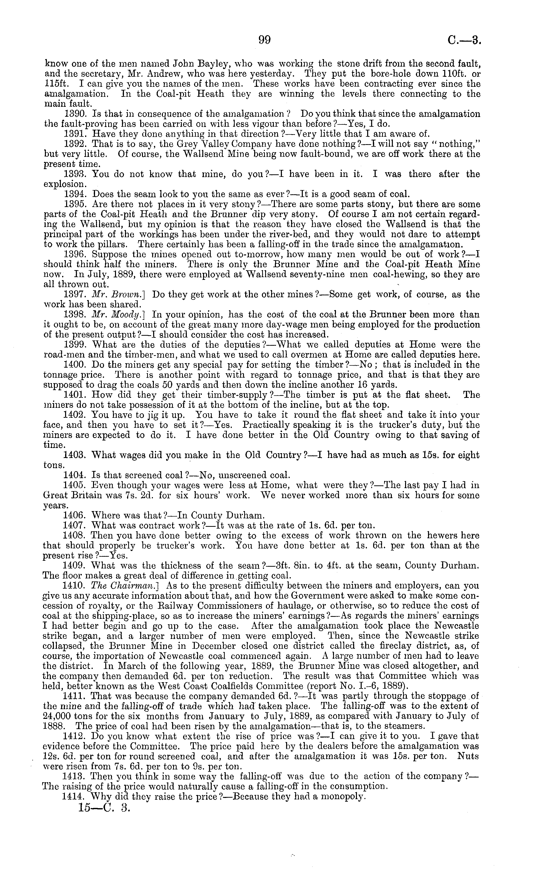 know one of the men named John Bayley, who was working the stone drift from the second fault, and the secretary, Mr. Andrew, who was here yesterday. They put the bore-hole down 110 ft. or 115 ft. I can give you the names of the men. These works have been contracting ever since the amalgamation. In the Coal-pit Heath they are winning the levels there connecting to the main fault. 1390. Is that in consequence of the amalgamation ? Do you think that since the amalgamation the fault-proving has been carried on with less vigour than before ?—Yes, I do. 1391. Have they done anything in that direction ? —Very little that I am aware of. 1392. That is to say, the Grey Valley Company have done nothing?—l will not say "nothing," but very little. Of course, the Wallsend Mine being now fault-bound, we are off work there at the present time. 1393. You do not know that mine, do you? —I have been in it. I was there after the explosion. 1394. Does the seam look to you the same as ever ?—lt is a good seam of coal. 1395. Are there not places in it very stony ?—There are some parts stony, but there are some parts of the Coal-pit Heath and the Brunner dip very stony. Of course lam not certain regarding the Wallsend, but my opinion is that the reason they have closed the Wallsend is that the principal part of the workings has been under the river-bed, and they would not dare to attempt to work the pillars. There certainly has been a falling-off in the trade since the amalgamation. 1396. Suppose the mines opened out to-morrow, how many men would be out of work ?—I should think half the miners. There is only the Brunner Mine and the Coal-pit Heath Mine now. In July, 1889, there were employed at Wallsend seventy-nine men coal-hewing, so they are all thrown out. 1397. Mr. Brown.] Do they get work at the other mines ?—Some get work, of course, as the work has been shared. 1398. Mr. Moody.] In your opinion, has the cost of the coal at the Brunner been more than it ought to be, on account of the great many more day-wage men being employed for the production of the present output?—l should consider the cost has increased. 1399. What are the duties of the deputies ? —What we called deputies at Home were the road-men and the timber-men, and what we used to call overmen at Home are called deputies here. 1400. Do the miners get any special pay for setting the timber ? —No ; that is included in the tonnage price. There is another point with regard to tonnage price, and that is that they are supposed to drag the coals 50 yards and then down the incline another 16 yards. 1401. How did they get their timber-supply?— The timber is put at the flat sheet. The miners do not take possession of it at the bottom of the incline, but at the top. 1402. You have to jig it up. You have to take it round the flat sheet and take it into your face, and then you have to set it ?—Yes. Practically speaking it is the trucker's duty, but the miners are expected to do it. I have done better in the Old Country owing to that saving of time. 1403. What wages did you make in the Old Country ? —I have had as much as 15s. for eight tons. 1404. Is that screened coal ?—No, unscreened coal. 1405. Even though your wages were less at Home, what were they ?—Tho last pay I had in Great Britain was 7s. 2d. for six hours' work. We never worked more than six hours for some years. 1406. Where was that ? —ln County Durham. 1407. What was contract work?—lt was at the rate of Is. 6d. per ton. 1408. Then you have done better owing to the excess of work thrown on the hewers here that should properly be trucker's work. You have done better at Is. 6d. per ton than at the present rise ?—Yes. 1409. What was the thickness of the seam?—3ft. Bm. to 4ft. at the seam, County Durham. The floor makes a great deal of difference in getting coal. 1410. The As to the present difficulty between the miners and employers, can you give us any accurate information about that, and how the Government were asked to make some concession of royalty, or the Eailway Commissioners of haulage, or otherwise, so to reduce the cost of coal at the shipping-place, so as to increase the miners' earnings?—As regards the miners' earnings I had better begin and go up to the case. After the amalgamation took place the Newcastle strike began, and a larger number of men were employed. Then, since the Newcastle strike collapsed, the Brunner Mine in December closed one district called the fireclay district, as, of course, the importation of Newcastle coal commenced again. A large number of men had to leave the district. In March of the following year, 1889, the Brunner Mine was closed altogether, and the company then demanded 6d. per ton reduction. The result was that Committee which was held, bettor known as the West Coast Coalfields Committee (report No. 1.-6, 1889). 1411. That was because the company demanded 6d. ? —lt was partly through the stoppage of the mine and the falling-off of trade which had taken place. The falling-off was to the extent of 24,000 tons for the six months from January to July, 1889, as compared with January to July of 1888. The price of coal had been risen by the amalgamation —that is, to the steamers. 1412. Do you know what extent the rise of price was ?—I can give it to you. I gave that evidence before the Committee. The price paid here by the dealers before the amalgamation was 12s. 6d. per ton for round screened coal, and after the amalgamation it was 15s. per ton. Nuts were risen from 7s. 6d. per ton to 9s. per ton. 1413. Then you think in some way tho falling-off was due to the action of the company ?— The raising of the price would naturally cause a falling-off in the consumption. 1414. Why did they raise the price ?—Because they had a monopoly. 15—C. 3.