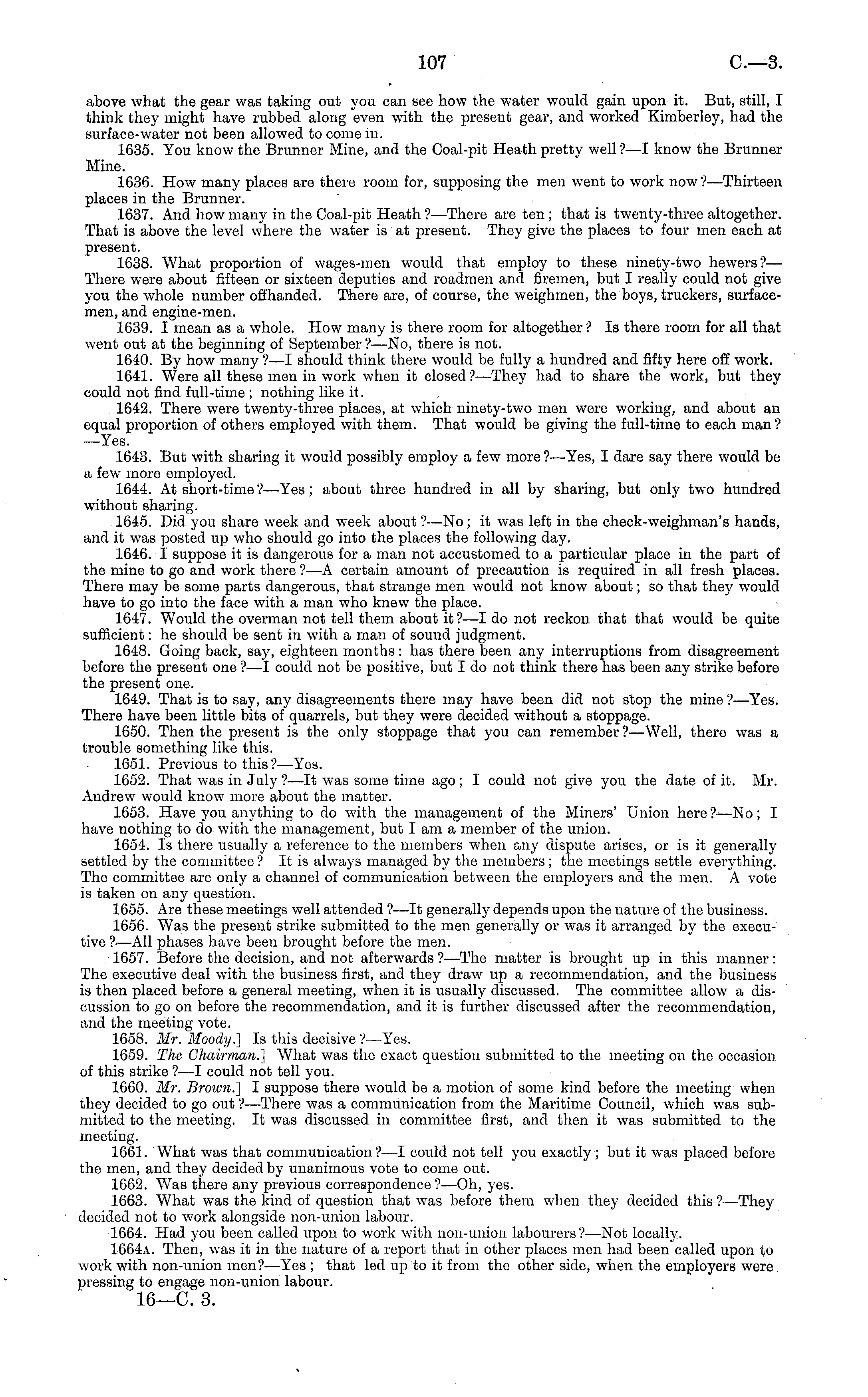 above what the gear w 7 as taking out you can see how the water would gain upon it. But, still, I think they might have rubbed along even w 7 ith the present gear, and worked Kimberley, had the surface-water not been allowed to come in. 1635. You know the Brunner Mine, and the Coal-pit Heath pretty well ? —I know the Brunner Mine. 1636. How many places are there room for, supposing the men went to work now? —Thirteen places in the Brunner. 1637. And bow many in the Coal-pit Heath ? —There are ten; that is twenty-three altogether. That is above the level where the water is at present. They give the places to four men each at present. 1638. What proportion of wages-men would that employ to these ninety-two hewers?— There were about fifteen or sixteen deputies and roadmen and firemen, but I really could not give you the whole number offhanded. There are, of course, the weighmen, the boys, truckers, surfacemen, and engine-men. 1639. I mean as a whole. How many is there room for altogether ? Is there room for all that went out at the beginning of September ? —No, there is not. 1640. By how many ?—I should think there would be fully a hundred and fifty here off work. 1641. Were all these men in work when it closed?— They had to share the work, but they could not find full-time ; nothing like it. 1642. There were twenty-three places, at which ninety-two men w 7 ere working, and about an equal proportion of others employed w 7 ith them. That would be giving the full-time to each man ? —Yes. 1643. But with sharing it would possibly employ a few more ?—Yes, I dare say there would be a few 7 more employed. 1644. At short-time?— Yes; about three hundred in all by sharing, but only two hundred without sharing. 1645. Did you share week and week about?—No; it was left in the check-weighman's hands, and it was posted up who should go into the places the following day. 1646. I suppose it is dangerous for a man not accustomed to a particular place in the part of the mine to go and work there ?—A certain amount of precaution is required in all fresh places. There may be some parts dangerous, that strange men would not know about; so that they would have to go into the face with a man who knew the place. 1647. Would the overman not tell them about it?—l do not reckon that that would be quite sufficient: he should be sent in with a man of sound judgment. 1648. Going back, say, eighteen months: has there been any interruptions from disagreement before the present one ?—I could not be positive, but I do not think there has been any strike before the present one. 1649. That is to say, any disagreements there may have been did not stop the mine ?—Yes. There have been little bits of quarrels, but they were decided without a stoppage. 1650. Then the present is the only stoppage that you can remember ?—Well, there was a trouble something like this. 1651. Previous to this?— Yes. 1652. That was in July ?—lt was some time ago; I could not give you the date of it. Mr. Andrew would know more about the matter. 1653. Have you anything to do with the management of the Miners' Union here?—No; I have nothing to do with the management, but I am a member of the union. 1654. Is there usually a reference to the members when any dispute arises, or is it generallysettled by the committee? It is always managed by the members; the meetings settle everything. The committee are only a channel of communication between the employers and the men. A vote is taken on any question. 1655. Are these meetings well attended ?—lt generally depends upon the nature of the business. 1656. Was the present strike submitted to the men generally or was it arranged by the executive ?—All phases have been brought before the men. 1657. Before the decision, and not afterwards ?—The matter is brought up in this manner: The executive deal with the business first, and they draw up a recommendation, and the business is then placed before a general meeting, when it is usually discussed. The committee allow a discussion to go on before the recommendation, and it is further discussed after the recommendation, and the meeting vote. 1658. Mr. Moody.] Is this decisive ?—Yes. 1659. The Chairman.] What was the exact question submitted to the meeting on the occasion of this strike ?—I could not tell you. 1660. Mr. Brown.] I suppose there would be a motion of some kind before the meeting when they decided to go out ?—There was a communication from the Maritime Council, which was submitted to the meeting. It was discussed in committee first, and then it was submitted to the meeting. 1661. What was that communication ? —I could not tell you exactly ; but it was placed before the men, and they decided by unanimous vote to come out. 1662. W T as there any previous correspondence?—Oh, yes. 1663. What was the kind of question that was before them when the}' decided this ?—They decided not to work alongside non-union labour. 1664. Had you been called upon to work with non-union labourers?— Not locally. 1664 a. Then, was it in the nature of a report that in other places men had been called upon to work with non-union men?— Yes ; that led up to it from tho other side, when the employers were. pressing to engage non-union labour. 16—C. 3.
