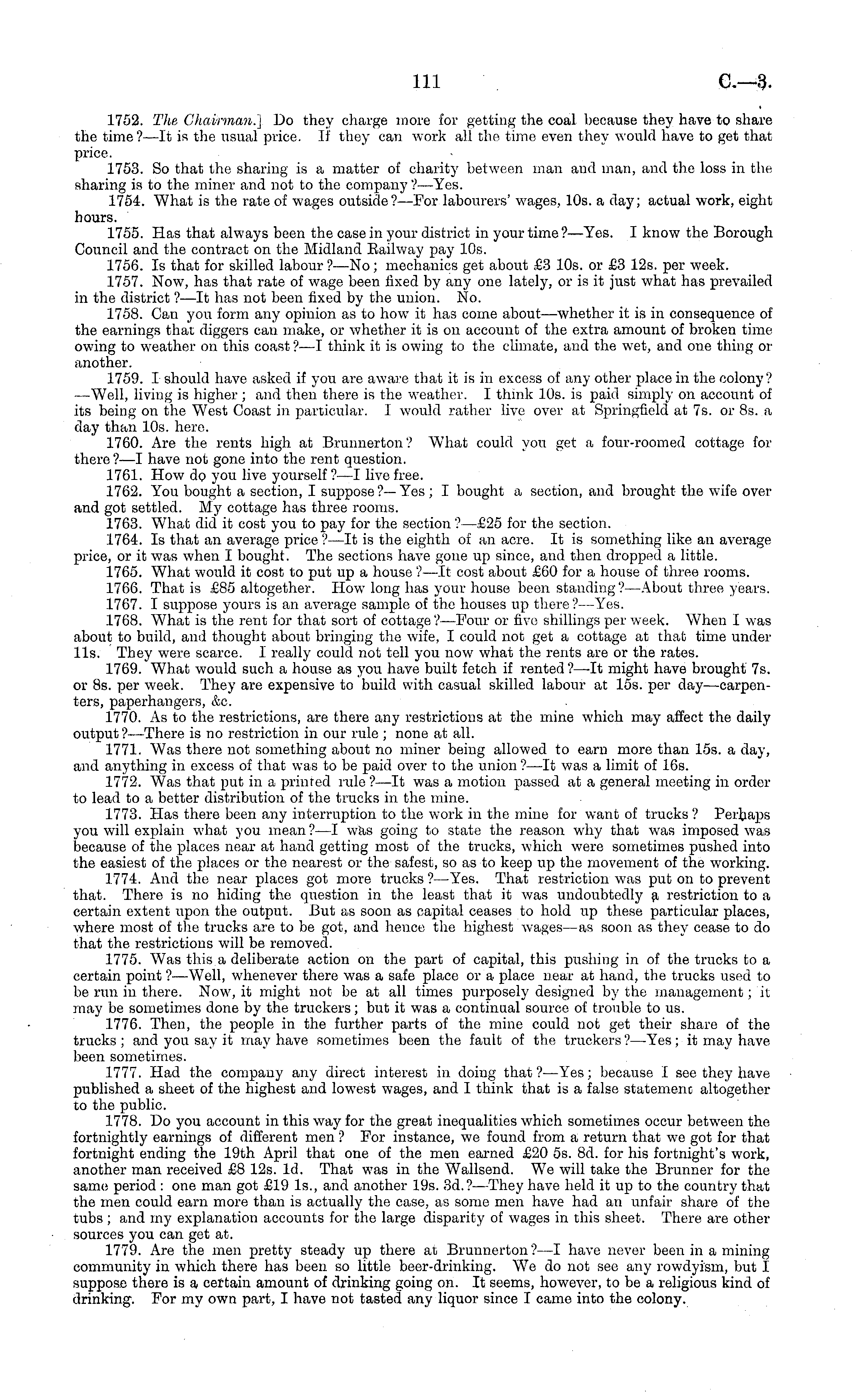 1752. The Chairman.] Do they charge more for getting the coal because they have to share the time?—lt is the usual price. If they can work all the time even they would have to get that price. 1753. So that the sharing is a matter of charity between man and man, and the loss in the sharing is to the miner and not to the company ?—Yes. 1754. What is the rate of wages outside? —For labourers' wages, 10s. a day; actual work, eight hours. 1755. Has that always been the case in your district in your time ?—Yes. I know the Borough Council and the contract on the Midland Eailway pay 10s. 1756. Is that for skilled labour?—No; mechanics get about £3 10s. or £3 12s. per week. 1757. Now, has that rate of wage been fixed by any one lately, or is it just what has prevailed in the district ? —lt has not been fixed by the union. No. 1758. Cam you form any opinion as to how it has come about—whether it is in consequence of the earnings that diggers can make, or whether it is on account of the extra amount of broken time owing to weather on this coast ? —I think it is owing to the climate, and the wet, and one thing or another. 1759. I should have asked if you are aware that it is in excess of any other place in the colony? —Well, living is higher ; and then there is the weather. I think 10s. is paid simply on account of its being on the West Coast in particular. I would rather live over at Springfield at 7s. or Bs. a day than 10s. here. 1760. Are the rents high at Brunnerton? What could you get a four-roomed cottage for there ?—I have not gone into the rent question. 1761. How do you live yourself?—l live free. 1762. You bought a section, I suppose ?— Yes ; I bought a section, and brought the wife over and got settled. My cottage has three rooms. 1763. What did it cost you to pay for the section?—£2s for the section. 1764. Is that an average price ? —lt is the eighth of an acre. It is something like an average price, or it was when I bought. The sections have gone up since, and then dropped a little. 1765. What would it cost to put up a house ?—lt cost about £60 for a house of throe rooms. 1766. That is £85 altogether. How long has your house been standing?— About three years. 1767. I suppose yours is an average sample of the bouses up there?— Yes. 1768. What is the rent for that sort of cottage ?—Four or five shillings per week. When I was about to build, and thought about bringing the wife, I could not get a cottage at that time under lis. They were scarce. I really could not tell you now what the rents are or the rates. 1769. What would such a house as you have built fetch if rented ?—lt might have brought 7s. or Bs. per week. They are expensive to build with casual skilled labour at 15s. per day—carpenters, paperhangers, &c. 1.770. As to the restrictions, are there any restrictions at the mine which m ay affect the daily output ? —There is no restriction in our rule ; none at all. 1771. Was there not something about no miner being allowed to earn more than 15s. a day, and anything in excess of that was to be paid over to the union ?—lt was a limit of 16s. 1772. Was that put in a printed rule ?—lt was a motion passed at a general meeting in order to lead to a better distribution of the trucks in the mine. 1773. Has there been any interruption to the work in the mine for want of trucks? Perhaps you will explain what you mean?—l was going to state the reason, why that w 7 as imposed w 7 as because of the places near at hand getting most of the trucks, which were sometimes pushed into the easiest of the places or the nearest or the safest, so as to keep up the movement of the working. 1774. And the near places got more trucks ? —Yes. That restriction w 7 as put on to prevent that. There is no hiding the question in the least that it was undoubtedly a restriction to a certain extent upon the output. But as soon as capital ceases to hold up these particular places, where most of the trucks are to be got, and hence the highest wage soon as they cease to do that the restrictions will be removed. 1775. Was this a deliberate action on the part of capital, this pushing in of the trucks to a certain point ? —Well, whenever there was a safe place or a place near at hand, the trucks used to be run in there. Now, it might not be at all times purposely designed by the management; it may be sometimes done by the truckers; but it was a continual source of trouble to us. 1776. Then, the people in the further parts of the mine could not get their share of the trucks ; and you say it may have sometimes been the fault of tho truckers ?—Yes; it may have been sometimes. 1777. Had the company any direct interest in doing that? —Yes; because I see they have published a sheet of the highest and low 7 est wages, and I think that is a false statement altogether to the public. 1778. Do you account in this way for the great inequalities which sometimes occur between the fortnightly earnings of different men ? For instance, we found from a return that we got for that fortnight ending the 19th April that one of the men earned £20 ss. Bd. for his fortnight's work, another man received £8 12s. Id. That was in the Wallsend. W 7 e will take the Brunner for the same period : one man got £19 Is., and another 19s. 3d.?— They have held it up to the country that the men could earn more than is actually the case, as some men have had an unfair share of the tubs ; and my explanation accounts for the large disparity of wages in this sheet. There are other sources you can get at. 1779. Are the men pretty steady up there at Brunnerton ?—I have never been in a mining community in which there has been so little beer-drinking. We do not see any rowdyism, but I suppose there is a certain amount of drinking going on. It seems, however, to be a religious kind of drinking. For my own part, I have not tasted any liquor since I came into the colony.
