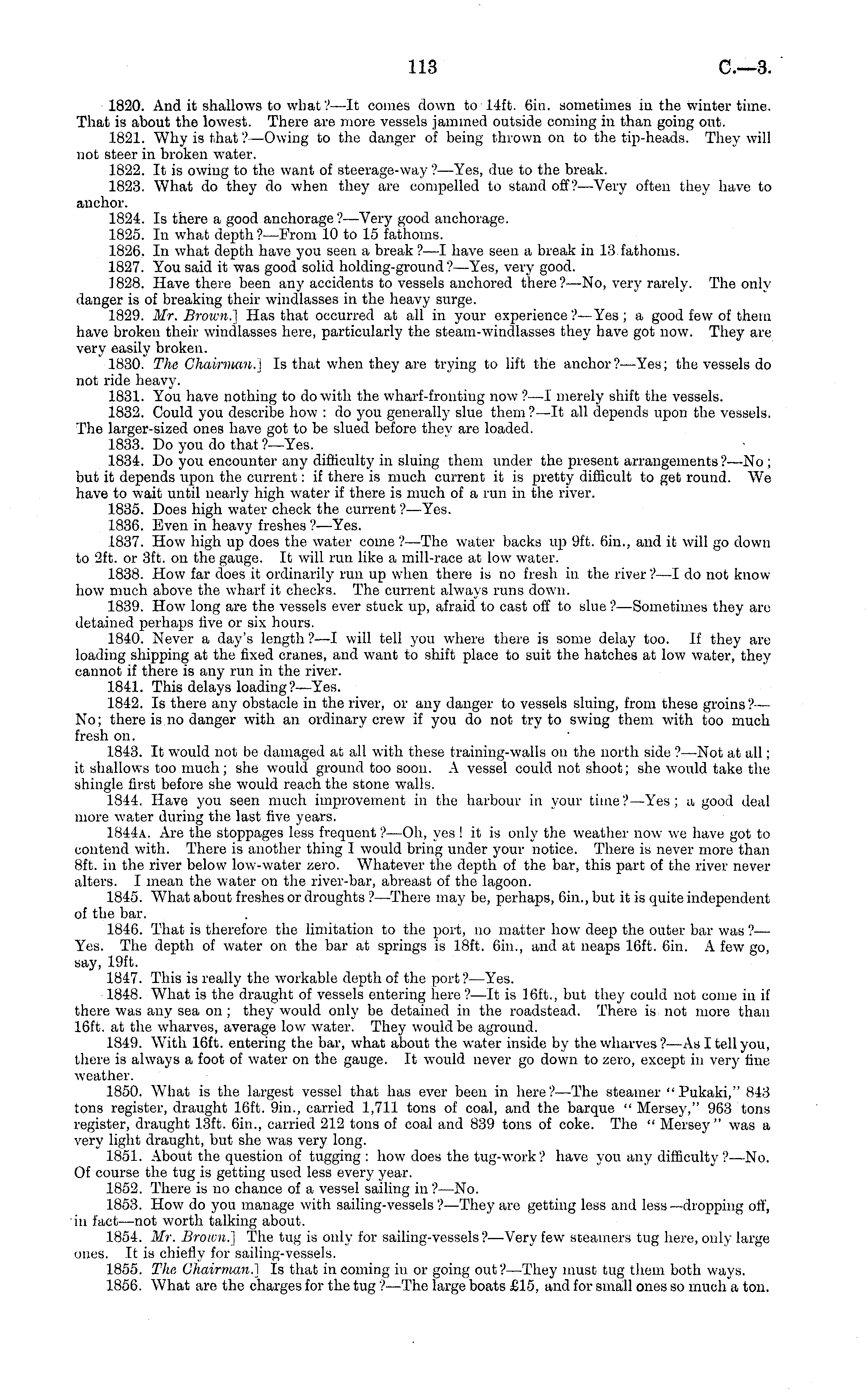 1820. And it shallows to what ?—lt comes down to 14ft. 6in. sometimes in the winter time. That is about the lowest. There are more vessels jammed outside coming in than going out. 1821. Why is that?— Owing to the danger of being thrown on to the tip-heads. They 7 will not steer in broken water. 1822. It is owing to tho want of steerage-way ?—Yes, due to the break. 1823. What do they do when they are compelled to stand off?— Very often they have to anchor. 1824. Is there a good anchorage ? —Very good anchorage. 1825. In what depth ?—From 10 to 15 fathoms. 1826. In what depth have you seen a break ?—I have seen a break in 13 fathoms. 1827. You said it was good solid holding-ground?— Yes, very good. 1828. Have there been any accidents to vessels anchored there?—No, very rarely. The onlydanger is of breaking their windlasses in the heavy surge. 1829. Mr. Brown.] Has that occurred at all in your experience ?—Yes; a good few of them have broken their windlasses here, particularly the steam-windlasses they have got now. They are very easily broken. 1830. The Chairman.] Is that when they are trying to lift the anchor?— Yes; the vessels do not ride heavy. 1831. You have nothing to do with the wharf-fronting now?—l merely shift the vessels. 1832. Could you describe how : do you generally slue them?—lt all depends upon the vessels. The larger-sized ones have got to be slued before they are loaded. 1833. Do you do that ?—Yes. 1834. Do you encounter any difficulty in sluing them under the present arrangements?—No ; but it depends upon the current: if there is much current it is pretty difficult to get round. We have to wait until nearly high water if there is much of a run in the river. 1835. Does high water check the current ? —Yes. 1836. Even in heavy freshes ?—Yes. 1837. How high up does the water come ?—The water backs up Oft. 6in., and it will go down to 2ft. or 3ft. on the gauge. It will run like a mill-race at low water. 1838. How far does it ordinarily run up when there is no fresh in the river ?—I do not knowhow much above the wharf it checks. The current alw 7 ays runs down. 1839. How 7 long are the vessels ever stuck up, afraid to cast off to slue ?—Sometimes they are detained perhaps five or six hours. 1840. Never a day's length ?—I will tell you where there is some delay too. If they are loading shipping at the fixed cranes, and want to shift place to suit the hatches at low water, they cannot if there is any run in the river. 1841. This delays loading?— Yes. 1842. Is there any obstacle in the river, or any danger to vessels sluing, from these groins?— No; there is no danger with an ordinary crew if you do not try to swing them with too much fresh on. 1843. It would not be damaged at all with these training-walls on the north side ? —Not at all; it shallows too much; she would ground too soon. A vessel could not shoot; she would take the shingle first before she would reach the stone walls. 1844. Have you seen much improvement in the harbour in your time ?—Yes ; a good deal more water during the last five years. 1844 a. Are the stoppages less frequent ?—Oh, yes ! it is only the weather now we have got to contend with. There is another thing I would bring under your notice. There is never more than Bft. in the river below low-water zero. Whatever the depth of the bar, this part of the river never alters. I mean the water on the river-bar, abreast of the lagoon. 1845. What about freshes or droughts ? —There may be, perhaps, 6in., but it is quite independent of the bar. 1846. That is therefore the limitation to the port, no matter how deep the outer bar was ?— Yes. The depth of water on the bar at springs is 18ft. 6in., and at neaps 16ft. 6in. A few go, say, 19ft. 1847. This is really the workable depth of the port ? —Yes. 1848. What is the draught of vessels entering here ?—lt is 16ft., but they could not come in if there was any sea on ; they would only be detained in the roadstead. There is not more than 16ft. at the wharves, average low water. They would be aground. 1849. With 16ft. entering the bar, w 7 hat about the water inside by the wharves?—As I tell you, there is always a foot of water on the gauge. It would never go down to zero, except in very tine weather. 1850. What is the largest vessel that has ever been in here?— The steamer "Pukaki," 843 tons register, draught 16ft. 9in., carried 1,711 tons of coal, and the barque " Mersey," 963 tons register, draught 13ft. 6iu., carried 212 tons of coal and 839 tons of coke. The " Mersey" was a very light draught, but she was very long. 1851. About the question of tugging : how does the tug-work? have you any difficulty?— No. Of course the tug is getting used less every year. 1852. There is no chance of a vessel sailing in ?—No. 1853. How do you manage with sailing-vessels ? —They are getting less and less—dropping off, in fact —not worth talking about. 1854. Mr. Brown.] The tug is only for sailing-vessels?— Very few steamers tug here, only large ones. It is chiefly for sailing-vessels. 1855. The Chairman.] Is that in coining in or going out?— They must tug them both ways. 1856. What are the charges for the tug ?—The large boats £15, and for small ones so much a ton.