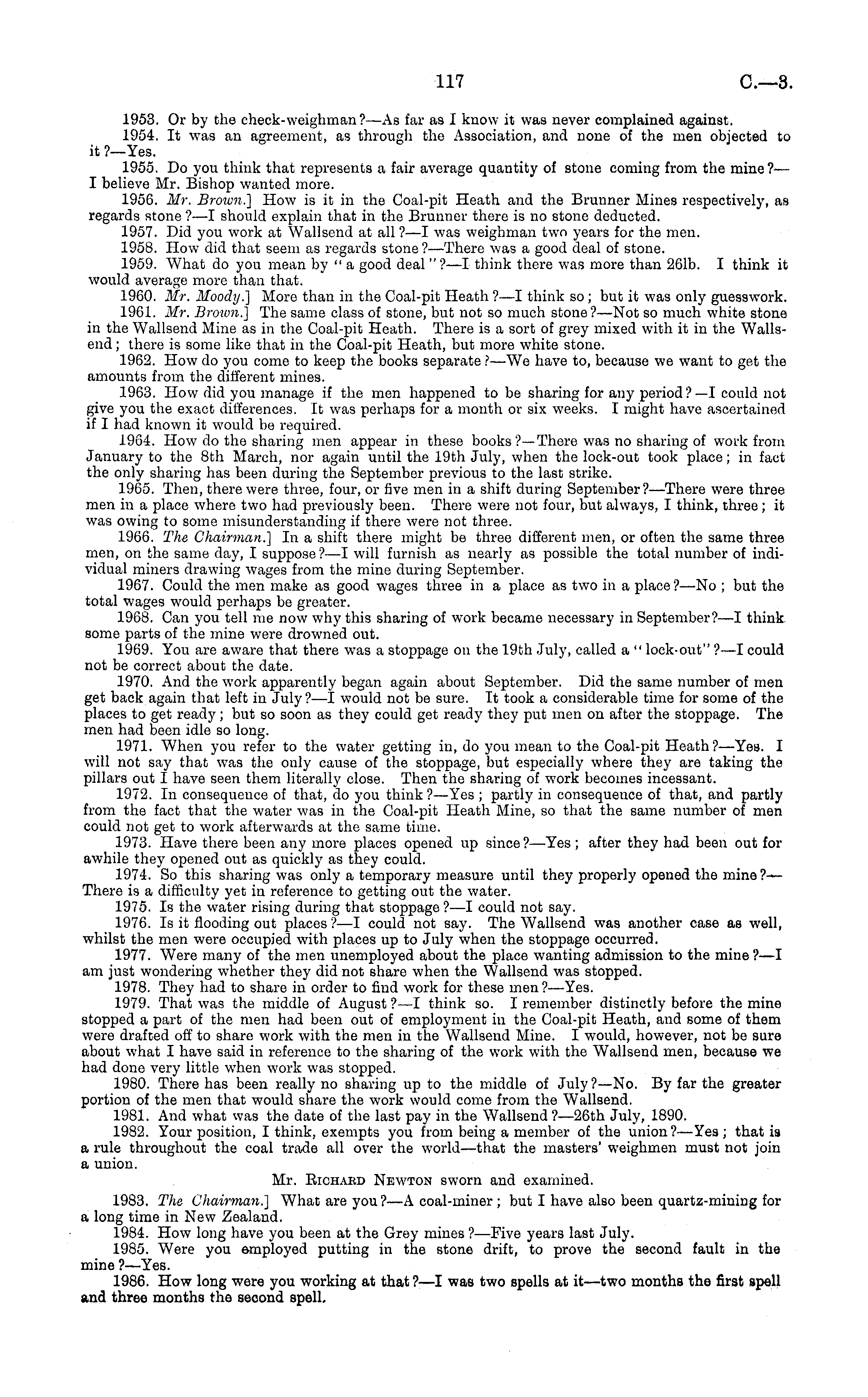 1953. Or by the check-weighman?—As far as I know it was never complained against. 1954. It was an agreement, as through the Association, and none of the men objected to it ?—Yes. 1955. Do you think that represents a fair average quantity of stone coming from the mine ?— I believe Mr. Bishop wanted more. 1956. Mr. Brown.] How is it in the Coal-pit Heath and the Brunner Mines respectively, as regards stone ?—I should explain that in the Brunner there is no stone deducted. 1957. Did you work at Wallsend at all ?—I was weighman two years for the men. 1958. How did that seem as regards stone ?—There was a good deal of stone. 1959. What do you mean by " a good deal"?—l think there was more than 261b. I think it would average more than that. 1960. Mr. Moody.] More than in the Coal-pit Heath ?—I think so; but it was only guesswork. 1961. Mr. Brown.] The same class of stone, but not so much stone? —Not so much white stone in the Wallsend Mine as in the Coal-pit Heath. There is a sort of grey mixed with it in the Wallsend ; there is some like that in the Coal-pit Heath, but more white stone. 1962. How do you come to keep the books separate ? —We have to, because we w 7 ant to get the amounts from the different mines. 1963. How did you manage if the men happened to be sharing for any period?—l could not give you the exact differences. It was perhaps for a month or six w 7 eeks. I might have ascertained if I had known it would be required. 1964. How do the sharing men appear in these books?— There was no sharing of work from January to the Bth March, nor again until the 19th July, when the lock-out took place; in fact the only sharing has been during the September previous to the last strike. 1965. Then, there were three, four, or five men in a shift during September?— There were three men in a place where two had previously been. There were not four, but always, I think, three ; it was owing to some misunderstanding if there were not three. 1966. The Chairman.] In a shift there might be three different men, or often the same three men, on the same day, I suppose'?—l will furnish as nearly as possible the total number of individual miners drawing wages from the mine during September. 1967. Could the men make as good wages three in a place as two in a place?—No ; but the total wages w r ould perhaps be greater. 1968. Can you tell me now why this sharing of work became necessary in September?—l think some parts of the mine were drowmed out. 1969. You are aware that there was a stoppage on the 19th July, called a " lock-out" ? —I could not be correct about the date. 1970. And the work apparently began again about September. Did the same number of men get back again that left in July? —I would not be sure. It took a considerable time for some of the places to get ready; but so soon as they could get ready they put men on after the stoppage. The men had been idle so long. 1971. When you refer to the water getting in, do you mean to the Coal-pit Heath?— Yes. I will not say that was the only cause of the stoppage, but especially where they are taking the pillars out I have seen them literally close. Then the sharing of work becomes incessant. 1972. In consequence of that, do you think ?—Yes ; partly in consequence of that, and partly from the fact that the water was in the Coal-pit Heath Mine, so that the same number of men could not get to work afterwards at the same time. 1973. Have there been any more places opened up since ?—Yes ; after they had been out for awhile they opened out as quickly as they could. 1974. So this sharing was only a temporary measure until they properly opened the mine ?— There is a difficulty yet in reference to getting out the water. 1975. Is the w 7 ater rising during that stoppage ? —I could not say. 1976. Is it flooding out places ?—I could not say. The Wallsend was another case as well, whilst the men were occupied with places up to July when the stoppage occurred. 1977. Were many of the men unemployed about the place wanting admission to the mine ?—I am just wondering wdiether they did not share when the Wallsend was stopped. 1978. They had to share in order to find work for these men ? —-Yes. 1979. That was the middle of August ? —I think so. I remember distinctly before the mine stopped a part of the men had been out of employment in the Coal-pit Heath, and some of them were drafted off to share work with the men in the Wallsend Mine. I would, however, not be sure about what I have said in reference to the sharing of the work with the Wallsend men, because we had done very little when work was stopped. 1980. There has been really no sharing up to the middle of July ? —No. By far the greater portion of the men that would share the work would come from the Wallsend. 1981. And what was the date of the last pay in the Wallsend ? —26th July, 1890. 1982. Your position, I think, exempts you from being a member of the union?— Yes ; that is a rule throughout the coal trade all over the world—that the masters' weighmen must not join a union. Mr. Eichaed Newton sworn and examined. 1983. The Chairman.] What are you?—A coal-miner ; but I have also been quartz-mining for a long time in New Zealand. 1984. How long have you been at the Grey mines ?—Five years last July. 1985. Were you employed putting in the stone drift, to prove the second fault in the mine ?— Yes. 1986. How long were you working at that ?—I was two spells at it—two months the first spell and three months the second spell.