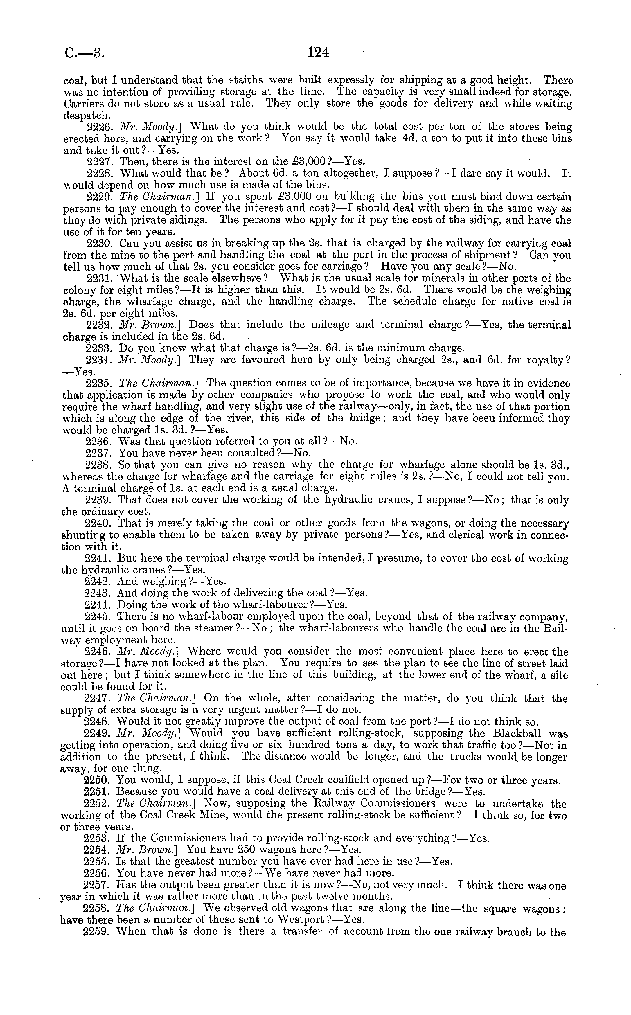 coal, but I understand that the staiths were built expressly for shipping at a good height. There was no intention of providing storage at the time. The capacity is very small indeed for storage. Carriers do not store as a usual rule. They only store the goods for delivery and while waiting despatch. 2226. Mr. Moody.] What do you think would be the total cost per ton of the stores being erected here, and carrying on the work ? You say it would take 4d. a ton to put it into these bins and take it out ?—Yes. 2227. Then, there is the interest on the £3,000? —Yes. 2228. What would that be ? About 6d. a ton altogether, I suppose ?—I dare say it would. It would depend on how much use is made of the bins. 2229. The Chairman.] If you spent £3,000 on building the bins you must bind down certain persons to pay enough to cover the interest and cost ?—I should deal with them in the same way as they do with private sidings. The persons who apply for it pay the cost of the siding, and have the use of it for ten years. 2230. Can you assist us in breaking up the 2s. that is charged by the railway for carrying coal from the mine to the port and handling the coal at the port in the process of shipment ? Can you tell us how much of that 2s. you consider goes for carriage ? Have you any scale ?—No. 2231. What is the scale elsewhere? What is the usual scale for minerals in other ports of the colony for eight miles? —It is higher than this. It would be 2s. 6d. There w 7 ould be the weighing charge, the wharfage charge, and the handling charge. The schedule charge for native coal is 2s. 6d. per eight miles. 2232. Mr. Brown.] Does that include the mileage and terminal charge ?—Yes, the terminal charge is included in the 2s. 6d. 2233. Do you know 7 what that charge is?—2s. 6d. is the minimum charge. 2234. Mr. Moody.] They are favoured here by only being charged 25., and 6d. for royalty? —Yes. 2235. The Chairman.] The question comes to be of importance, because we have it in evidence that application is made by other companies who propose to work the coal, and who would only require the wharf handling, and very slight use of the railway—only, in fact, the use of that portion which is along the edge of the river, this side of the bridge; and they have been informed they would be charged Is. 3d. ? —Yes. 2236. Was that question referred to you at all?— No. 2237. You have never been consulted? —No. 2238. So that you can give no reason why the charge for wharfage alone should be Is. 3d., whereas the charge for wharfage and the carriage for eight miles is 2s. ?—No, I could not tell you. A terminal charge of Is. at each end is a usual charge. 2239. That does not cover the working of the hydraulic cranes, I suppose ?—No; that is only the ordinary cost. 2240. That is merely taking the coal or other goods from the wagons, or doing the ueeessary shunting to enable them to be taken aw 7 ay by private persons ?—Yes, and clerical work in connection with it. 2241. But here the terminal charge would be intended, I presume, to cover the cost of working the hydraulic cranes ?—Yes. 2242. And weighing?— Yes. 2243. And doing the woik of delivering the coal ?—Yes. 2244. Doing the w 7 ork of the wharf-labourer?— Yes. 2245. There is no wharf-labour employed upon the coal, beyond that of the railway company, until it goes on board the steamer? —No ; the wharf-labourers who handle the coal are in the Eailway employment here. 2246. Mr. Moody.] Where would you consider the most convenient place here to erect the storage ? —I have not looked at the plan. You require to see the plan to see the line of street laid out here; but I think somewhere in the line of this building, at the lower end of the wharf, a site could be found for it. 2247. The Chairman.] On the whole, after considering the matter, do you think that the supply of extra storage is a very urgent matter ?—I do not. 2248. Would it not greatly improve tho output of coal from the port ?—I do not think so. 2249. Mr. Moody.] Would you have sufficient rolling-stock, supposing the Blackball was getting into operation, and doing five or six hundred tons a day, to work that traffic too?— Not in addition to the present, I think. The distance would be longer, and the trucks would be longer away, for one thing. 2250. You would, I suppose, if this Coal Creek coalfield opened up?— For two or three years. 2251. Because you w 7 ould have a coal delivery at this end of the bridge?— Yes. 2252. The Chairman.] Now, supposing the Eailway Commissioners were to undertake the working of the Coal Creek Mine, would the present rolling-stock be sufficient?—l think so, for two or three years. 2253. If the Commissioners had to provide rolling-stock and everything?— Yes. 2254. Mr. Broivn.] You have 250 wagons here ?—Yes. 2255. Is that the greatest number you have ever had here in use?— Yes. 2256. You have never had more? —We have never had more. 2257. Has the output been greater than it is now ?—No, not very much. I think there was one year in which it was rather more than in the past twelve months. 2258. The Chairman.] We observed old wagons that are along the line—the square wagons : have there been a number of these sent to Westport ?—Yes. 2259. When that is done is there a transfer of account from the one railway branch to the