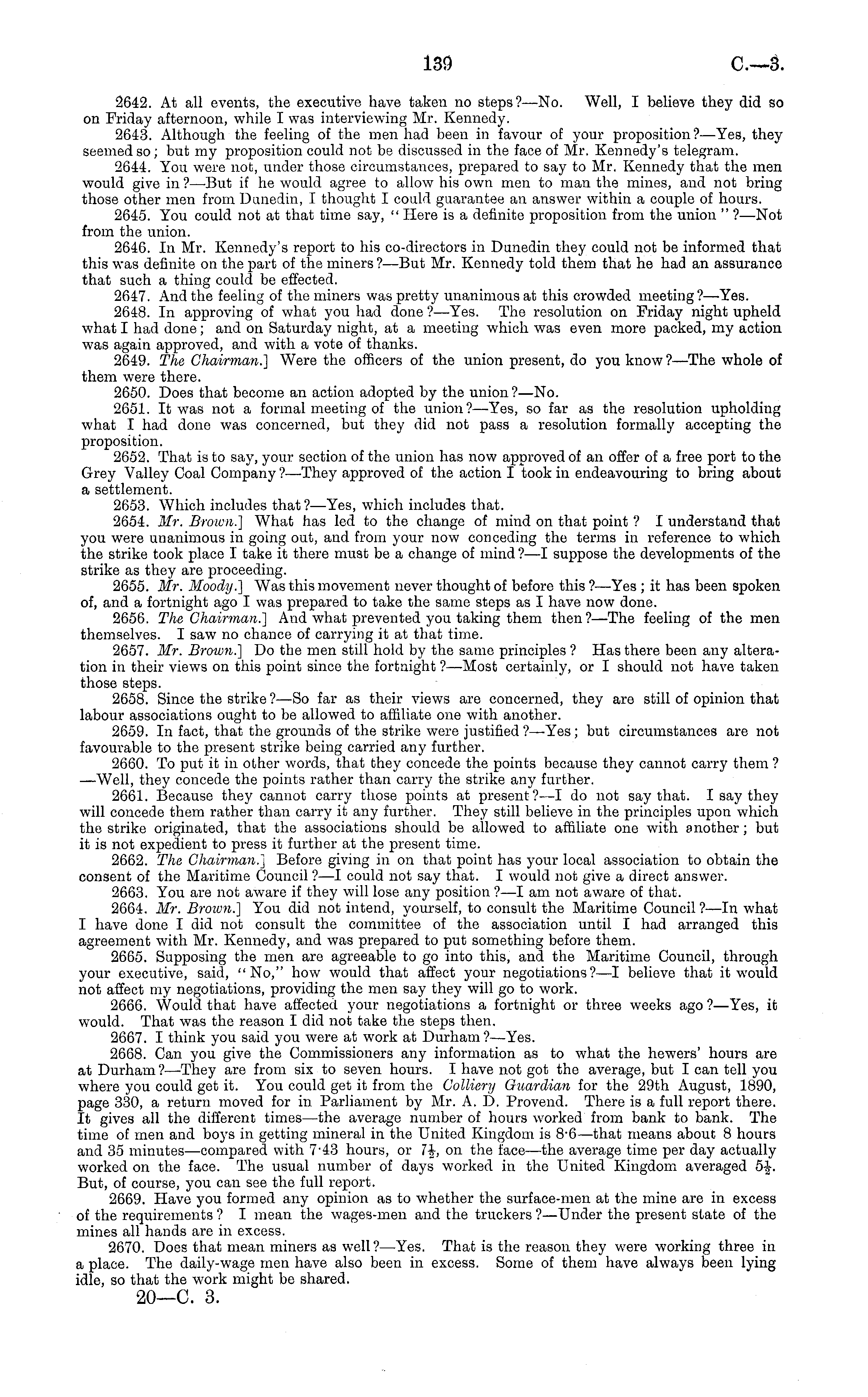 2642. At all events, the executive have taken no steps? —No. Well, I believe they did so on Friday afternoon, while I was interviewing Mr. Kennedy. 2643. Although the feeling of the men had been in favour of your proposition?— Yes, they seemed so; but my proposition could not be discussed in the face of Mr. Kennedy's telegram. 2644. You were not, under those circumstances, prepared to say to Mr. Kennedy that the men would give in ?—But if he would agree to allow his own men to man the mines, and not bring those other men from Dunedin, I thought I could guarantee an answer within a couple of hours. 2645. You could not at that time say, " Here is a definite proposition from the union " ?—Not from the union. 2646. In Mr. Kennedy's report to his co-directors in Dunedin they could not be informed that this was definite on the part of the miners ?—But Mr. Kennedy told them that he had an assurance that such a thing could be effected. 2647. And the feeling of the miners was pretty unanimous at this crowded meeting?— Yes. 2648. In approving of what you had done ?—Yes. The resolution on Friday night upheld what I had done ; and on Saturday night, at a meeting which was even more packed, my action was again approved, and with a vote of thanks. 2649. The Chairman.] Were the officers of the union present, do you know ? —The whole of them were there. 2650. Does that become an action adopted by the union?— No. 2651. It was not a formal meeting of the union?—-Yes, so far as the resolution upholding what I had done was concerned, but they did not pass a resolution formally accepting the proposition. 2652. That is to say, your section of the union has now approved of an offer of a free port to the Grey Valley Coal Company ?—They approved of the action I took in endeavouring to bring about a settlement. 2653. Which includes that ?—Yes, which includes that. 2654. Mr. Brown.] What has led to the change of mind on that point ? I understand that you were unanimous in going out, and from your now conceding the terms in reference to which the strike took place I take it there must be a change of mind ?—I suppose the developments of the strike as thoy are proceeding. 2655. Mr. Moody.] Was this movement never thought of before this?— Yes ; it has been spoken of, and a fortnight ago I was prepared to take the same steps as I have now done. 2656. The Chairman.] And what prevented you taking them then ?—The feeling of the men themselves. I saw no chance of carrying it at that time. 2657. Mr. Brown.] Do the men still hold by the same principles ? Has there been any alteration in their views on this point since the fortnight ?—Most certainly, or I should not have taken those steps. 2658. Since the strike ?—So far as their views are concerned, they are still of opinion that labour associations ought to be allowed to affiliate one with another. 2659. In fact, that the grounds of the strike were justified ? —-Yes; but circumstances are not favourable to the present strike being carried any further. 2660. To put it in other words, that they concede the points because they cannot carry them ? —Well, they concede the points rather than carry the strike any further. 2661. Because they cannot carry those points at present?—l do not say that. I say they will concede them rather than carry it any further. They still believe in the principles upon which tho strike originated, that the associations should be allowed to affiliate one with another; but it is not expedient to press it further at the present time. 2662. The Chairman.] Before giving in on that point has your local association to obtain the consent of the Maritime Council ?—I could not say that. I would not give a direct answer. 2663. You are not aware if they will lose any position ?—I am not aware of that. 2664. Mr. Brown.] You did not intend, yourself, to consult the Maritime Council ?—ln what I have done I did not consult the committee of the association until I had arranged this agreement with Mr. Kennedy, and was prepared to put something before them. 2665. Supposing the men are agreeable to go into this, and the Maritime Council, through your executive, said, "No," how would that affect your negotiations?—l believe that it would not affect my negotiations, providing the men say they will go to work. 2666. Would that have affected your negotiations a fortnight or three weeks ago ?—Yes, it would. That was the reason I did not take the steps then. 2667. I think you said you were at work at Durham?— Yes. 2668. Can you give the Commissioners any information as to what the hewers' hours are at Durham? —They are from six to seven hours. I have not got the average, but I can tell you where you could get it. You could get it from the Colliery Guardian for the 29th August, 1890, page 330, a return moved for in Parliament by Mr. A. D. Provend. There is a full report there. It gives all the different times —the average number of hours worked from bank to bank. The time of men and boys in getting mineral in the United Kingdom is 8-6—that means about 8 hours and 35 minutes —compared with 743 hours, or 7-J, on the face—the average time per day actually worked on the face. The usual number of days worked in the United Kingdom averaged 5-J-. But, of course, you can see the full report. 2669. Have you formed any opinion as to whether the surface-men at the mine are in excess of the requirements ? I mean the wages-men and the truckers ?—Under the present state of the mines all hands are in excess. 2670. Does that mean miners as well ? —Yes. That is the reason they w 7 ere working three in a place. The daily-wage men have also been in excess. Some of them have always been lying idle, so that the w 7 ork might be shared. 20—C. 3.