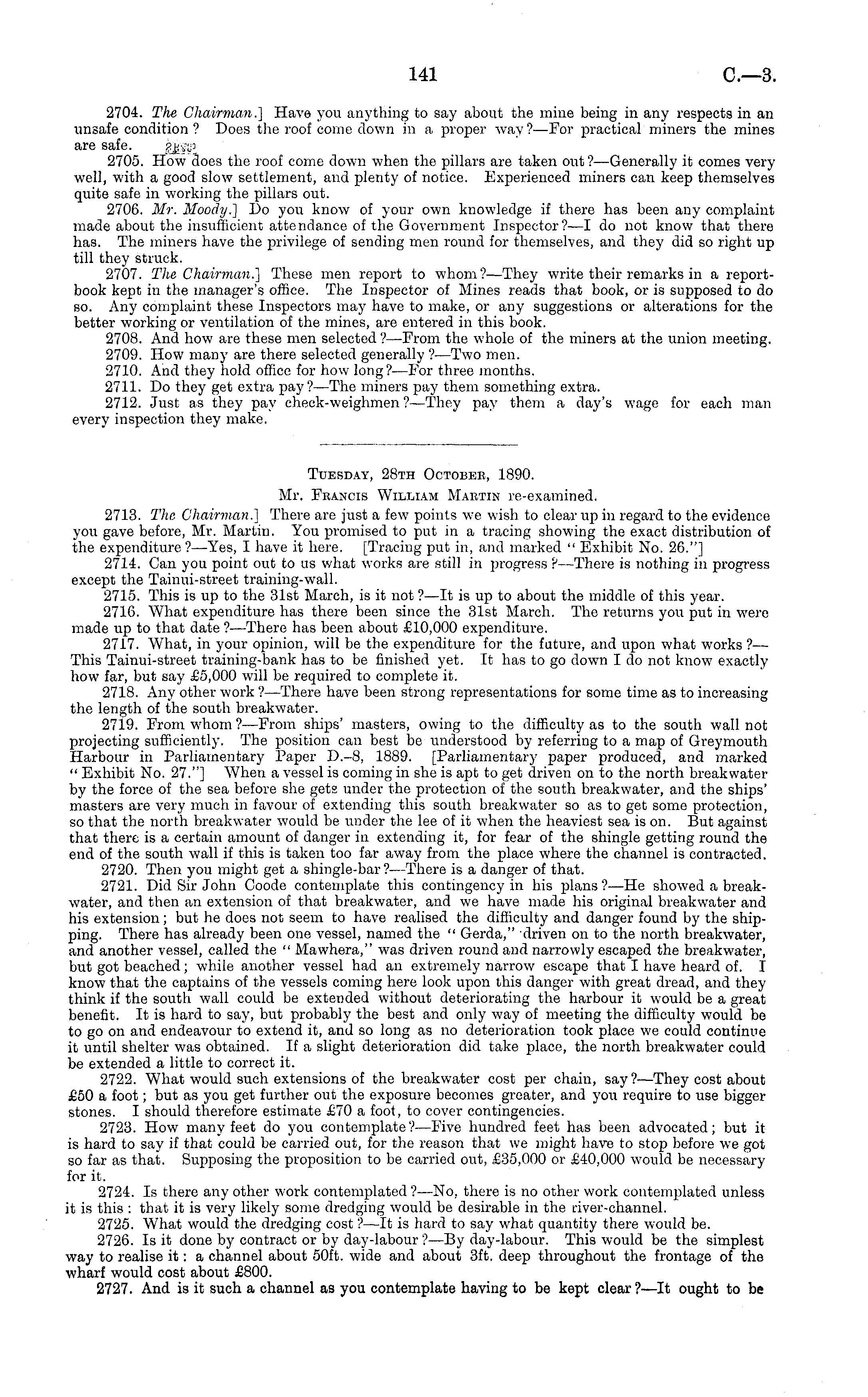 Tuesday, 28th Octobee, 1890. Mr. Francis William Martin re-examined. 2713. The Chairman.] There are just a few points we wish to clear up in regard to the evidence you gave before, Mr. Martin. You promised to put in a tracing showing the exact distribution of the expenditure? —Yes, I have it here. [Tracing put in, and marked " Exhibit No. 26."] 2714. Can you point out to us what works are still in progress ? —There is nothing in progress except the Tainui-street training-wall. 2715. This is up to the 31st March, is it not ?—lt is up to about the middle of this year. 2716. What expenditure has there been since the 31st March. The returns you put in were made up to that date ?■—There has been about £10,000 expenditure. 2717. What, in your opinion, will be the expenditure for the future, and upon what works?— This Tainui-street training-bank has to be finished yet. It has to go down Ido not know exactly how far, but say £5,000 will be required to complete it. 2718. Any other work ?—There have been strong representations for some time as to increasing the length of the south breakwater. 2719. From wdiom ?—From ships' masters, owing to the difficulty as to the south wall not projecting sufficiently. The position can best be understood by referring to a map of Greymouth Harbour in Parliamentary Paper D.-8, 1889. [Parliamentary paper produced, and marked " Exhibit No. 27."] When a vessel is coming in she is apt to get driven on to the north breakwater by the force of the sea before she gets under the protection of the south breakwater, and the ships' masters are very much in favour of extending this south breakwater so as to get some protection, so that the north breakwater would be under the lee of it when the heaviest sea is on. But against that there is a certain amount of danger in extending it, for fear of the shingle getting round the end of the south wall if this is taken too far away from the place where the channel is contracted. 2720. Then you might get a shingle-bar?— There is a danger of that. 2721. Did Sir John Coode contemplate this contingency in his plans?—He showed a breakwater, and then an extension of that breakwater, and w 7 e have made his original breakwater and his extension; but he does not seem to have realised the difficulty and danger found by the shipping. There has already been one vessel, named the " Gerda," 'driven on to the north breakwater, and another vessel, called the " Mawhera," was driven round and narrowly escaped the breakwater, but got beached; while another vessel had an extremely narrow 7 escape that I have heard of. I know that the captains of the vessels coming here look upon this danger with great dread, and they think if the south wall could be extended without deteriorating the harbour it would be a great benefit. It is hard to say, but probably the best and only way of meeting the difficulty w 7 ould be to go on and endeavour to extend it, and so long as no deterioration took place we could continue it until shelter was obtained. If a slight deterioration did take place, the north breakwater could be extended a little to correct it. 2722. What would such extensions of the breakwater cost per chain, say ?—They cost about £50 a foot; but as you get further out the exposure becomes greater, and you require to use bigger stones. I should therefore estimate £70 a foot, to cover contingencies. 2723. How many feet do you contemplate? —Five hundred feet has been advocated; but it is hard to say if that could be carried out, for the reason that we might have to stop before we got so far as that. Supposing the proposition to be carried out, £35,000 or £40,000 would be necessary for it. 2724. Is there any other work contemplated ?—No, there is no other work contemplated unless it is this : that it is very likely- some dredging would be desirable in the river-channel. 2725. What would the dredging cost ?—lt is hard to say what quantity there would be. 2726. Is it done by contract or by day-labour ?—By day-labour. This would be the simplest way to realise it: a channel about 50ft. wide and about 3ft. deep throughout the frontage of the wharf would cost about £800. 2727. And is it such a channel as you contemplate having to be kept clear?—lt ought to be
