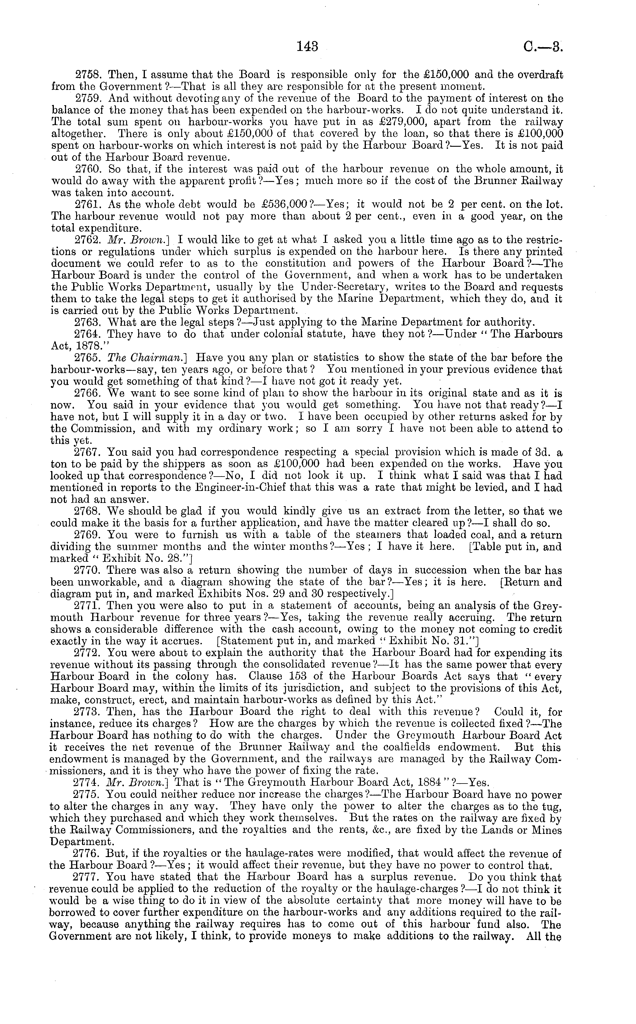2758. Then, I assume that the Board is responsible only for the £150,000 and the overdraft from the Government ?—That is all they are responsible for at the present moment. 2759. And without devoting any of the revenue of the Board to the payment of interest on the balance of the money that has been expended on the harbour-works. Ido not quite understand it. The total sum spent on harbour-works you have put in as £279,000, apart from the railway altogether. There is only about £150,000 of that covered by the loan, so that there is £100,000 spent on harbour-works on which interest is not paid by the Harbour Board? —Yes. It is not paid out of the Harbour Board revenue. 2760. So that, if the interest w T as paid out of the harbour revenue on the whole amount, it would do aw 7 ay with the apparent profit ?—Yes; much more so if the cost of the Brunner Railway was taken into account. 2761. As the whole debt would be £536,000? —Yes; it would not be 2 percent, on the lot. The harbour revenue would not pay more than about 2 per cent., even in a good year, on the total expenditure. 2762. Mr. Brown.] I w 7 ould like to get at what I asked you a little time ago as to the restrictions or regulations under which surplus is expended on the harbour here. Is there any printed document we could refer to as to the constitution and pow ; ers of the Harbour Board ?—The Harbour Board is under the control of the Government, and when a work has to be undertaken the Public Works Department, usually by the Under-Secretary, writes to the Board and requests them to take the legal steps to get it authorised by the Marine Department, w 7 hich they- do, and it is carried out by the Public Works Department. 2763. What are the legal steps ?—Just applying to the Marine Department for authority. 2764. They have to do that under colonial statute, have they not ?—Under " The Harbours Act, 1878." 2765. The Chairman.] Have you any plan or statistics to show the state of the bar before the harbour-works—say, ten years ago, or before that ? You mentioned in your previous evidence that you would get something of that kind ?—I have not got it ready yet. 2766. We want to see some kind of plan to show the harbour in its original state and as it is now. You said in your evidence that you would get something. You have not that ready ? —I have not, but I will supply it in a day or two. I have been occupied by other returns asked for by the Commission, and with my ordinary w 7 ork; so I am sorry I have not been able to attend to this yet. 2767. You said you had correspondence respecting a special provision which is made of 3d. a ton to be paid by the shippers as soon as £100,000 had been expended on the works. Have you looked up that correspondence ?—No, I did not look it up. I think what I said was that I had mentioned in reports to the Engineer-in-Chief that this was a rate that might be levied, and I had not had an answer. 2768. We should be glad if you would kindly give us an extract from the letter, so that we could make it the basis for a further application, and have the matter cleared up ?—I shall do so. 2769. You were to furnish us with a table of the steamers that loaded coal, and a return dividing the summer months and the winter months ?—Yes ; I have it here. [Table put in, and marked " Exhibit No. 28."] 2770. There was also a return showing the number of days in succession when the bar has been unworkable, and a diagram showing the state of the bar?— Yes; it is here. [Eeturn and diagram put in, and marked Exhibits Nos. 29 and 30 respectively.] 2771. Then you were also to put in a statement of accounts, being an analysis of the Greymouth Harbour revenue for three years ?—Yes, taking the revenue really accruing. The return shows a considerable difference with the cash account, owing to the money not coming to credit exactly in the way it accrues. [Statement put in, and marked " Exhibit No. 31."] 2772. You were about to explain the authority that the Harbour Board had for expending its revenue without its passing through the consolidated revenue ?—lt has the same power that every Harbour Board in the colony has. Clause 153 of the Harbour Boards Act says that " every Harbour Board may, within the limits of its jurisdiction, and subject to the provisions of this Act, make, construct, erect, and maintain harbour-works as defined by this Act." 2773. Then, has tho Harbour Board the right to deal with this revenue ? Could it, for instance, reduce its charges ? How are the charges by which the revenue is collected fixed ?—The Harbour Board has nothing to do with the charges. Under the Greymouth Harbour Board Act it receives the net revenue of the Brunner Railway and the coalfields endowment. But this endowment is managed by the Government, and the railways are managed by the Eailway Commissioners, and it is they who have the power of fixing the rate. 2774. Mr. Brown.] That is "The Greymouth Harbour Board Act, 1884"?— Yes. 2775. You could neither reduce nor increase the charges?— The Harbour Board have no power to alter the charges in any way. They have only the power to alter the charges as to the tug, which they purchased and w 7 hich they work themselves. But the rates on the railway are fixed by the Eailway Commissioners, and the royalties and the rents, &c, are fixed by the Lands or Mines Department. 2776. But, if the royalties or the haulage-rates were modified, that w-ould affect the revenue of the Harbour Board ?—Yes; it would affect their revenue, but they have no power to control that. 2777. You have stated that the Harbour Board has a surplus revenue. Do you think that revenue could be applied to the reduction of the royalty or the haulage-charges ?—I do not think it would be a wise thing to do it in view of the absolute certainty that more money will have to be borrowed to cover further expenditure on the harbour-works and any additions required to the railway, because anyth