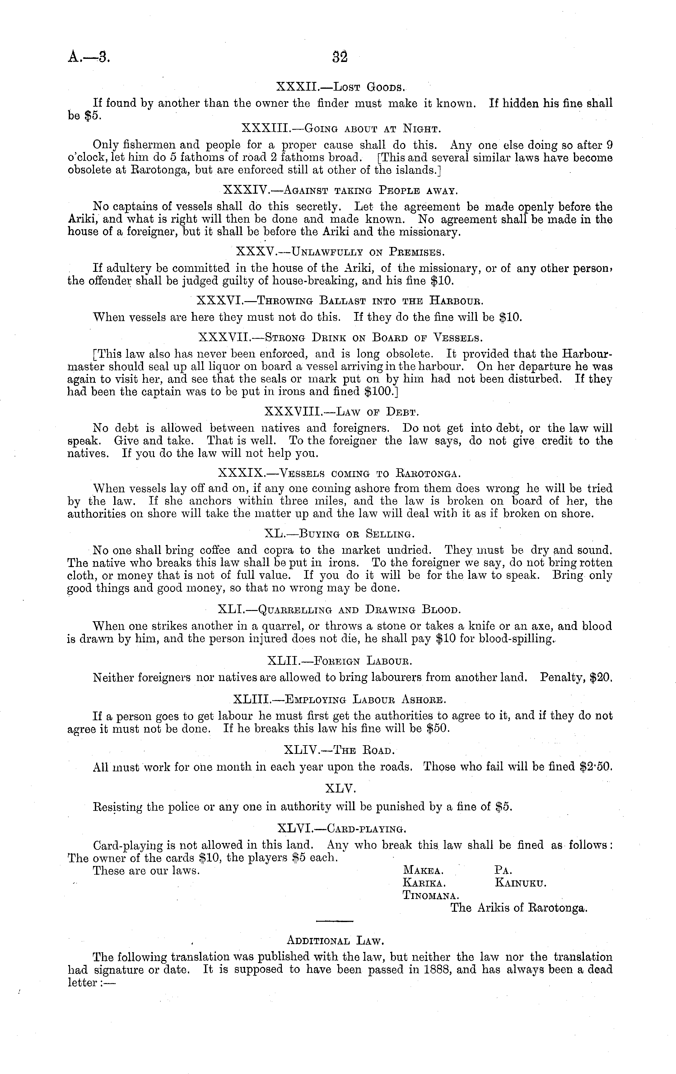 XXXII.—Lost Goods. If found by another than the owner the finder must make it known. If hidden his fine shall be $5. XXXIII.—Going about at Night. Only fishermen and people for a proper cause shall do this. Any one else doing so after 9 o'clock, let him do 5 fathoms of road 2 fathoms broad. [This and several similar laws have become obsolete at Rarotonga, but are enforced still at other of the islands.] XXXlV.—Against taking People away. No captains of vessels shall do this secretly. Let the agreement be made openly before the Ariki, and what is right will then be done and made known. No agreement shall be made in the house of a foreigner, but it shall be before the Ariki and the missionary. XXXV.—Unlawfully on Peemises. If adultery be committed in the house of the Ariki, of the missionary, or of any other person > the offender shall be judged guilty of house-breaking, and his fine $10. XXXVI. —Theowing Ballast into the Haeboue. "When vessels are here they must not do this. If they do the fine will be $10. XXXVII. —Strong Deink on Boaed op Vessels. [This law also has never been enforced, and is long obsolete. It provided that the Harbourmaster should seal up all liquor on board a vessel arriving in the harbour. On her departure he was again to visit her, and see that the seals or mark put on by him had not been disturbed. If they had been the captain was to be put in irons and fined $100.] XXXVIII.—Law op Debt. No debt is allowed between natives and foreigners. Do not get into debt, or the law will speak. Give and take. That is well. To the foreigner the law says, do not give credit to the natives. If you do the law will not help you. XXXlX.—Vessels coming to Rakotonga. When vessels lay off and on, if any one coining ashore from them does wrong he will be tried by the law. If she anchors within three miles, and the law is broken on board of her, the authorities on shore will take the matter up and the law will deal with it as if broken on shore. XL.—Buying oe Selling. No one shall bring coffee and copra to the market undried. They must be dry and sound. The native who breaks this law shall be put in irons. To the foreigner we say, do not bring rotten cloth, or money that is not of full value. If you do it will be for the law to speak. Bring only good things and good money, so that no wrong may be done. XLl.—Quarrelling and Drawing Blood. When one strikes another in a quarrel, or throws a stone or takes a knife or an axe, and blood is drawn by him, and the person injured does not die, he shall pay $10 for blood-spilling. XLll.—Foreign Labour. Neither foreigners nor natives are allowed to bring labourers from another land. Penalty, $20. XLlll.—Employing Labour Ashore. If a person goes to get labour he must first get the authorities to agree to it, and if they do not agree it must not be done. If he breaks this law his fine will be $50. XLIV.—The Road. All must work for one month in each year upon the roads. Those who fail will be fined $250. XLV. Resisting the police or any one in authority will be punished by a fine of $5. XL Vl.—Card-playing. Card-playing is not allowed in this land. Any who break this law shall be fined as follows: The owner of the cards $10, the players $5 each. These are our laws. Makea. Pα. Kaeika. Kainuku. TINOMANA. The Arikis of Rarotonga.