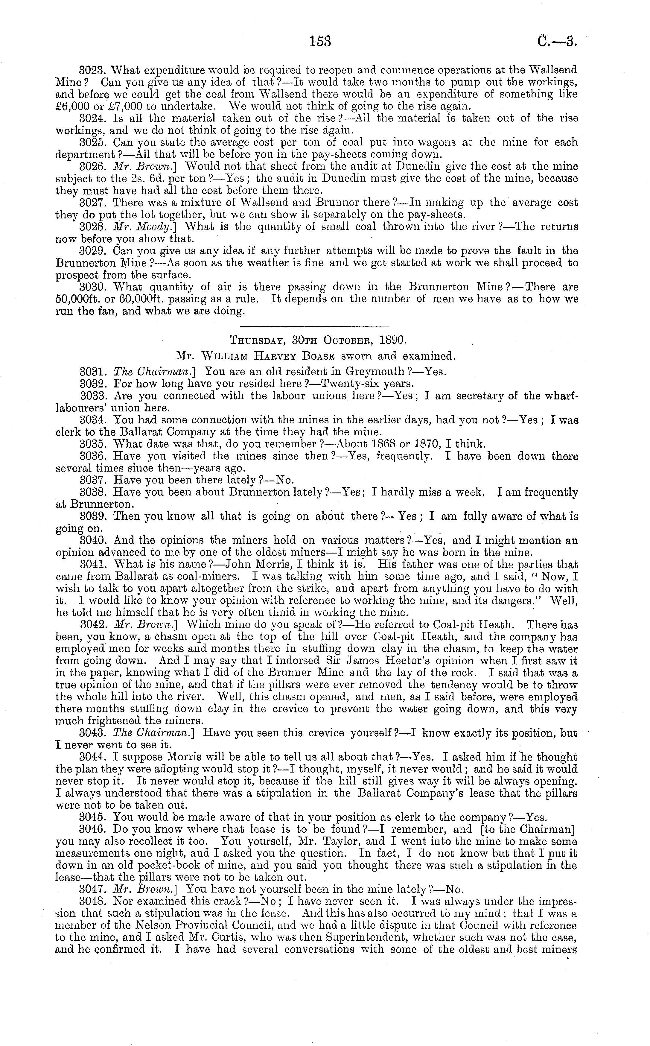 Thuesday, 30th Octobee, 1890. Mr. William Haevey Boase sworn and examined. 3031. The Chairman.] You are an old resident in Greymouth?—Yes. 3032. For how long have you resided here? —Twenty-six years. 3033. Are you connected with the labour unions here?— Yes; I am secretary of the wdiarflabourers' union here. 3034. You had some connection with the mines in tho earlier days, had you not ?—Yes ; I was clerk to the Ballarat Company at the time they had the mine. 3035. What date was that, do you remember?— About 1868 or 1870, I think. 3036. Have you visited the mines since then ?—Yes, frequently. I have been down there several times since then—years ago. 3037. Have you been there lately ?—No. 3038. Have you been about Brunnerton lately ? —Yes; I hardly miss a week. lam frequently at Brunnerton. 3039. Then you know all that is going on about there ?-- Yes ; I am fully aware of what is going on. 3040. And the opinions the miners hold on various matters ?—Yes, and I might mention an opinion advanced to me by one of the oldest miners—l might say he was born in the mine. 3041. What is his name?— John Morris, I think it is. His father was one of the parties that came from Ballarat as coal-miners. I was talking with him some time ago, and I said, " Now, I wish to talk to you apart altogether from the strike, and apart from anything you have to do with it. I w T ould like to know your opinion with reference to working the mine, and its dangers." Well, he told me himself that he is very often timid in working the mine. 3042. Mr. Brown.] Which mine do you speak of?—He referred to Coal-pit Heath. There has been, you know, a chasm open at the top of the hill over Coal-pit Heath, and the company has employed men for weeks and months there in stuffing down clay in the chasm, to keep the water from going down. And I may say that I indorsed Sir James Hector's opinion when I first saw it in the paper, knowing what I did of the Brunner Mine and the lay of the rock. I said that was a true opinion of the mine, and that if the pillars were ever removed the tendency would be to throw the whole hill into the river. Well, this chasm opened, and men, as I said before, were employed there months stuffing down clay in the crevice to prevent the water going down, and this very much frightened the miners. 3043. The Chairman.] Have you seen this crevice yourself?—l know exactly its position, but I never went to see it. 3044. I suppose Morris will be able to tell us all about that ?—Yes. I asked him if he thought the plan they were adopting would stop it ?—-I thought, myself, it never would; and he said it would never stop it. It never would stop it, because if the hill still gives way it will be always opening. I always understood that there was a stipulation in the Ballarat Company's lease that the pillars were not to be taken out. 3045. You would be made aware of that in your position as clerk to the company?— Yes. 3046. Do you know where that lease is to be found?—l remember, and [to the Chairman] you may also recollect it too. You yourself, Mr. Taylor, and I went into the mine to make some measurements one night, and I asked you the question. In fact, I do not know but that I put it down in an old pocket-book of mine, and you said you thought there w 7 as such a stipulation in the lease—that the pillars were not to be taken out. 3047. Mr. Brown,] You have not yourself been in the mine lately? —No. 3048. Nor examined this crack?—No ; I have never seen it. I was always under the impression that such a stipulation was in the lease. And this has also occurred to my mind: that I was a member of the Nelson Provincial Council, and we had a little dispute in that Council with reference to the mine, and I asked Mr. Curtis, who w 7 as then Superintendent, whether such was not the case, and he confirmed it. I have had several conversations with some of the oldest and best miners