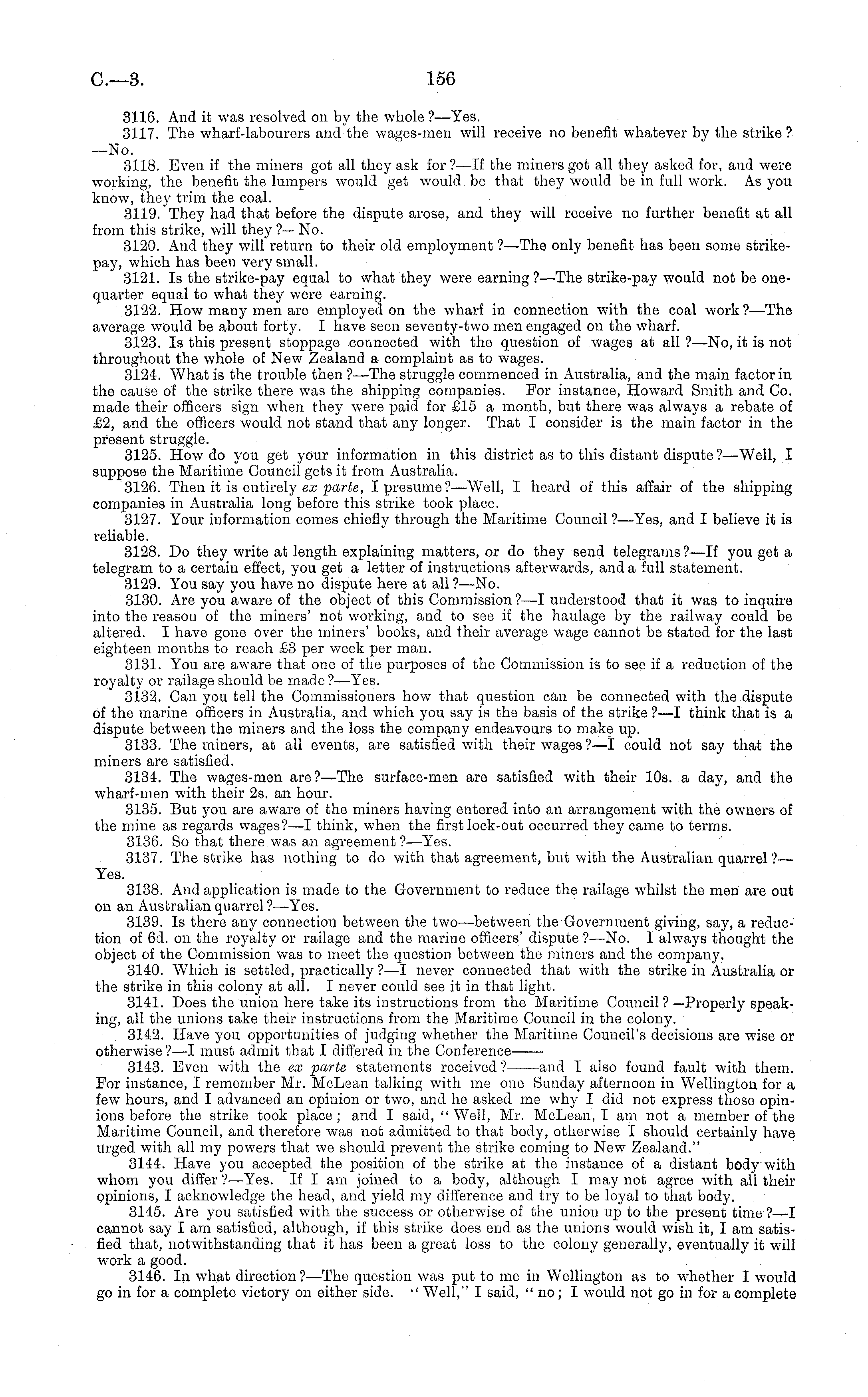 3116. And it was resolved on by the whole ?—Yes. 3117. The wharf-labourers and the wages-men will receive no benefit whatever by the strike? —No. 3118. Even if the miners got all they ask for ?—lf the miners got all they asked for, and were working, the benefit the lumpers would get would be that they would be in full work. As you know 7 , they trim the coal. 3119. They had that before the dispute arose, and they will receive no further benefit at all from this strike, will they ?— No. 3120. And they will return to their old employment ?—The only benefit has been some strikepay, which has been very small. 3121. Is the strike-pay equal to what they were earning?— The strike-pay would not be onequarter equal to what they were earning. 3122. How many men are employed on the wharf in connection with the coal work ?—The average would be about forty. I have seen seventy-two men engaged on the wharf. 3123. Is this present stoppage connected with the question of wages at all ?—No, it is not throughout the whole of New Zealand a complaint as to wages. 3124. What is the trouble then ? —The struggle commenced in Australia, and the main factor in the cause of the strike there was the shipping companies. For instance, Howard Smith and Co. made their officers sign when they were paid for £15 a month, but there was always a rebate of £2, and the officers would not stand that any longer. That I consider is the main factor in the present struggle. 3125. How do you get your information in this district as to this distant dispute ?—Well, I suppose the Maritime Council gets it from Australia. 3126. Then it is entirely ex parte, I presume?— Well, I beard of this affair of the shipping companies in Australia long before this strike took place. 3127. Your information comes chiefly through the Maritime Council ?—Yes, and I believe it is reliable. 3128. Do they write at length explaining matters, or do they send telegrams ?—lf you get a telegram to a certain effect, you get a letter of instructions afterwards, and a full statement. 3129. You say you have no dispute here at all ? —No. 3130. Are you aware of the object of this Commission ?—I understood that it was to inquire into the reason of the miners' not working, and to see if the haulage by the railway could be altered. I have gone over the miners' books, and their average wage cannot be stated for the last eighteen months to reach £3 per week per man. 3131. You are aware that one of the purposes of the Commission is to see if a reduction of the royalty or railage should be made ? —Yes. 3132. Can you tell the Commissioners how that question can be connected with the dispute of the marine officers in Australia, and which you say is the basis of the strike ?—I think that is a dispute between the miners and the loss the company endeavours to make up. 3133. The miners, at all events, are satisfied with their wages?—l could not say that the miners are satisfied. 3134. The wages-men are?— The surface-men are satisfied with their 10s. a day, and the wharf-men with their 2s. an hour. 3135. But you are aware of the miners having entered into an arrangement with the owners of the mine as regards wages? —I think, when the first lock-out occurred they came to terms. 3136. So that there was an agreement ?—Yos. 3137. The strike has nothing to do with that agreement, but with the Australian quarrel ?— Yes. 3138. And application is made to the Government to reduce the railage whilst the men are out on an Australian quarrel ?—Yes. 3139. Is there any connection between the two—between the Government giving, say, a reduction of 6d. on the royalty or railage and the marine officers' dispute ?—No. I always thought the object of the Commission was to meet the question between the miners and the company. 3140. Which is settled, practically ? —I never connected that with the strike in Australia or the strike in this colony at all. I never could see it in that light. 3141. Does the union here take its instructions from the Maritime Council ?—Properly speaking, all the unions take their instructions from the Maritime Council in the colony. 3142. Have you opportunities of judging whether the Maritime Council's decisions are wise or otherwise ?—I must admit that I differed in the Conference 3143. Even with the ex parte statements received ? and I also found fault with them. For instance, I remember Mr. McLean talking with me one Sunday afternoon in Wellington for a few hours, and I advanced an opinion or two, and he asked me why I did not express those opinions before the strike took place ; and I said, " Well, Mr. McLean, I am not a member of the Maritime Council, and therefore was not admitted to that body, otherwise I should certainly have Urged with all my powers that we should prevent the strike coming to New Zealand." 3144. Have you accepted the position of the strike at the instance of a distant body with whom you differ ?—Yes. If I am joined to a body, although I may not agree with all their opinions, I acknowledge the head, and yield my difference and try to be loyal to that body. 3145. Are you satisfied with the success or otherwise of the union up to the present time ?—I cannot say I am satisfied, although, if this strike does end as the unions would wish it, I am satisfied that, notwithstanding that it has been a great loss to the colony generally, eventually it will work a good. 3146. In what direction ? —The question was put to me in Wellington as to whether I w r ould go in for a complete victory on either side. " Well," I said, "no ; I w 7 ould not go in for a complete