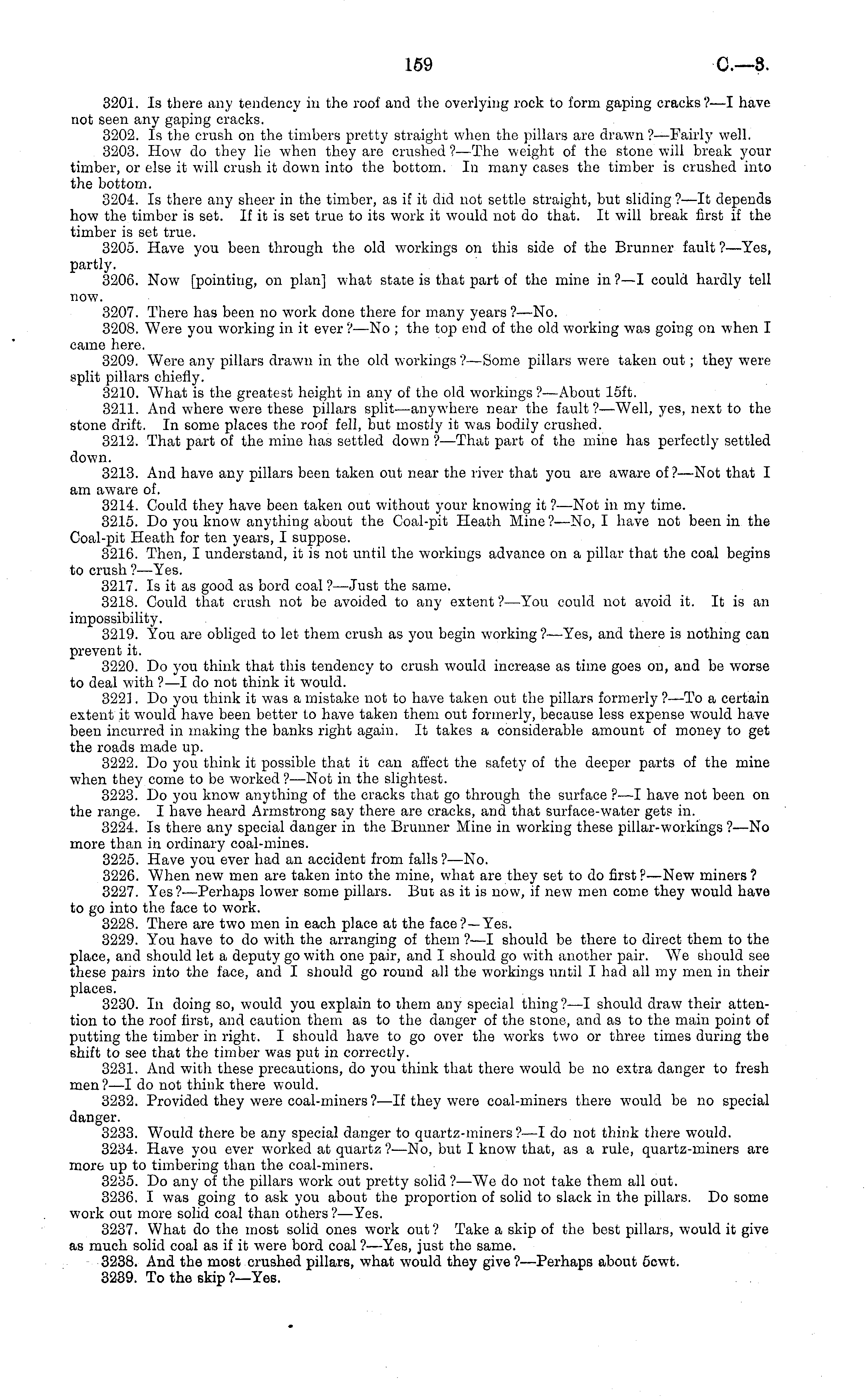 3201. Is there any tendency in the roof and the overlying rock to form gaping cracks? —I have not seen any gaping cracks. 3202. Is the crush on the timbers pretty straight when the pillars are drawn ?—Fairly well. 3203. How do they lie when they are crushed ?—The weight of the stone will break your timber, or else it will crush it down into the bottom. In many cases the timber is crushed into the bottom. 3204. Is there any sheer in the timber, as if it did not settle straight, but sliding ?—lt depends how the timber is set. If it is set true to its work it would not do that. It will break first if the timber is set true. 3205. Have you been through the old workings on this side of the Brunner fault ?—Yes, partly. 3206. Now [pointing, on plan] what state is that part of the mine in ?—I could hardly tell now. 3207. There has been no w 7 ork done there for many years ?—No. 3208. Were you working in it ever ? —No ; the top end of the old working was going on when I came here. 3209. Were any pillars drawn in the old workings ? —Some pillars w 7 ere taken out; they were split pillars chiefly. 3210. What is the greatest height in any of the old workings ?—About 15ft. 3211. And where were these pillars split—anywhere near the fault ?—Well, yes, next to the stone drift. In some places the roof fell, but mostly 7 it was bodily crushed. 3212. That part of the mine has settled down ?—That part of the mine has perfectly settled down. 3213. And have any pillars been taken out near the river that you are aware of?— Not that I am aware of. 3214. Could they have been taken out without your knowing it ?—Not in my time. 3215. Do you know anything about the Coal-pit Heath Mine ?—No, I have not been in the Coal-pit Heath for ten years, I suppose. 3216. Then, I understand, it is not until the workings advance on a pillar that the coal begins to crush ? —Yes. 3217. Is it as good as bord coal ? —Just the same. 3218. Could that crush not be avoided to any extent ?—You could not avoid it. It is an impossibility. 3219. You are obliged to let them crush as you begin w 7 orking ?—Yes, and there is nothing can prevent it. 3220. Do you think that this tendency to crush would increase as time goes on, and be worse to deal with ?—I do not think it w r ould. 3221. Do you think it was a mistake not to have taken out the pillars formerly ?—To a certain extent it would have been better to have taken them out formerly, because less expense would have been incurred in making the banks right again. It takes a considerable amount of money to get the roads made up. 3222. Do you think it possible that it can affect the safety of the deeper parts of the mine when they come to be worked?— Not in the slightest. 3223. Do you know anything of the cracks that go through the surface ?—I have not been on the range. I have heard Armstrong say there are cracks, and that surface-water gets in. 3224. Is there any special danger in the Brunner Mine in working these pillar-workings ? —No more than in ordinary coal-mines. 3225. Have you ever had an accident from falls ?—No. 3226. When new- men are taken into the mine, what are they set to do first ?—New miners ? 3227. Yes?— Perhaps lower some pillars. But as it is now, if new men come they would have to go into the face to work. 3228. There are two men in each place at the face ?—Yes. 3229. You have to do with the arranging of them ? —I should be there to direct them to the place, and should let a deputy go with one pair, and I should go with another pair. We should see these pairs into the face, and I should go round all the workings until I had all my men in their places. 3230. In doing so, would you explain to them any special thing?—l should draw their attention to the roof first, and caution them as to the danger of the stone, and as to the main point of putting the timber in right. I should have to go over the w 7 orks two or three times during the shift to see that the timber was put in correctly. 3231. And with these precautions, do you think that there would be no extra danger to fresh men ? —I do not think there would. 3232. Provided they were coal-miners ?—lf they were coal-miners there would be no special danger. 3233. Would there be any special danger to quartz-miners ?—I do not think there would. 3234. Have you ever w 7 orked at quartz?—No, but I know that, as a rule, quartz-miners are more up to timbering than the coal-miners. 3235. Do any of the pillars work out pretty solid?—We do not take them all out. 3236. I was going to ask you about the proportion of solid to slack in the pillars. Do some work out more solid coal than others ?—Yes. 3237. What do the most solid ones work out? Take a skip of the best pillars, would it give as much solid coal as if it w 7 ere bord coal ?—Yes, just the same. 3238. And the most crushed pillars, what would they give ?—Perhaps about scwt. 3239. To the skip ?—Yes.