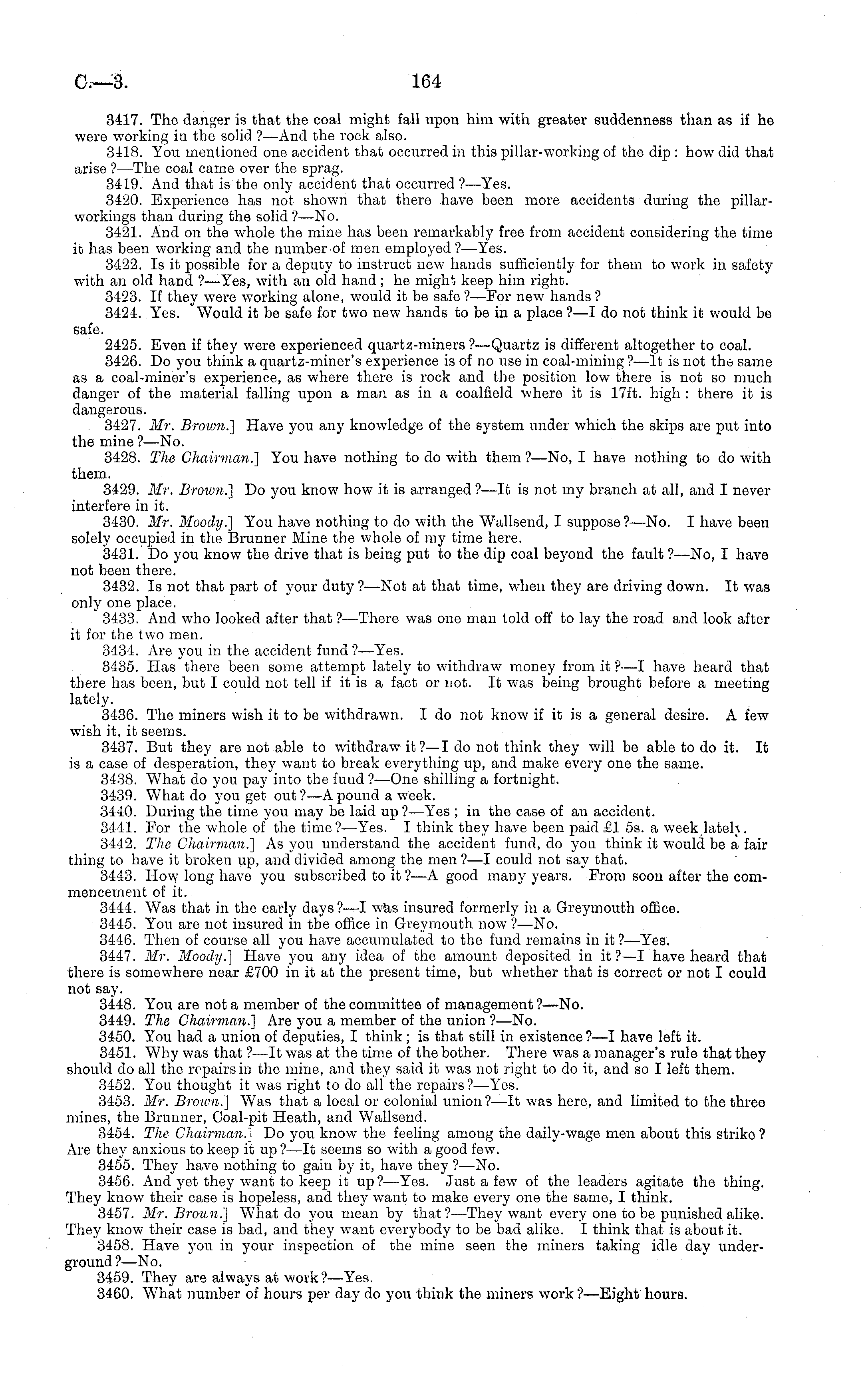 3417. The danger is that the coal might fall upon him with greater suddenness than as if he were working in the solid ?—And the rock also. 3418. You mentioned one accident that occurred in this pillar-working of the dip : how did that arise ? —The coal came over the sprag. 3419. And that is the only accident that occurred ?—Yes. 3420. Experience has not shown that there have been more accidents during the pillarworkings than during the solid ? —No. 3421. And on the whole the mine has been remarkably free from accident considering the time it has been working and the number of men employed ?—Yes. 3422. Is it possible for a deputy to instruct new hands sufficiently for them to work in safety with an old hand ?—Yes, with an old hand; he might keep him right. 3423. If they were working alone, would it be safe ?—For new hands ? 3424. Yes. Would it be safe for two new hands to be in a place ? —I do not think it would be safe. 2425. Even if they were experienced quartz-miners?— Quartz is different altogether to coal. 3426. Do you think a quartz-miner's experience is of no use in coal-mining ?—lt is not the same as a coal-miner's experience, as where there is rock and the position low there is not so much danger of the material falling upon a man as in a coalfield where it is 17ft. high : there it is dangerous. 3427. Mr. Brown.] Have you any knowledge of the system under which the skips are put into the mine ?—No. 3428. The Chairman.] You have nothing to do with them ?—No, I have nothing to do with them. 3429. Mr. Brown.] Do you know how it is arranged ?—lt is not my branch at all, and I never interfere in it. 3430. Mr. Moody.] You have nothing to do with the Wallsend, I suppose?— No. I have been solely occupied in the Brunner Mine the whole of my time here. 3431. Do you know the drive that is being put to the dip coal beyond the fault ?—No, I have not been there. 3432. Is not that part of your duty?— Not at that time, wdien they are driving down. It was only one place. 3433. And who looked after that ?—There w 7 as one man told off to lay the road and look after it for the two men. 3434. Are you in the accident fund ?—Yes. 3435. Has there been some attempt lately to withdraw money from it ? —I have heard that there has been, but I could not tell if it is a fact or not. It was being brought before a meeting lately. 3436. The miners wish it to be withdrawn. I do not know 7 if it is a general desire. A few wish it, it seems. 3437. But they are not able to withdraw it?—l do not think they will be able to do it. It is a case of desperation, they want to break everything up, and make every one the same. 3438. What do you pay into the fund ?—One shilling a fortnight. 3439. What do you get out ?—A pound a week. 3440. During the time you may be laid up ? —Yes ; in the case of an accident. 3441. For the whole of the time?— Yes. I think they have been paid £1 ss. a week latch . 3442. The Chairman.] As you understand the accident fund, do you think it would be a fair thing to have it broken up, and divided among the men ?—I could not say that. 3443. How long have you subscribed to it ? —A good many years. From soon after the commencement of it. 3444. Was that in the early days?—l was insured formerly in a Greymouth office. 3445. You are not insured in the office in Greymouth now ?—No. 3446. Then of course all you have accumulated to the fund remains in it ?—Yes. 3447. Mr. Moody.] Have you any idea of the amount deposited in it?—l have heard that there is somewhere near £700 in it at the present time, but whether that is correct or not I could not say. 3448. You are not a member of the committee of management?— No. 3449. The Chairman.] Are you a member of the union ?—No. 3450. You had a union of deputies, I think; is that still in existence ?—I have left it. 3451. Why was that ?—lt was at the time of the bother. There was a manager's rule that they should do all the repairs in the mine, and they said it was not right to do it, and so I left them. 3452. You thought it w 7 as right to do all the repairs?— Yes. 3453. Mr. Brown.] Was that a local or colonial union? —It was here, and limited to the three mines, the Brunner, Coal-pit Heath, and Wallsend. 3454. The Chairman.] Do you know the feeling among the daily-wage men about this strike ? Are they anxious to keep it up ?—lt seems so with a good few. 3455. They have nothing to gain by it, have they ?—No. 3456. And yet they want to keep it up ?—Yes. Just a few of the leaders agitate the thing. They know their case is hopeless, and they want to make every one the same, I think. 3457. Mr. Brown.] What do you mean by that?— They want every one to be punished alike. They know their case is bad, and they want everybody to be bad alike. I think that is about it. 3458. Have you in your inspection of the mine seen the miners taking idle day underground ?—No. 3459. They are always at work ?—Yes. 3460. What number of hours per day do you think the miners work ?—Eight hours.