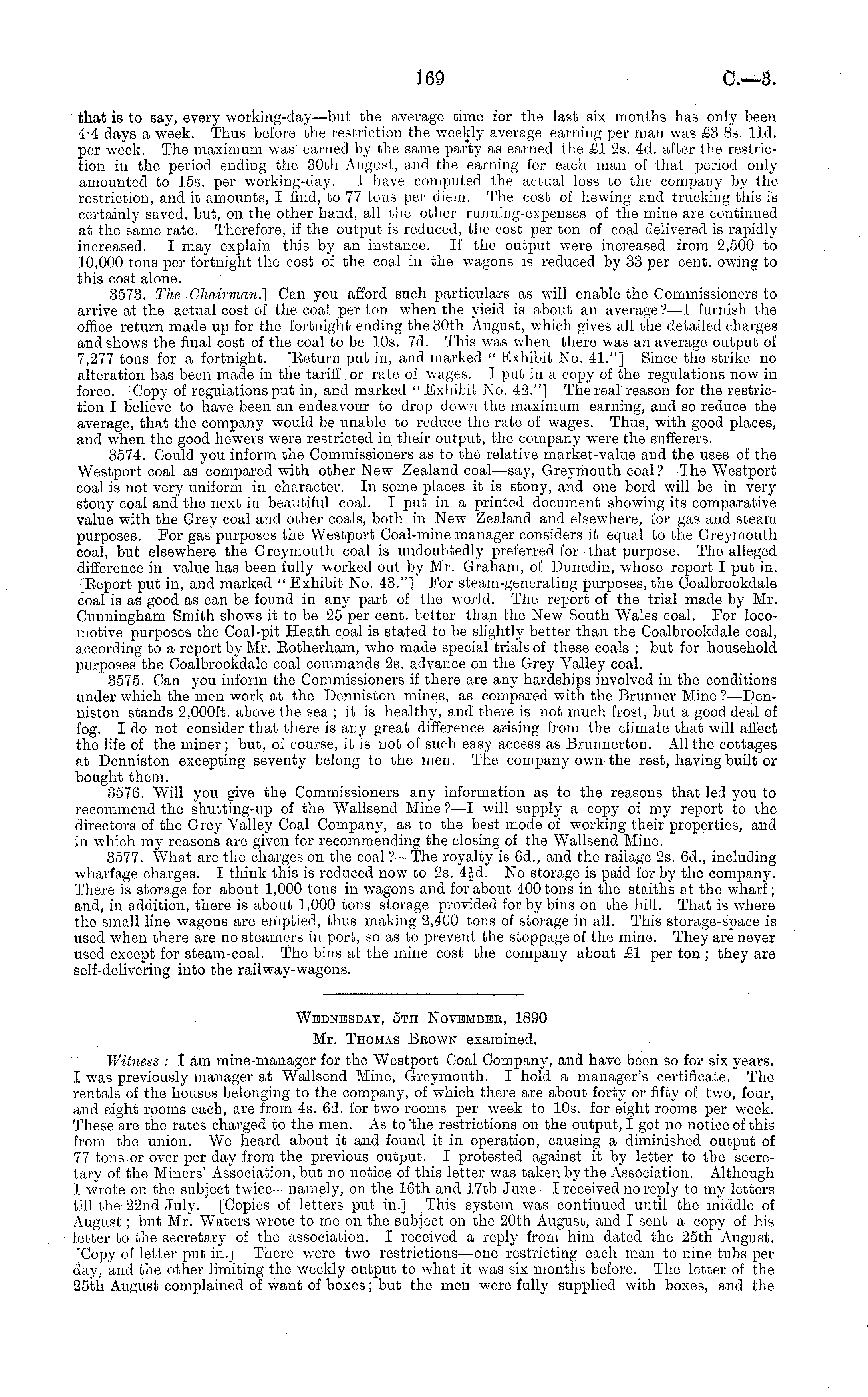 Wednesday, sth November, 1890 Mr. Thomas Brown examined. Witness : I am mine-manager for the Westport Coal Company, and have been so for six years. I was previously manager at Wallsend Mine, Greymouth. I hold a manager's certificate. The rentals of the houses belonging to the company, of which there are about forty or fifty of two, four, and eight rooms each, are from 4s. 6d. for two rooms per week to 10s. for eight rooms per week. These are the rates charged to the men. As to'the restrictions on the output, I got no notice of this from the union. We heard about it and found it in operation, causing a diminished output of 77 tons or over per day from the previous output. I protested against it by letter to the secretary of the Miners' Association, but no notice of this letter was taken by the Association. Although I wrote on the subject twice—namely, on the 16th and 17th June—l received no reply to my letters till the 22nd July. [Copies of letters put in.] This system was continued until the middle of August ; but Mr. Waters wrote to me on the subject on the 20th August, and I sent a copy of his letter to the secretary of the association. I received a reply from him dated the 25th August. [Copy of letter put in.] There were two restrictions—one restricting each man to nine tubs per day, and the other limiting the weekly output to what it was six months before. The letter of the 25th August complained of want of boxes; but the men were fully supplied with boxes, and the