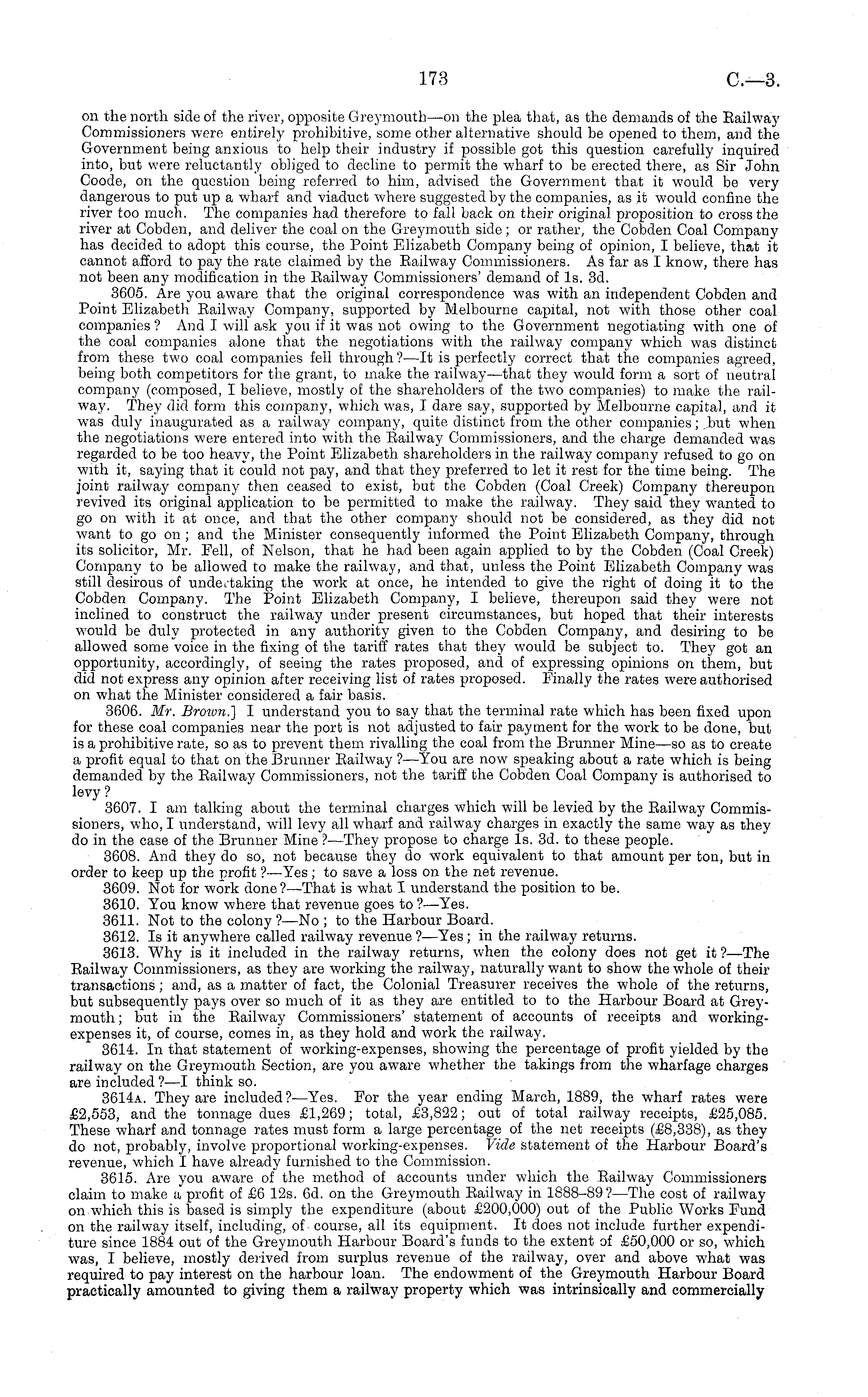 on the north side of the river, opposite Greymouth—on the plea that, as the demands of the Eailway Commissioners were entirely prohibitive, some other alternative should be opened to them, and the Government being anxious to help their industry if possible got this question carefully inquired into, but were reluctantly obliged to decline to permit the wharf to be erected there, as Sir John Coode, on the question being referred to him, advised the Government that it would be very dangerous to put up a wharf and viaduct where suggested by the companies, as it would confine the river too much. The companies had therefore to fall back on their original proposition to cross the river at Cobden, and deliver the coal on the Greymouth side; or rather, the Cobden Coal Company has decided to adopt this course, tho Point Elizabeth Company being of opinion, I believe, that it cannot afford to pay the rate claimed by the Eailway Commissioners. As far as I know, there has not been any modification in the Eailway Commissioners' demand of Is. 3d. 3605. Are you aware that the original correspondence was with an independent Cobden and Point Elizabeth Eailway Company, supported by Melbourne capital, not with those other coal companies ? And I will ask you if it was not owing to the Government negotiating with one of the coal companies alone that the negotiations with the railway company which was distinct from these two coal companies fell through?—lt is perfectly correct that the companies agreed, being both competitors for the grant, to make the railway—that they would form a sort of neutral company (composed, I believe, mostly of the shareholders of the two companies) to make the railway. They did form this company, which was, I dare say, supported by Melbourne capital, and it was duly inaugurated as a railway company, quite distinct from the other companies; but when the negotiations were entered into with the Eailway Commissioners, and the charge demanded was regarded to be too heavy, the Point Elizabeth shareholders in the railway company refused to go on wuth it, saying that it could not pay, and that they preferred to let it rest for the time being. The joint railw 7 ay company then ceased to exist, but the Cobden (Coal Creek) Company thereupon revived its original application to be permitted to make the railway. They said they w-anted to go on with it at once, and that the other company should not be considered, as they did not want to go on ; and the Minister consequently informed the Point Elizabeth Company, through its solicitor, Mr. Fell, of Nelson, that he had been again applied to by the Cobden (Coal Creek) Company to be allow 7 ed to make the railway, and that, unless the Point Elizabeth Company was still desirous of undertaking the work at once, he intended to give the right of doing it to the Cobden Company. The Point Elizabeth Company, I believe, thereupon said they were not inclined to construct the railway under present circumstances, but hoped that their interests would be duly protected in any authority given to the Cobden Company, and desiring to be allowed some voice in the fixing of the tariff rates that they 7 would be subject to. They got an opportunity, accordingly, of seeing the rates proposed, and of expressing opinions on them, but did not express any opinion after receiving list of rates proposed. Finally the rates were authorised on what the Minister considered a fair basis. 3606. Mr. Broivn.] I understand you to say that the terminal rate which has been fixed upon for these coal companies near the port is not adjusted to fair payment for the work to be done, but is a prohibitive rate, so as to prevent them rivalling the coal from the Brunner Mine—so as to create a profit equal to that on the Brunner Eailway ? —You are now speaking about a rate w 7 hich is being demanded by the Eailw 7 ay Commissioners, not the tariff the Cobden Coal Company is authorised to levy ? 3607. I am talking about the terminal charges which will be levied by the Eailway Commissioners, who, I understand, will levy all wharf and railway charges in exactly the same way as they do in the case of the Brunner Mine ?—They propose to charge Is. 3d. to these people. 3608. And they do so, not because they do work equivalent to that amount per ton, but in order to keep up the profit ? —Yes; to save a loss on the net revenue. 3609. Not for work done?— That is what I understand the position to be. 3610. You know where that revenue goes to ?—Yes. 3611. Not to the colony ? —No ; to the Harbour Board. 3612. Is it anywhere called railway revenue ?—Yes; in the railway returns. 3613. Why is it included in the railway returns, when the colony does not get it ?—The Eailway Commissioners, as they are working the railway, naturally want to show the whole of their transactions; and, as a matter of fact, the Colonial Treasurer receives the whole of the returns, but subsequently pays over so much of it as they are entitled to to the Harbour Board at Greymouth ; but in the Eailway Commissioners' statement of accounts of receipts and workingexpenses it, of course, comes in, as they hold and work the railway. 3614. In that statement of working-expenses, showing the percentage of profit yielded by the railway on the Greymouth Section, are you aware w 7 hether the takings from the wharfage charges are included?—l think so. 3614 a. They are included ? —Yes. For the year ending March, 1889, the wharf rates were £2,553, and the tonnage dues £1,269; total, £3,822; out of total railway receipts, £25,085. These wharf and tonnage rates must form a large percentage of the net receipts (£8,338), as they do not, probably, involve proportional working-expenses. Vide statement of the Harbour Board's revenue, which I have already furnished to the Commission. 3615. Are you aware of the method of accounts under which the Eailway Commissioners claim to make a profit of £6 12s. 6d. on the Greymouth Eailway in 1
