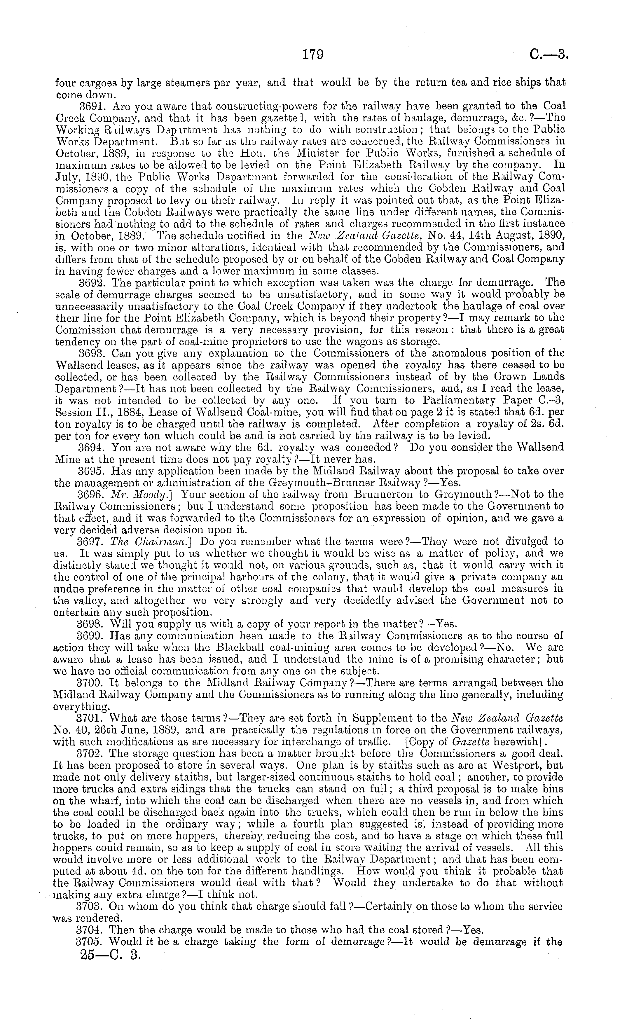 four cargoes by large steamers per year, and that would be by the return tea and rice ships that come down. 3691. Are you aware that constructing-powers for the railway have been granted to the Coal Creek Company, and that it has been gazetted, with the rates of haulage, demurrage, &c. ?—The Working Railways Department has nothing to do with construction; that belongs to the Public Works Department. But so far as the railway rates are concerned, the Brilway Commissioners in October, 1889, in response to the Hon. the Minister for Public Works, furnished a schedule of maximum rates to be allowed to be levied on the Point Elizabeth Eailway by the company. In July, 1890, the Public Works Department forwarded for the consideration of the Eailway Commissioners a copy of the schedule of the maximum rates which the Cobden Eailway and Coal Company proposed to levy on their railway. In reply it was pointed out that, as the Point Elizabeth and the Cobden Eailways were practically the same line under different names, the Commissioners had nothing to add to the schedule of rates and charges recommended in the first instance in October, 1889. The schedule notified in the New Zealand Gazette, No. 44, 14th August, 1890, is, with one or two minor alterations, identical with that recommended by the Commissioners, and differs from that of the schedule proposed by or on behalf of the Cobden Eailway and Coal Company in having fewer charges and a lower maximum in some classes. 3692. The particular point to which exception was taken was the charge for demurrage. The scale of demurrage charges seemed to be unsatisfactory, and in some way it would probably be unnecessarily unsatisfactory to the Coal Creek Company if they undertook the haulage of coal over their line for the Point Elizabeth Company, which is beyond their property?—l may remark to the Commission that demurrage is a very necessary provision, for this reason : that there is a great tendency on the part of coal-mine proprietors to use the wagons as storage. 3693. Can you give any explanation to the Commissioners of the anomalous position of the Wallsend leases, as it appears since the railway was opened the royalty has there ceased to be collected, or has been collected by the Eailway Commissioners instead of by the Crown Lands Department ?—lt has not been collected by the Eailway Commissioners, and, as I read the lease, it was not intended to be collected by any one. If you turn to Parliamentary Paper C.-3, Session 11., 1884, Lease of Wallsend Coal-mine, you will find that on page 2 it is stated that 6d. per ton royalty is to be charged until the railway is completed. After completion a royalty of 2s. 6d. per ton for every ton which could be and is not carried by the railway is to be levied. 3694. You are not aware why the 6d. royalty was conceded? Do you consider the Wallsend Mine at the present time does not pay royalty ?—lt never has. 3695. Has any application been made by the Midland Railway about the proposal to take over the management or administration of the Greymouth-Brunner Eailway?—Yes. 3696. Mr. Moody.] Your section of the railway from Brunnerton to Greymouth?—Not to the Eailway Commissioners; but I understand some proposition has been made to the Government to that effect, and it was forwarded to the Commissioners for an expression of opinion, and we gave a very decided adverse decision upon it. 3697. The Chairman.] Do you remember what the terms were ? —They were not divulged to us. It was simply put to us whether we thought it would be wise as a matter of policy, and we distinctly stated w 7 e thought it would not, on various grounds, such as, that it would carry with it the control of one of the principal harbours of the colony, that it would give a private company an undue preference in the matter of other coal companies that would develop the coal measures in the valley, and altogether we very strongly and very decidedly advised the Government not to entertain any such proposition. 3698. Will you supply us with a copy of your report in the matter? —Yes, 3699. Has any communication been made to the Eailway Commissioners as to the course of action they will take when the Blackball coal-mining area comes to be developed?— No. We are aware that a lease has been issued, and I understand the mine is of a promising character; but we have no official communication from any one on the subject. 3700. It belongs to the Midland Eailway Company ? —There are terms arranged between the Midland Eailway Company and the Commissioners as to running along the line generally, including everything. 3701. What are those terms?— They are set forth in Supplement to the New Zealand Gazette No. 40, 26th June, 1889, and are practically the regulations in force on the Government railways, with such modifications as are necessary for interchange of traffic. [Copy of Gazette herewith!. 3702. The storage question has been a matter brought before the Commissioners a good deal. It has been proposed to store in several ways. One plan is by staiths such as are at Westport, but made not only delivery staiths, but larger-sized continuous staiths to hold coal; another, to provide more trucks and extra sidings that the trucks can stand on full; a third proposal is to make bins on the wharf, into which the coal can be discharged when there are no vessels in, and from which the coal could be discharged back again into the trucks, which could then be run in below the bins to be loaded in the ordinary way; while a fourth plan suggested is, instead of providing more trucks, to put on more hoppers, thereby reducing the cost, and to have a stage on which these full hoppers could remain, so as to keep a supply of coal in store waiting the arrival of vessels. All this would involve more or less additional work to the Eailway Department; and that has been computed at about 4d. on the ton for the different handlings. How would you think it probable that the Ea