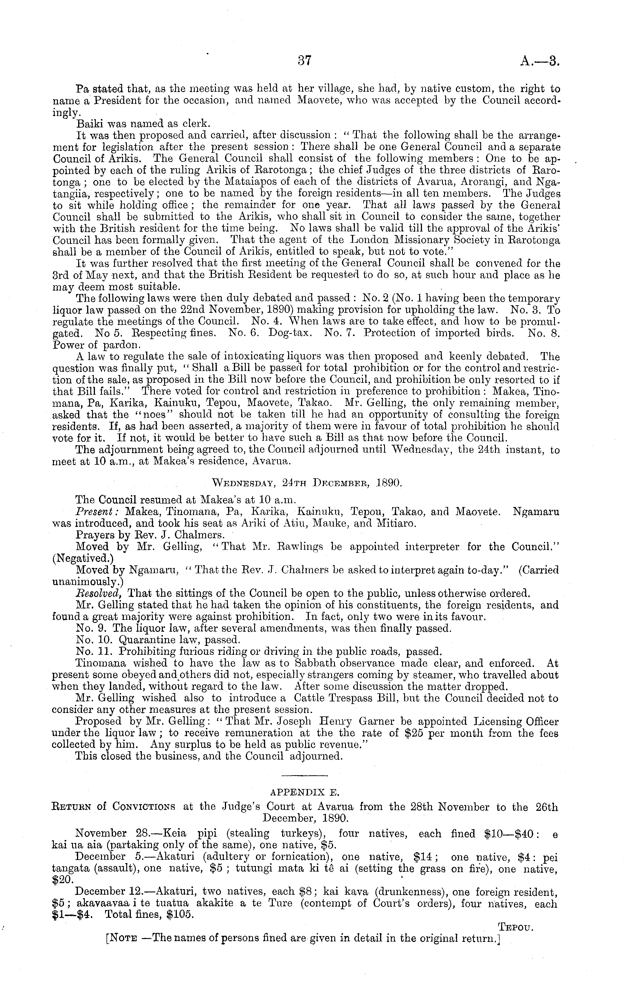 Pa stated that, as the meeting was held at her village, she had, by native custom, the right to name a President for the occasion, and named Maovete, who was accepted by the Council accordingly. Baiki was named as clerk. It was then proposed and carried, after discussion : " That the following shall be the arrangement for legislation after the present session : There shall be one General Council and a separate Council of Arikis. The General Council shall consist of the following members : One to be appointed by each of the ruling Arikis of Barotonga ; the chief Judges of the three districts of Barotonga ; one to be elected by the Mataiapos of each of the districts of Avarua, Arorangi, and Ngatangiia, respectively; one to be named by the foreign residents—in all ten members. The Judges to sit while holding office ; the remainder for one year. That all laws passed by the General Council shall be submitted to the Arikis, who shall sit in Council to consider the same, together w T ith the British resident for the time being. No laws shall be valid till the approval of the Arikis' Council has been formally given. That the agent of the London Missionary Society in Earotonga shall be a member of the Council of Arikis, entitled to speak, but not to vote." It was further resolved that the first meeting of the General Council shall be convened for the 3rd of May next, and that the British Eesident be requested to do so, at such hour and place as lie may deem most suitable. The following laws were then duly debated and passed : No. 2 (No. 1 having been the temporary liquor law passed on the 22nd November, 1890) making provision for upholding the law. No. 3. To regulate the meetings of the Council. No. 4. When laws are to take effect, and how to be promulgated. No 5. Respecting fines. No. 6. Dog-tax. No. 7. Protection of imported birds. No. 8. Power of pardon. A law to regulate the sale of intoxicating liquors was then proposed and keenly debated. The question was finally put, " Shall a Bill be passed for total prohibition or for the control and restriction of the sale, as proposed in the Bill now before the Council, and prohibition be only resorted to if that Bill fails." There voted for control and restriction in preference to prohibition : Makea, Tinomana, Pa, Karika, Kainuku, Tepou, Maovete, Takao. Mr. Gelling, the only remaining member, asked that the "noes" should not be taken till he had an opportunity of consulting the foreign residents. If, as had been asserted, a majority of them were in favour of total prohibition he should vote for it. If not, it would be better to have such a Bill as that now before the Council. The adjournment being agreed to, the Council adjourned until Wednesday, the 24th instant, to meet at 10 a.m., at Makea's residence, Avarua. Wednesday, 24th December, 1890. The Council resumed at Makea's at 10 a.m. Present: Makea, Tinomana, Pa, Karika, Kainuku, Tepou, Takao, and Maovete. Ngamaru was introduced, and took his seat as Ariki of Atiu, Mauke, and Mitiaro. Prayers by Eev. J. Chalmers. Moved by Mr. Gelling, "That Mr. Eawlings be appointed interpreter for the Council." (Negatived.) Moved by Ngamaru, " That the Rev. J. Chalmers be asked to interpret again to-day." (Carried unanimously.) Besolved, That the sittings of the Council be open to the public, unless otherwise ordered. Mr. Gelling stated that he had taken the opinion of his constituents, the foreign residents, and found a great majority were against prohibition. In fact, only two were in its favour. No. 9. The liquor law, after several amendments, was then finally passed. No. 10. Quarantine law 7 , passed. No. 11. Prohibiting furious riding or driving in the public roads, passed. Tinomana wished to have the law as to Sabbath observance made clear, and enforced. At present some obeyedandothers did not, especially strangers coming by steamer, who travelled about when they landed, without regard to the law. After some discussion the matter dropped. Mr. Gelling wished also to introduce a Cattle Trespass Bill, but the Council decided not to consider any other measures at the present session. Proposed by Mr. Gelling: " That Mr. Joseph Henry Garner be appointed Licensing Officer under the liquor law; to receive remuneration at the the rate of $25 per month from the fees collected by him. Any surplus to be held as public revenue." This closed the business, and the Council adjourned.